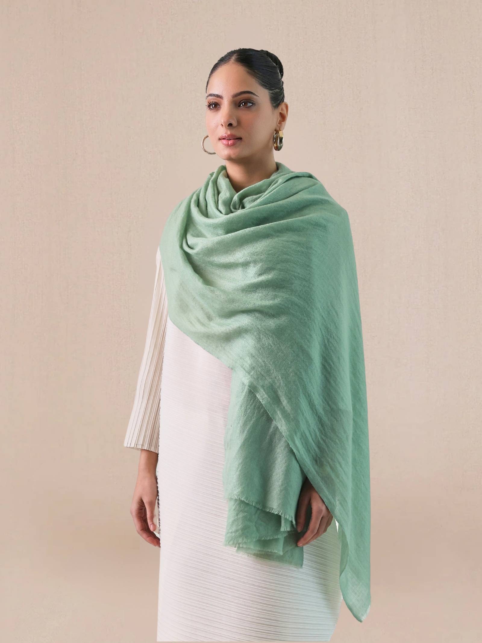 Made in soft, premium cashmere, the Gazala Cashmere Shawl in a sage sage green hue offers a blend of elegance and comfort. The clean, solid design effortlessly complements multiple outfits, making it a versatile accessory for both casual and formal gatherings.