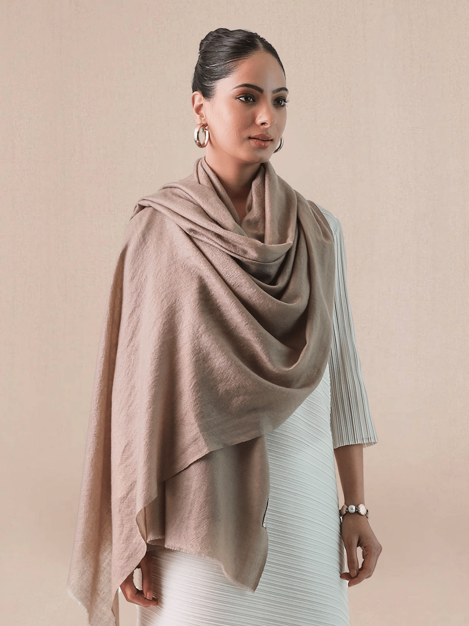 Our Gazala Cashmere Shawl is made from the finest cashmere in a rich light brown hue, combines style with cozy comfort. The solid design makes it an ideal accessory for casual affairs, formal gatherings & travels.