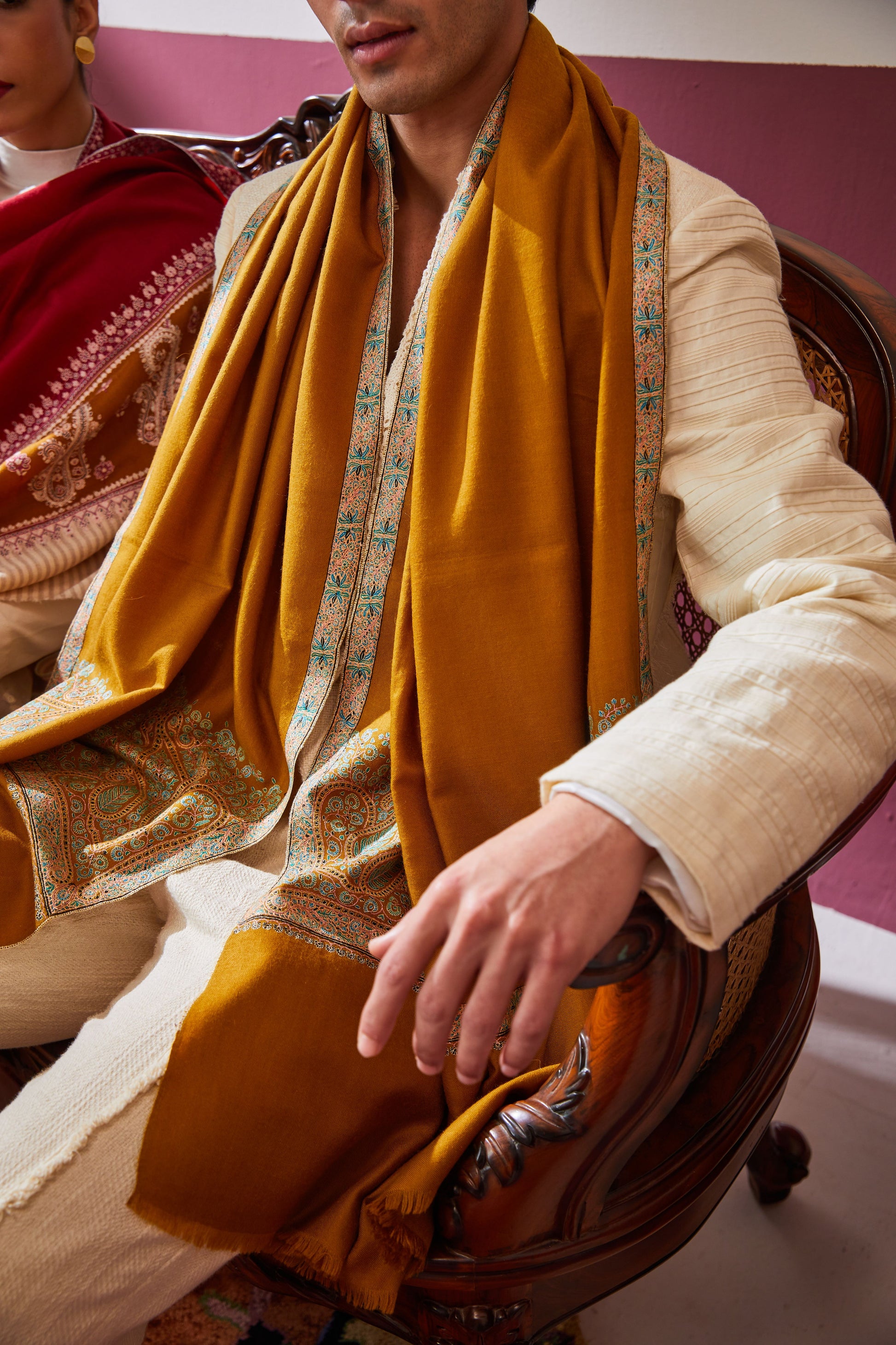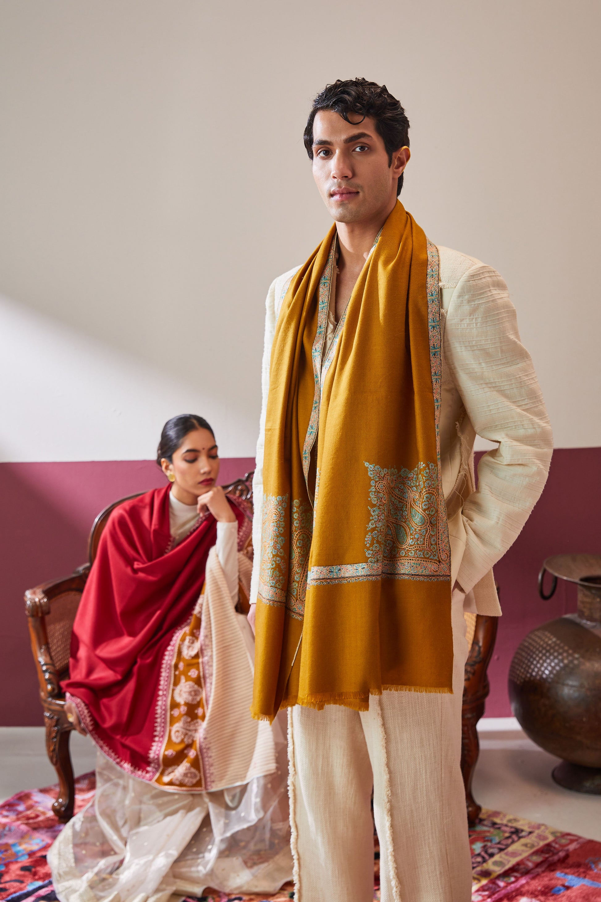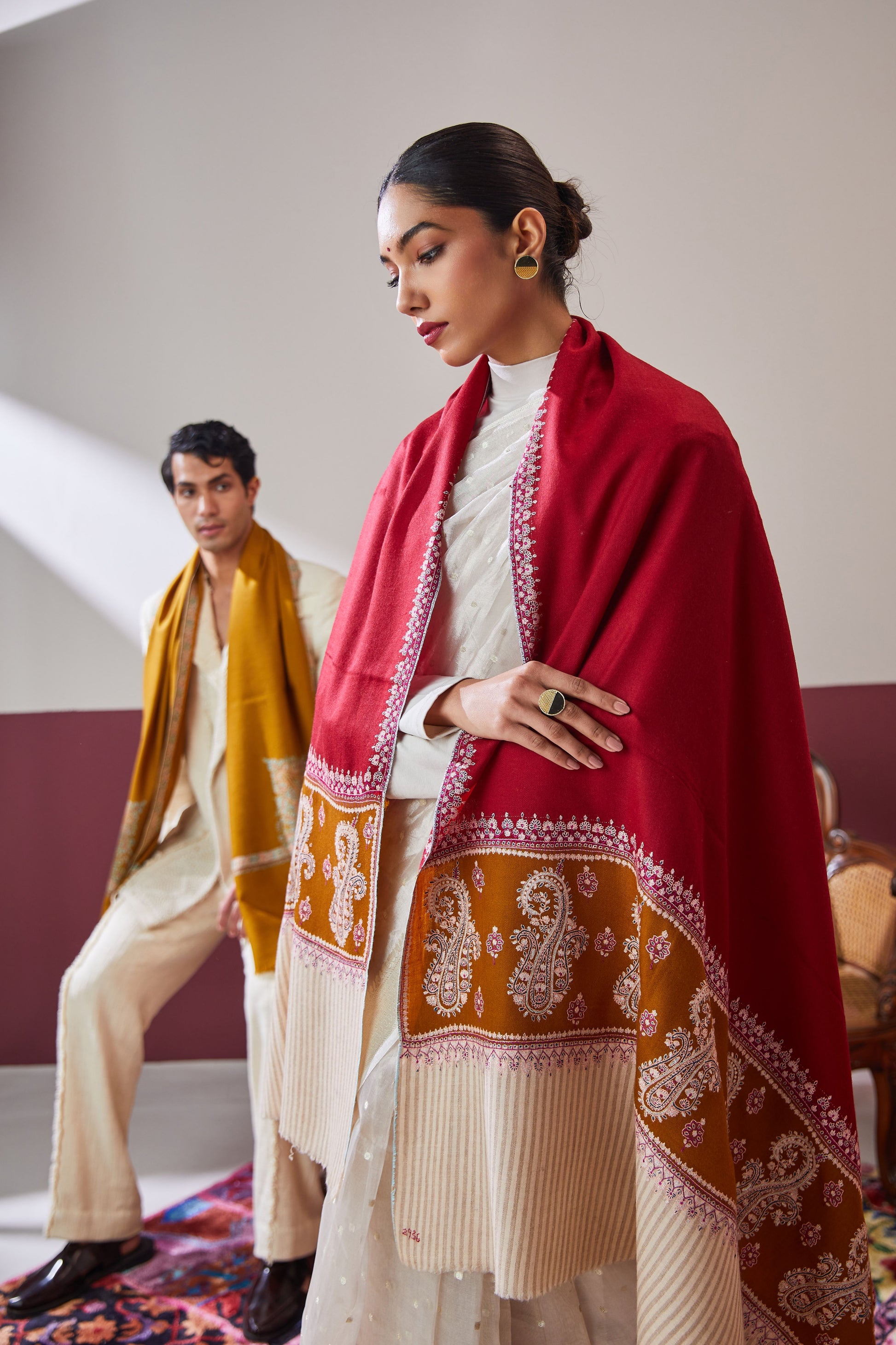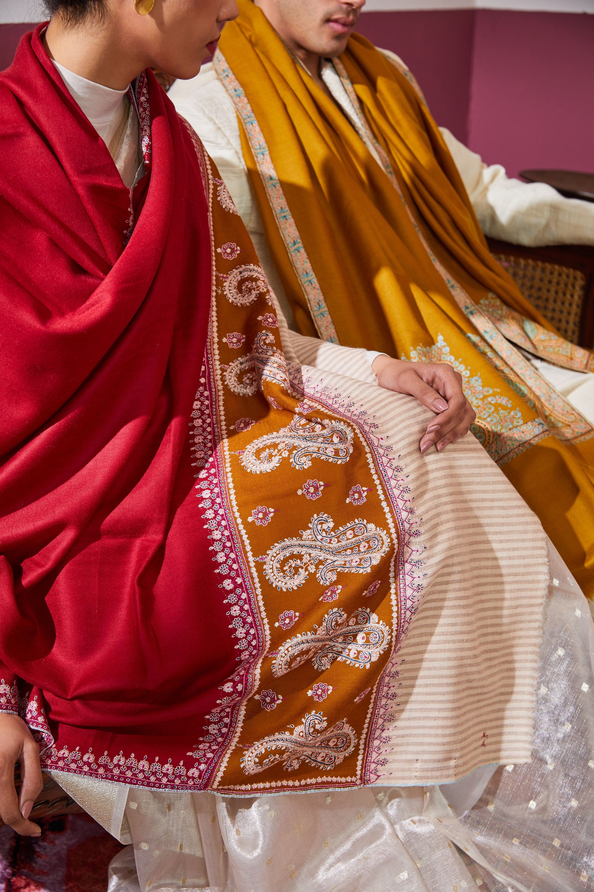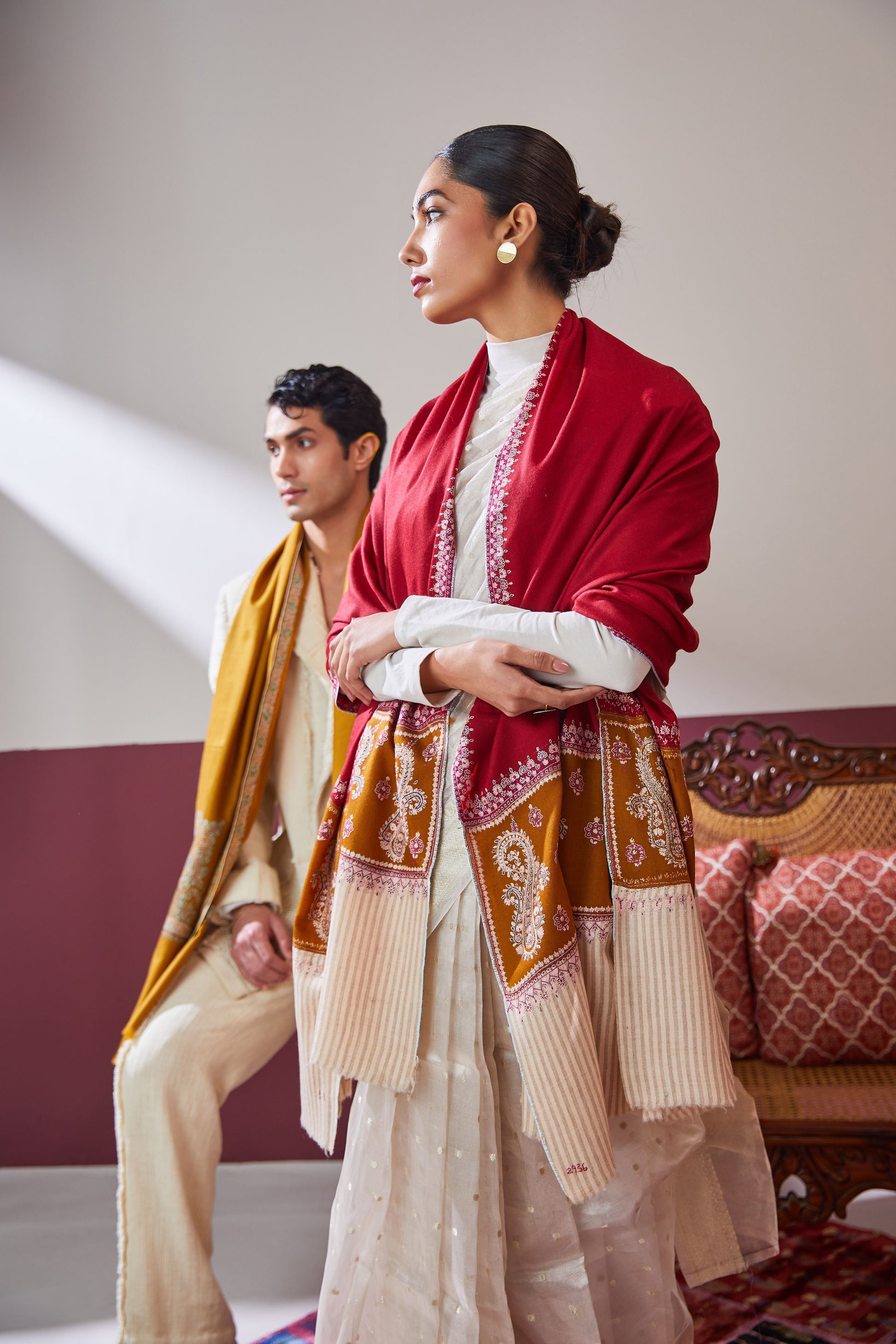 Handwoven from the same loom, this couple’s Pashmina shawl set features Hashi and Paisley stripes in rich red and mustard. Artistically paired and timeless, both His and Her pieces are available—perfect for meaningful gifting.