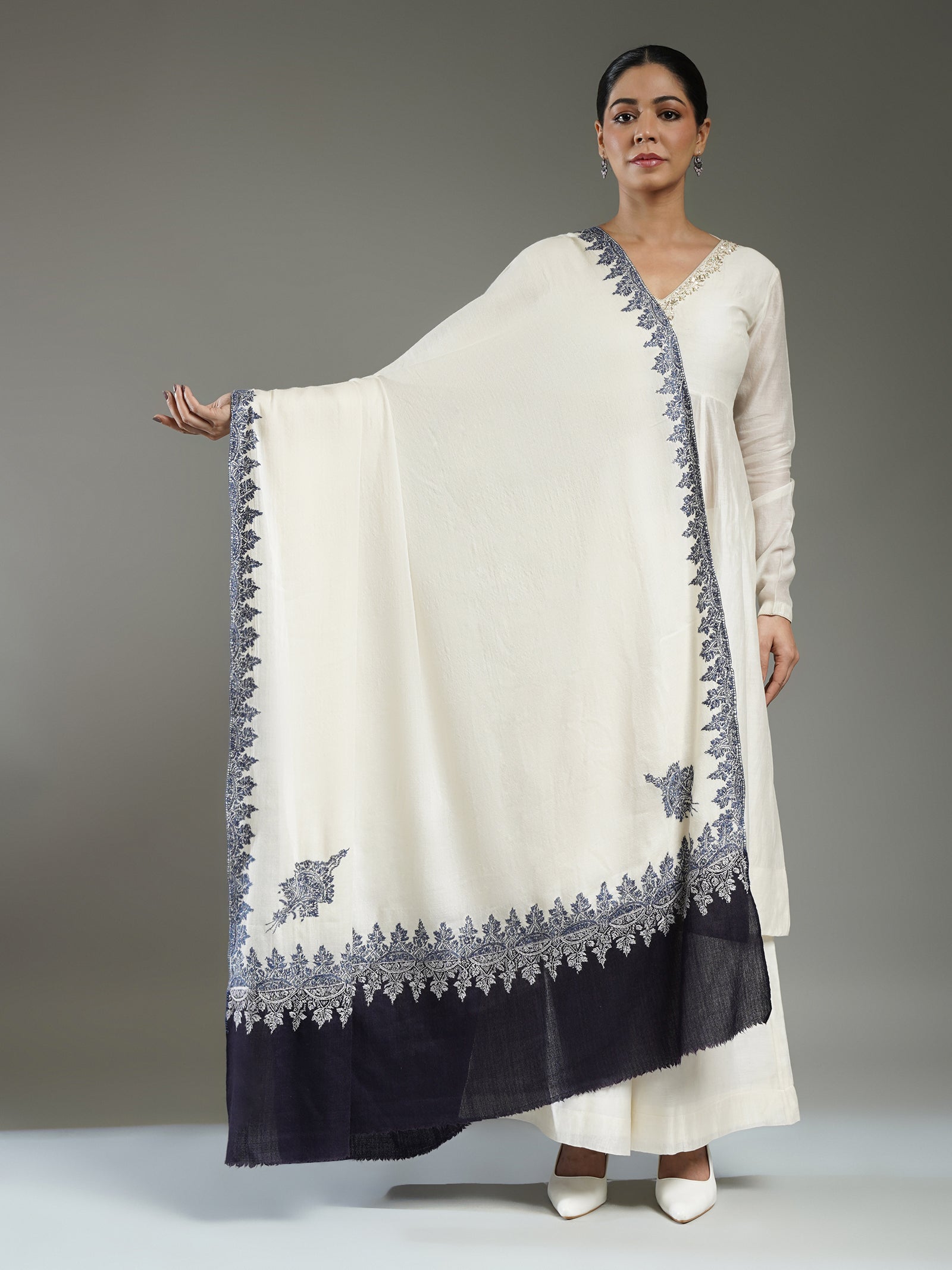 In a graceful harmony of soft ivory and deep blue, this fine cashmere shawl captures an air of refined luxury. Its statement border, rich with intricate, needlework floral embroidery, adds depth, artistry, and a beautifully structured finish. Feather-light yet warmly cocooning, it drapes with effortless poise, making it an ideal choice for styling, travel ease, and elevated dressing