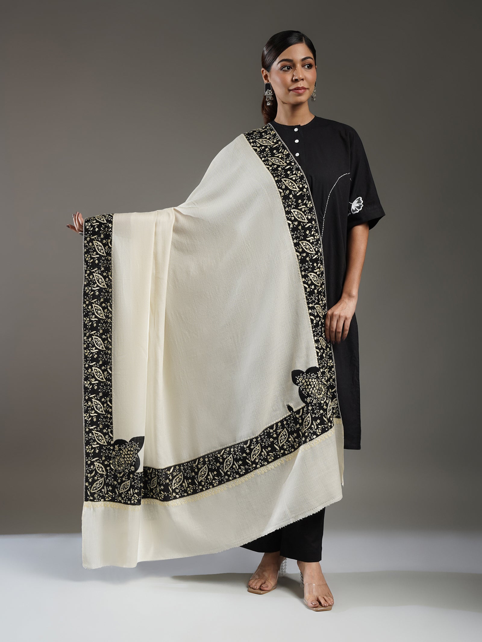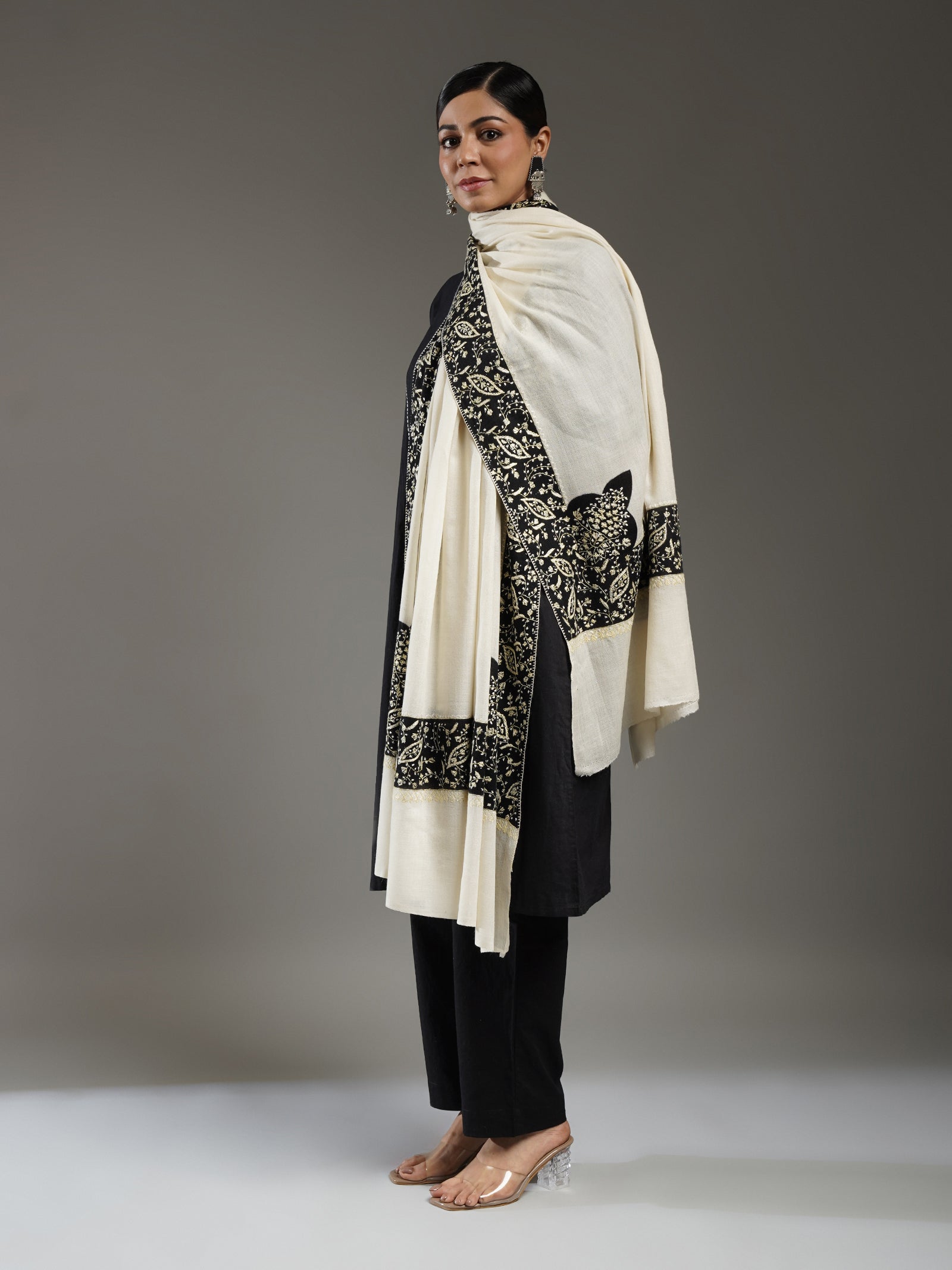 Set in a classic palette of soft ivory and classic black, this fine cashmere shawl features a richly worked border, brought to life with intricate needle-embroidered florals, which adds a striking, artful edge to the understated base. Supremely soft, beautifully & warm, it offers an elevated look that transitions seamlessly from daily dressing to special occasions, making it an effortlessly elegant style companion.