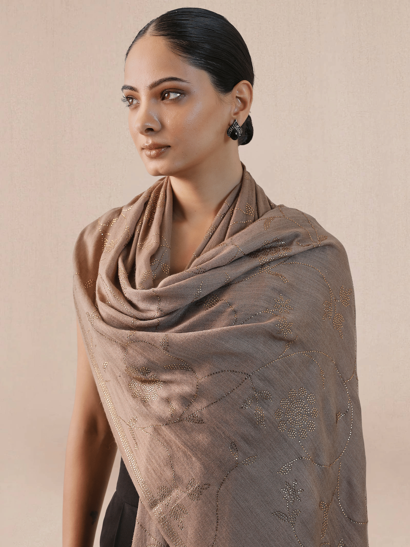 The Efat Era of Zaywar Jaal Stole, in latte beige hue, is crafted from the finest wool. Its graceful design features intricate hand-embellished Swarovski detailing, showcasing delicate Bel patterns of flowers and paisleys. It comes wi with a Swarovski border, this stole is a statement piece for any occasion.