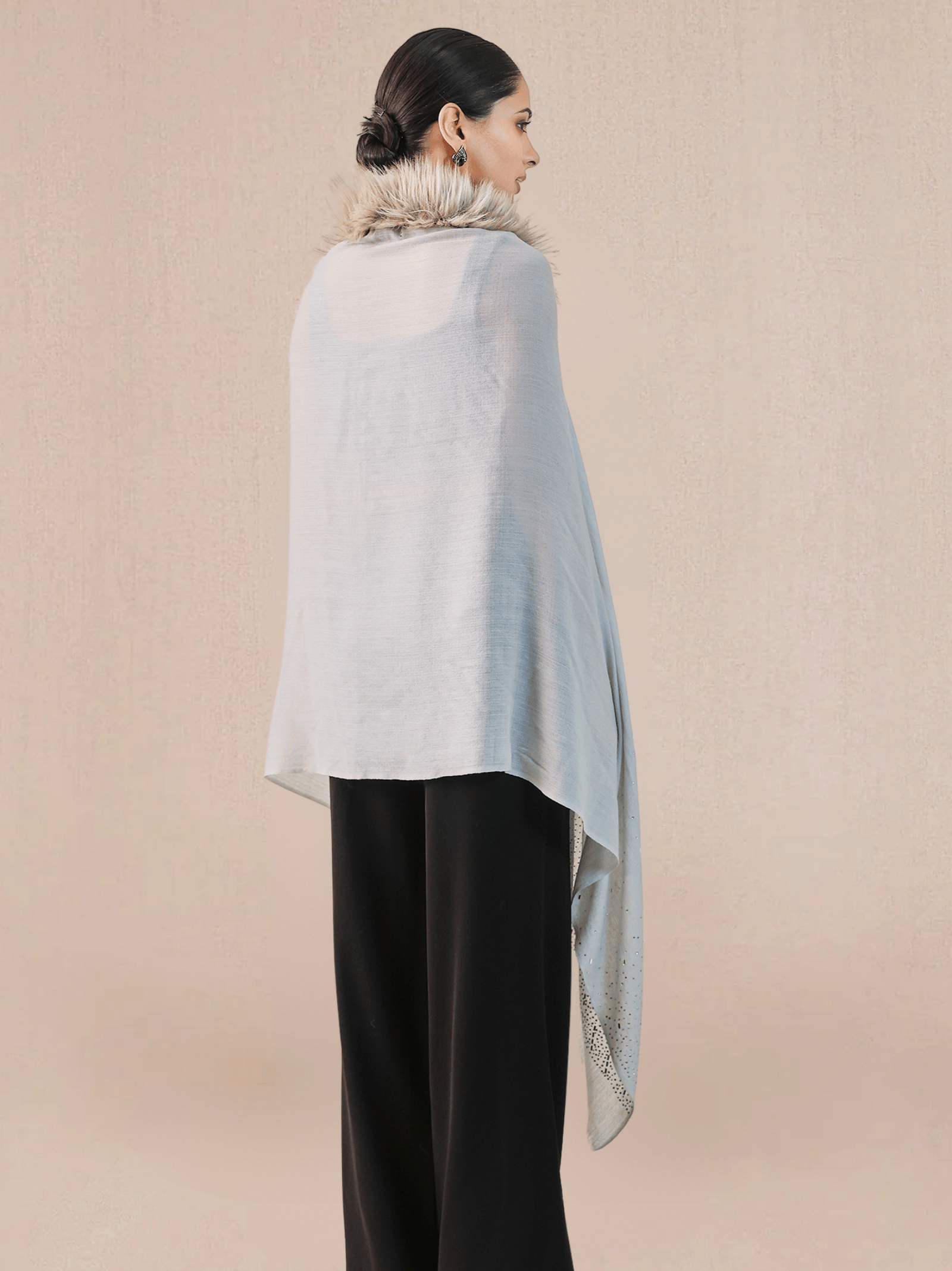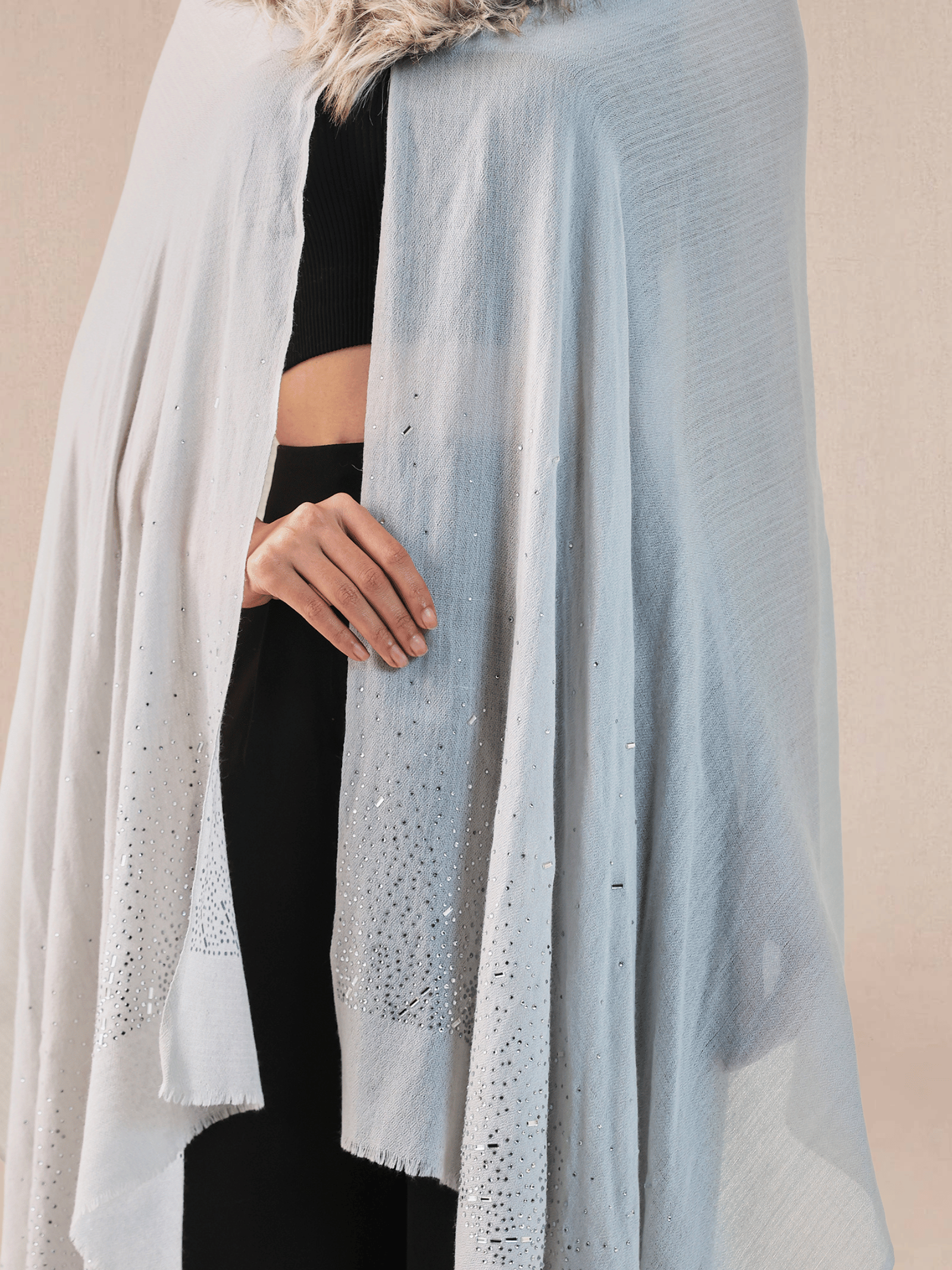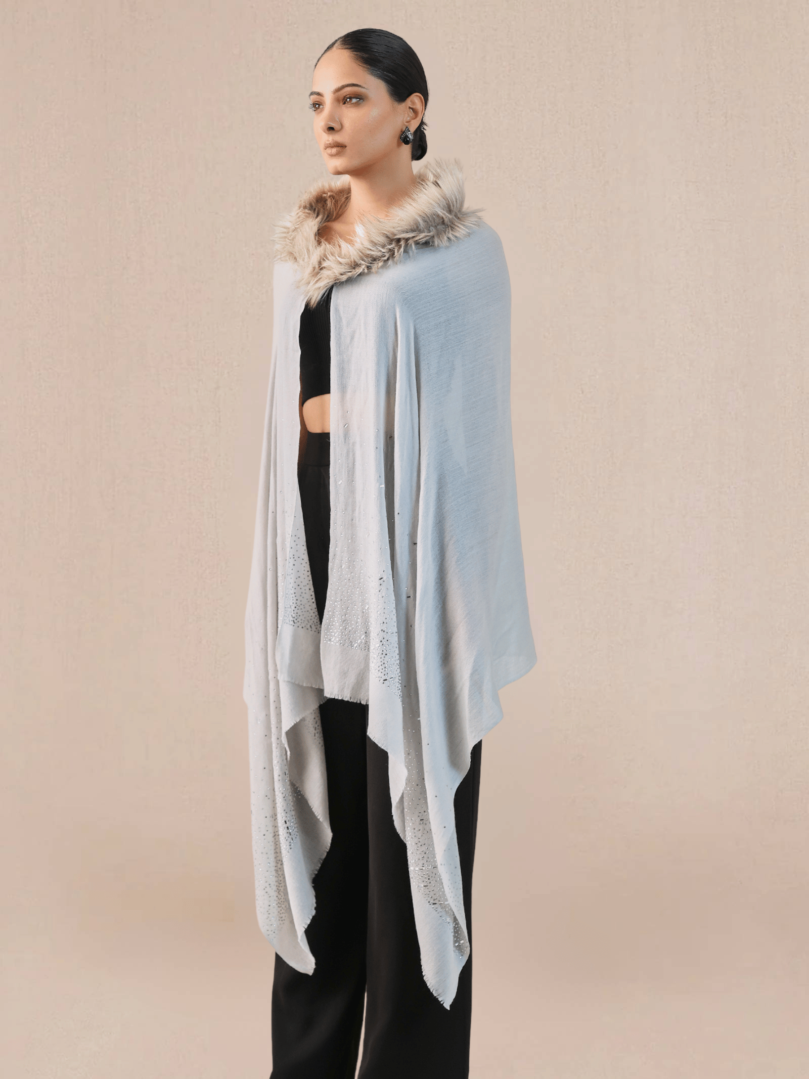 The Fiona Fur Cashmere Cape, in a soothing light grey shade, is a cozy and winter essential crafted from premium cashmere. Featuring a fur collar and hand-embellished silver Swarovski in a scattered design, it adds elegance to various special occasion ensembles.