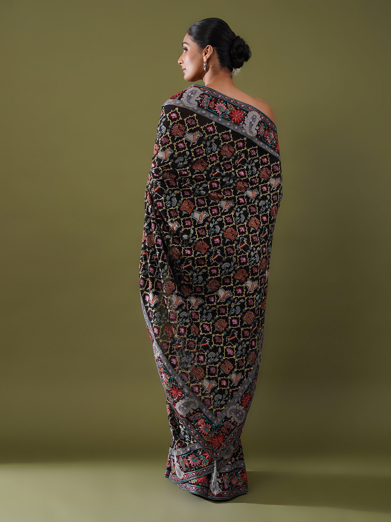 In a striking shade of black, this fully hand-embroidered saree celebrates the finest of Indian craftsmanship. A dense multicoloured floral jaali spreads gracefully across the drape, framed by a detailed border of flowers and classic ambi motifs. Crafted from pure high-grade georgette, it falls with an elegant, fluid ease. A true masterpiece, breathtakingly beautiful, effortlessly classy, and a timeless style statement. Finished with meticulous artistry, it exudes a rare heirloom allure.