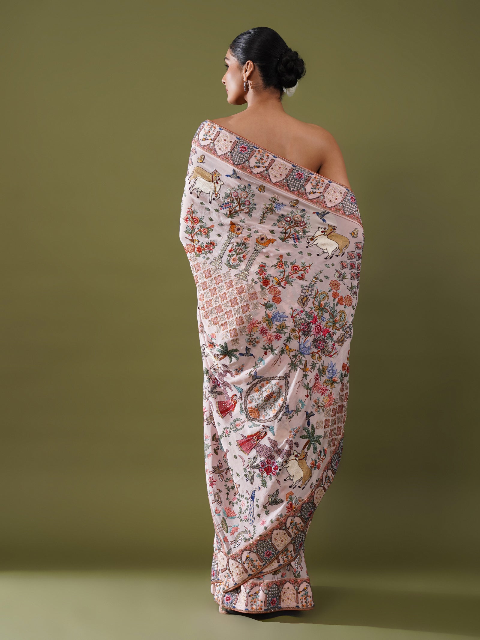 Inspired by the Pichwai art, this saree is a canvas of intricate handwork in beads and threads, bringing to life serene scenes of cows, village folk, and delicate flora and fauna resembling the times of Krishna at Vrindavan. The storytelling continues into a richly crafted jharokha border, adding depth and character. Set in a soft baby-pink pure georgette, every inch is hand-embroidered with devotion and finesse. Timeless, heritage-rich, and graceful, it’s a true piece of wearable art that turns every moment into a masterpiece.