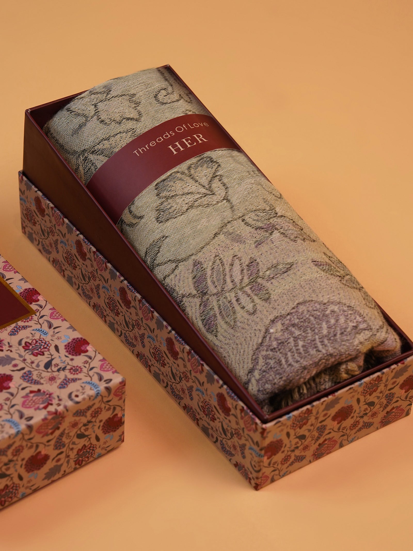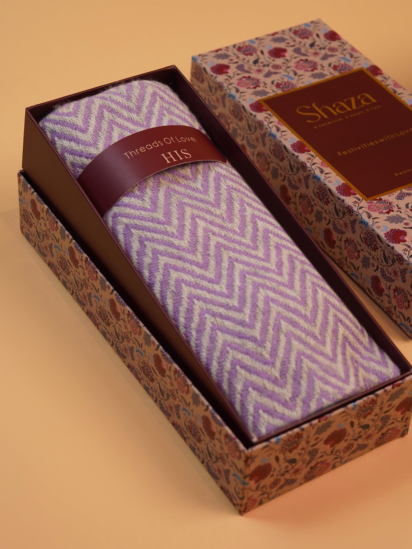 This thoughtfully curated gift box brings together a fine-count wool muffler in a soft lavender herringbone weave, paired with a richly crafted woollen muffler in a kani pattern of sage green with lavender. Subtle yet distinctive, the duo balances gentle colour with artisanal depth, offering warmth, character, and timeless appeal. An elegant composition designed for refined winter layering and elevated gifting.