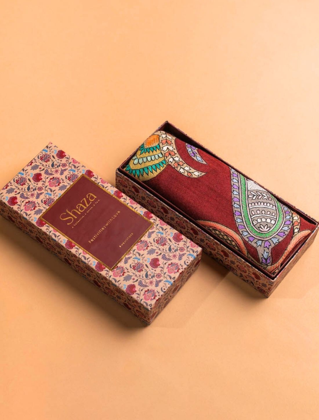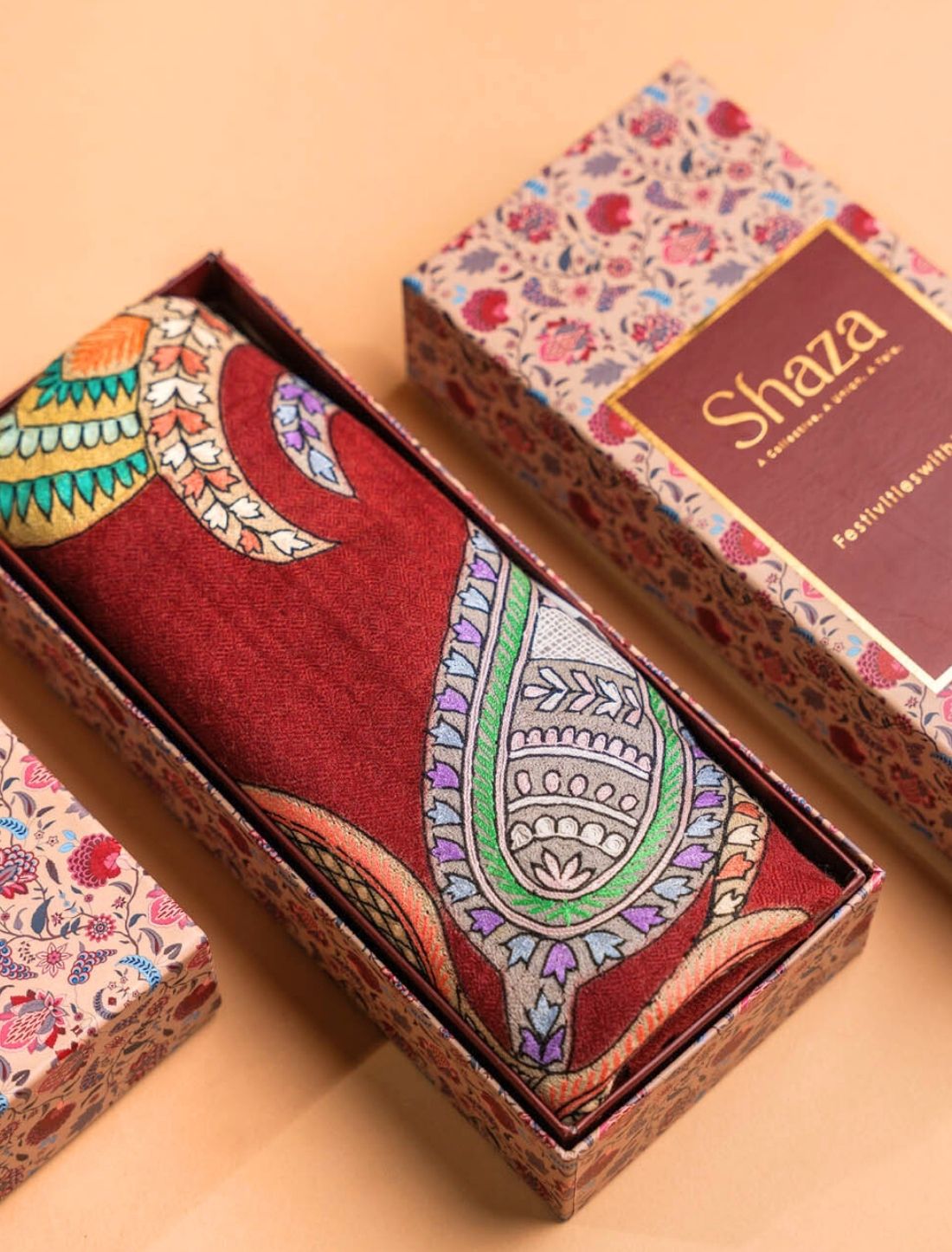 This hand-painted and embroidered stole showcases the heritage reinterpreted for the modern world. Every detail reflects the meticulous craft, while its lightweight, versatile design makes it effortless to wear. Elegantly packed in our luxurious box, it is a refined gift that combines tradition, artistry, and contemporary charm.