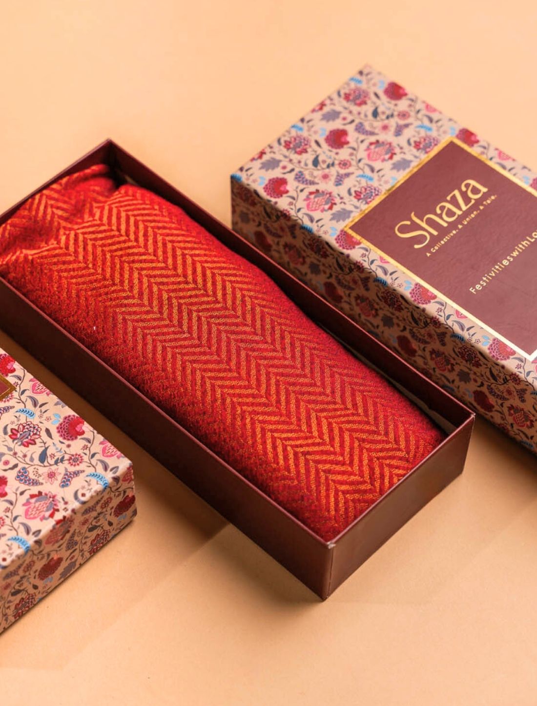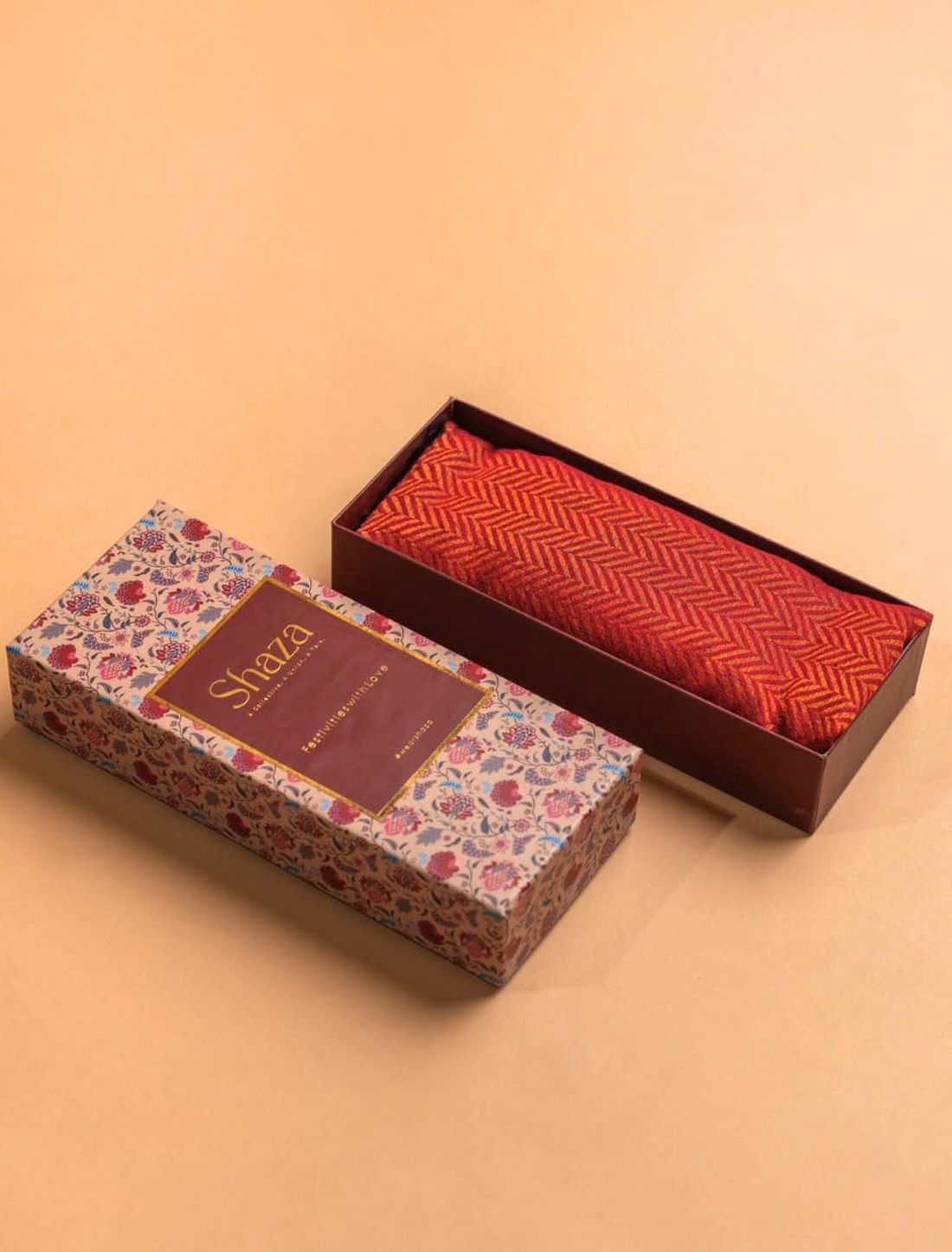Subtle yet striking, this zari stole in a herringbone weave combines refined texture with delicate shimmer. Lightweight, versatile, and effortlessly elegant, it is thoughtfully presented in our signature box of elegance—a perfect accessory for both everyday wear and festive occasions.