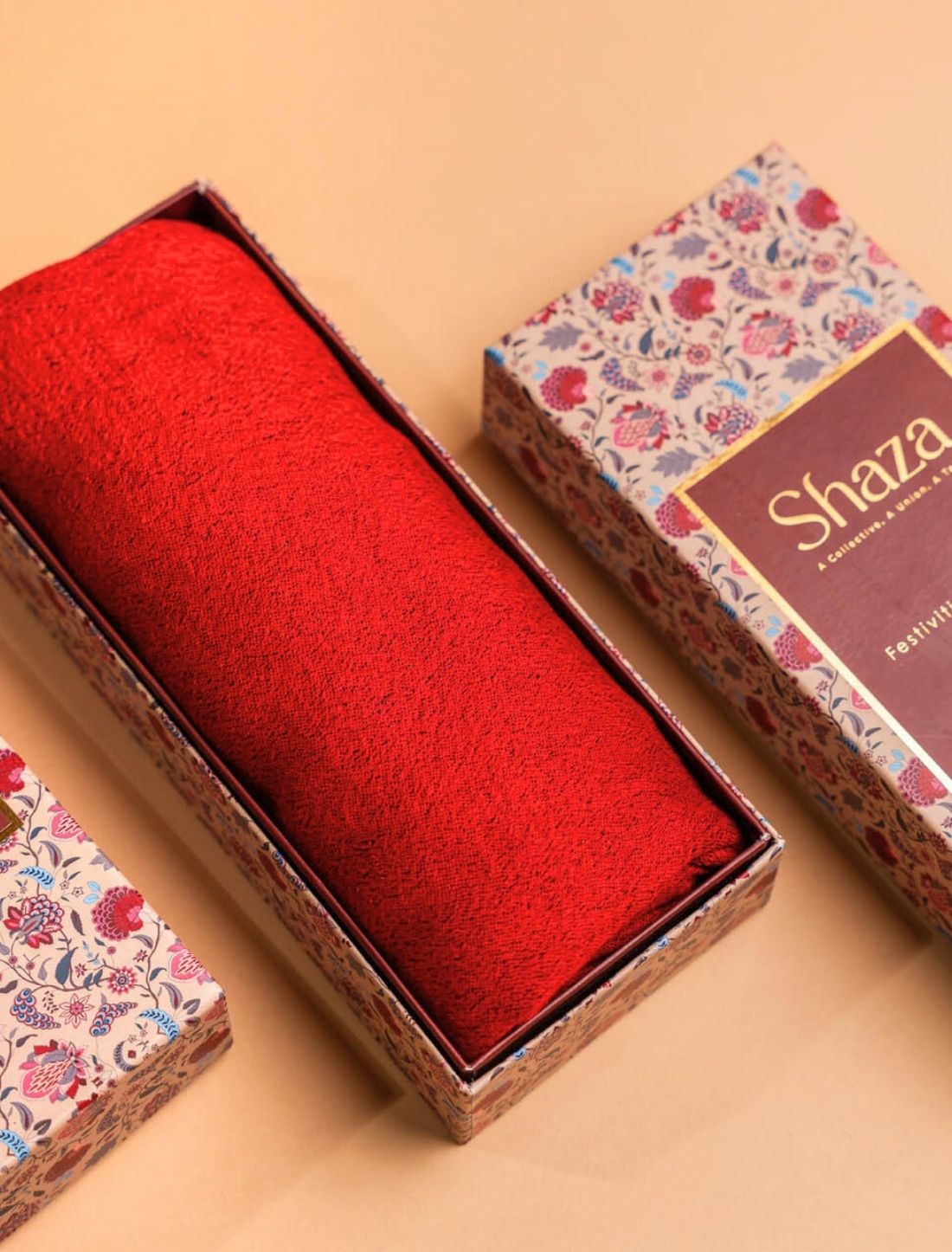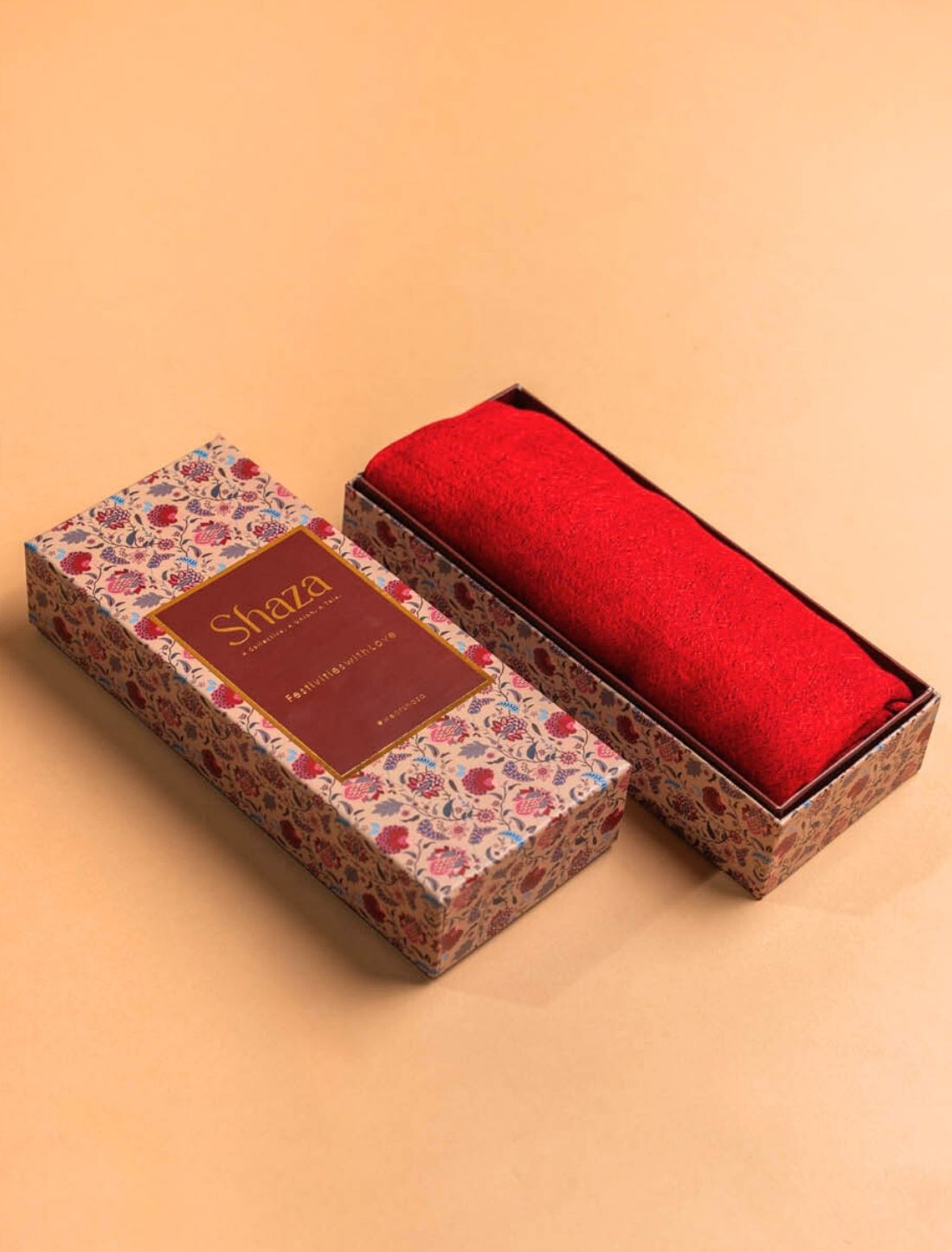 Presented in a luxurious box, this wool stole reveals a delicate play of texture and shimmer with zari woven seamlessly into its fabric. A graceful blend of festive charm and contemporary ease, it is crafted as a timeless piece for both special and everyday moments.