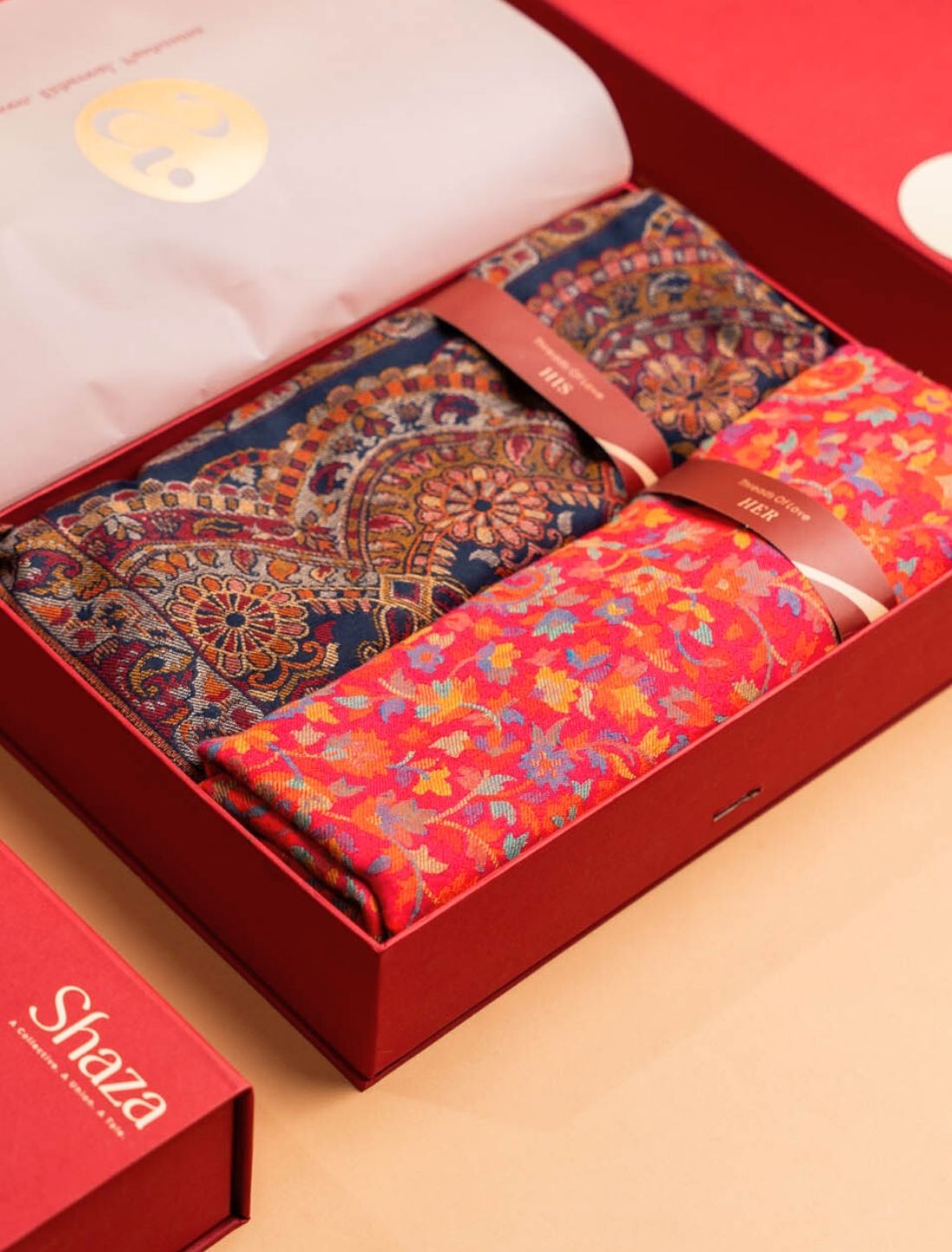 Made for those who value artistry and craft, this set features two Antique Wool Kani shawls in vivid multicolours, woven with great precision. Distinguished and versatile, it is more than a pairing of shawls; it is a thoughtful gesture of classic style and cultural grace.