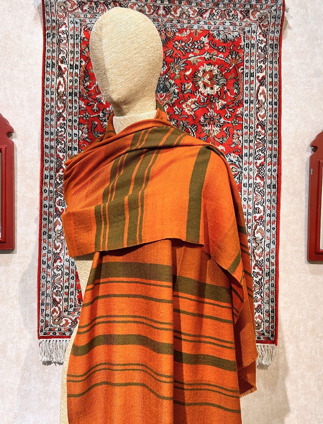This set reimagines tradition through vibrant contrasts of colours through a Pashmina stole in orange and green checks and stripes, paired with an earthy-toned Ekkat shawl in green and brown. Elegant in texture and rich in craftsmanship, it makes for a distinguished gift that celebrates artisanal beauty with enduring charm.