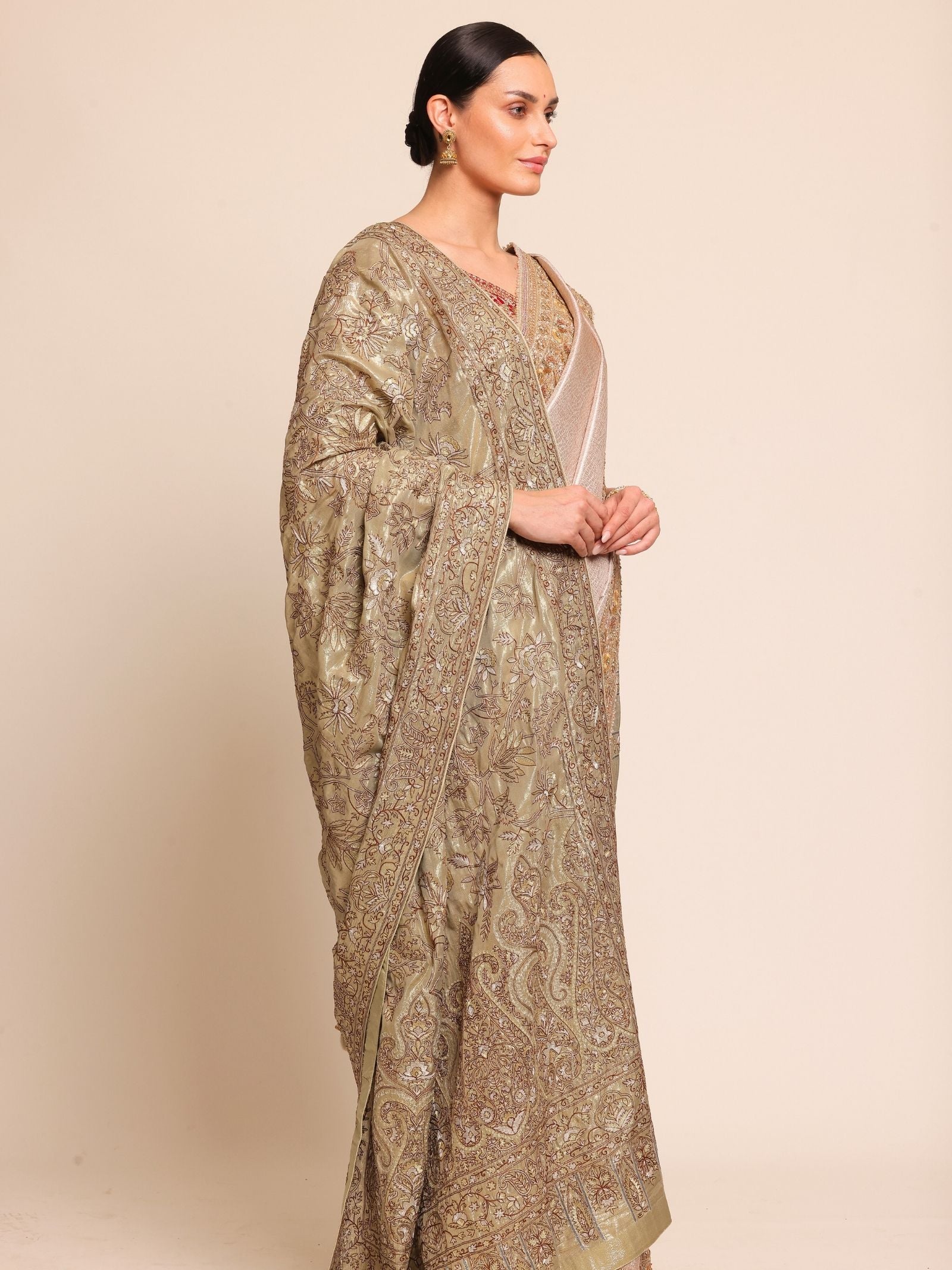 An ode to rich craftsmanship, this silk drape comes alive with dense, intricately composed floral motifs that unfold across the surface. Each detail is brought to life through meticulous hand-embroidered zari, lending a soft golden shimmer that catches the light with every movement.