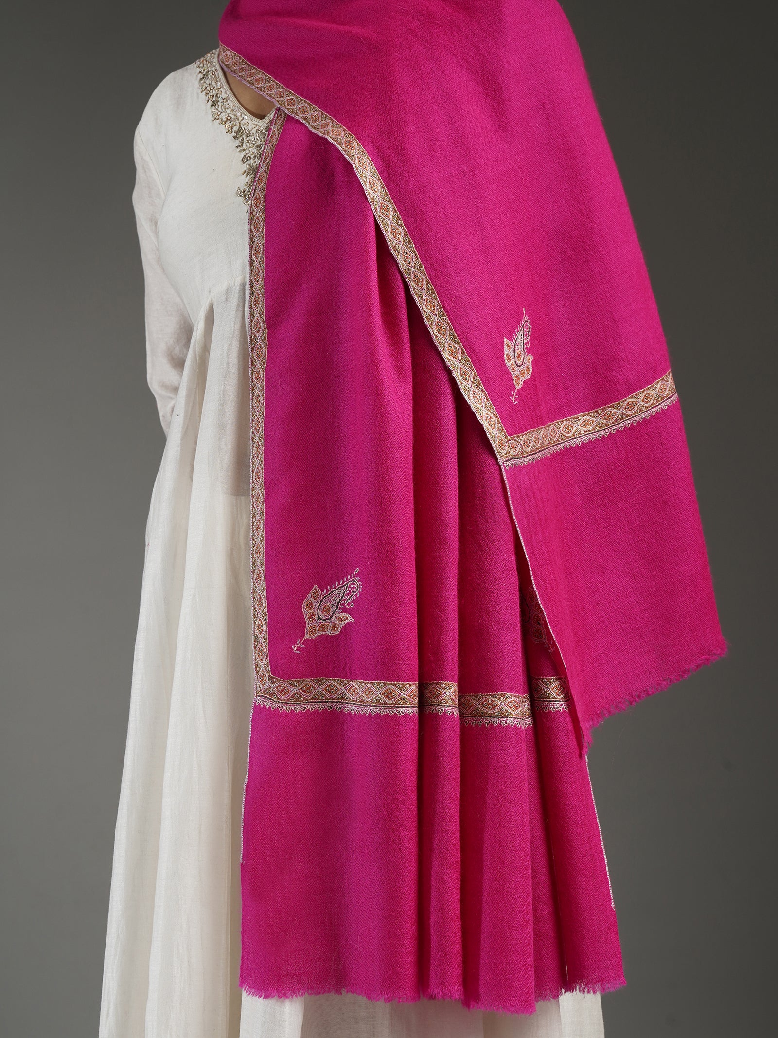 Radiant in a striking magenta pink, this handloom pashmina shawl brings bold elegance to classic craft. Its borders are delicately highlighted with fine hand-needlework, while graceful ambi and floral corner motifs add a touch of refined artistry. Soft, warm, and unmistakably luxurious, it’s the perfect statement layer.