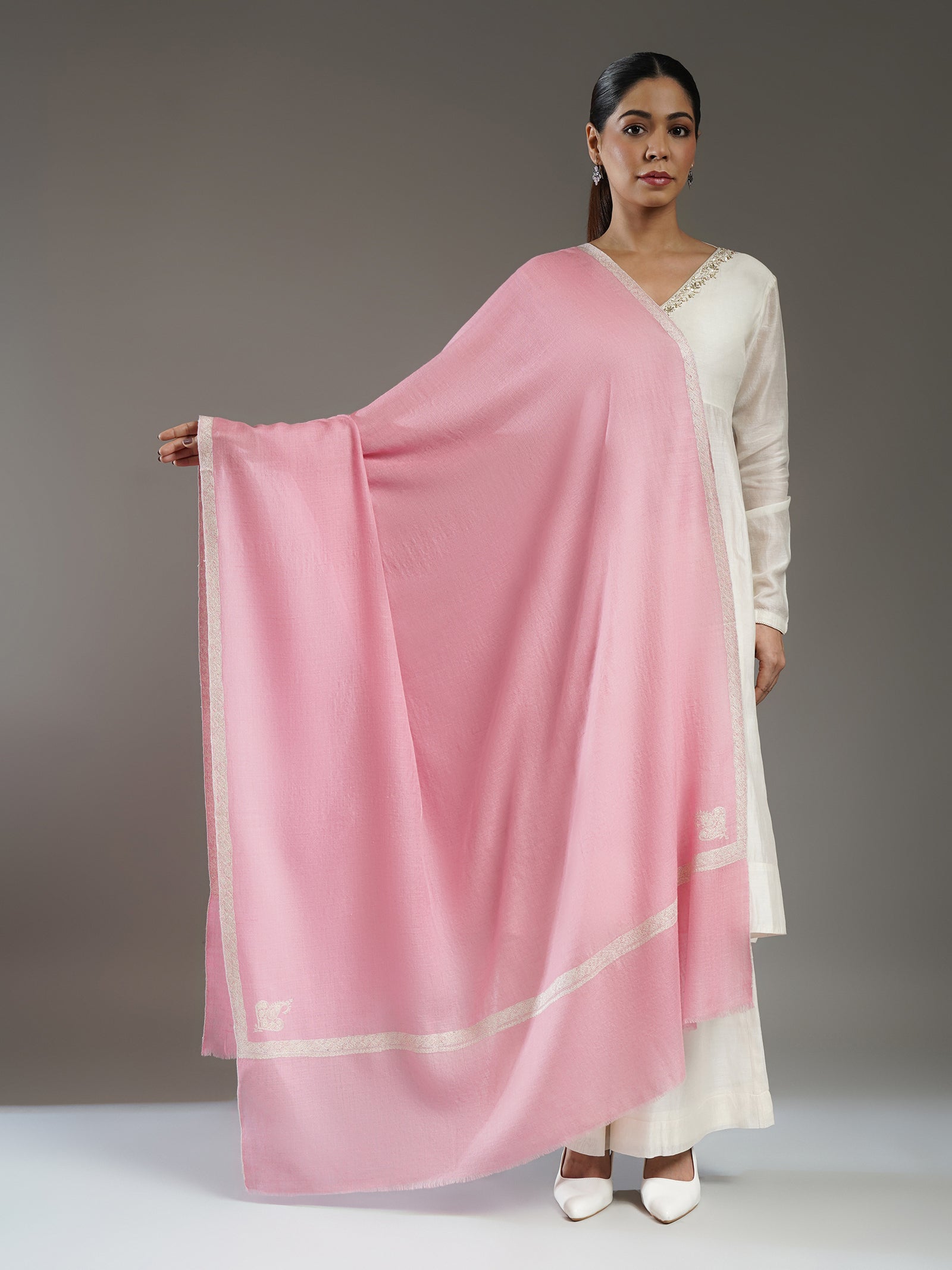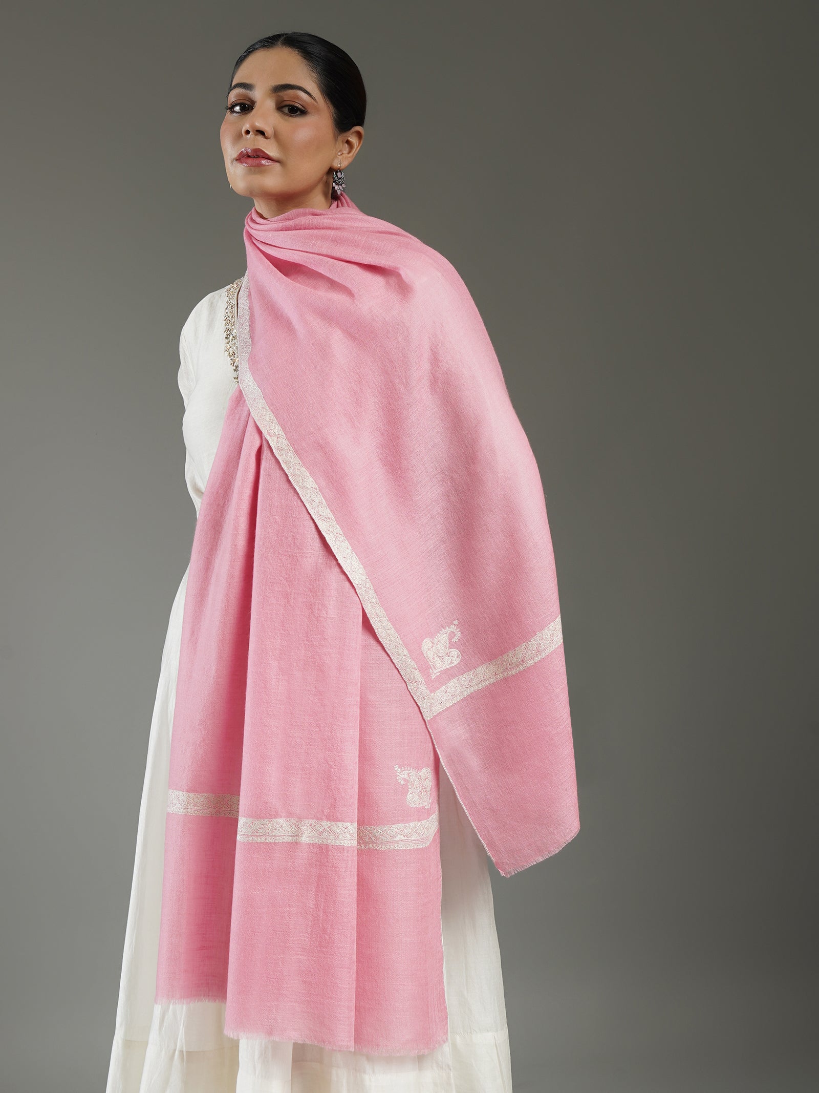 Crafted in a tender soft-pink hue, this handloom pashmina Hashidar shawl carries a poetic charm. Intricate needlework traces the borders with floral accents, while elegant ambi motifs rest beautifully at the corners. Feather-light, warm, and inherently graceful, it adds a touch of refined femininity to any look, an easy blend of comfort and luxury