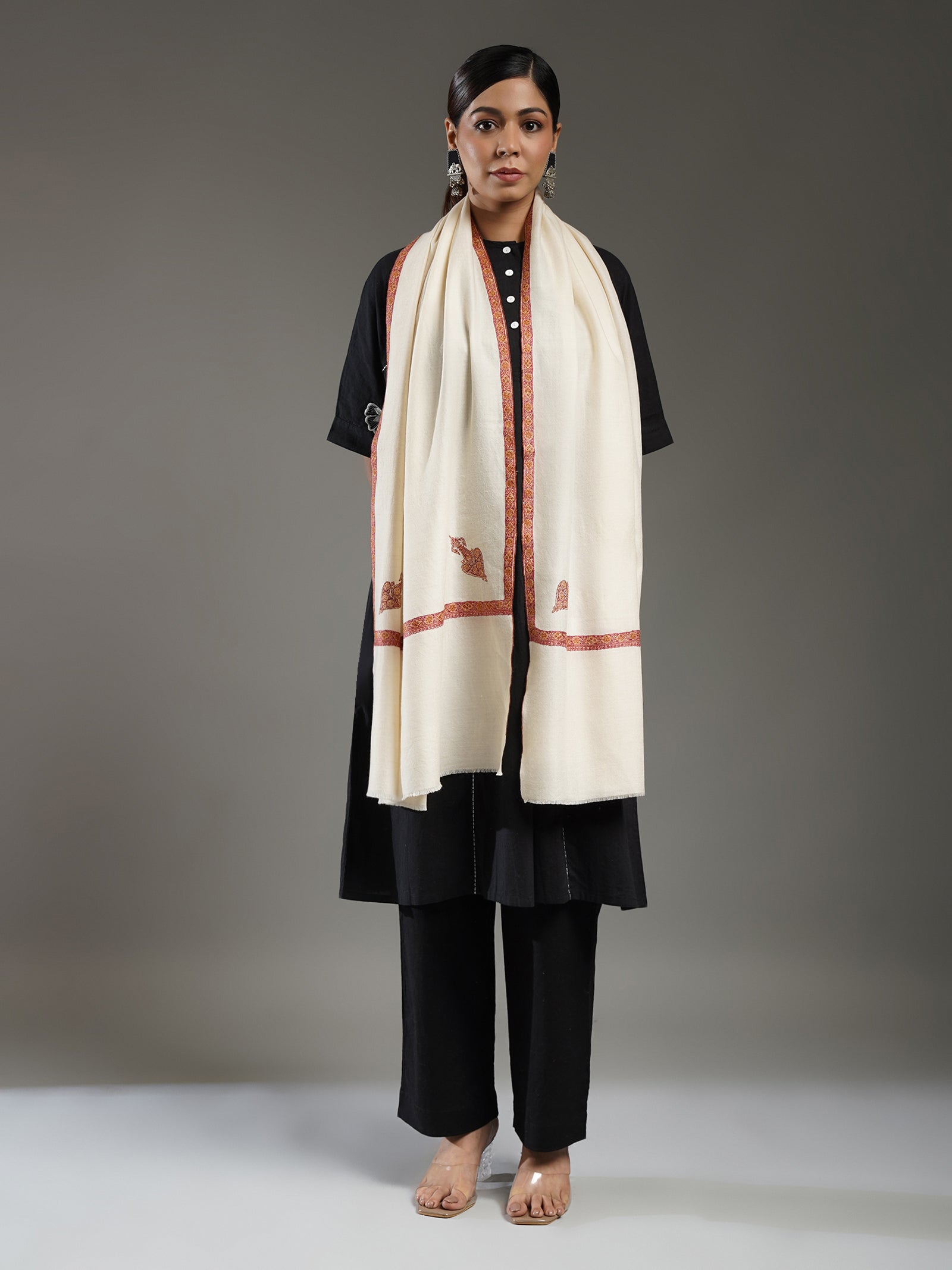 Made in pristine ivory pashmina. Its borders are lined with delicate, precise needlework that gives a clean, elegant finish, while the corners unfold into beautifully rendered ambi and floral motifs for a striking visual accent. Silky-soft, comfortably warm, and effortlessly stylish, it blends classic craftsmanship with a contemporary style.