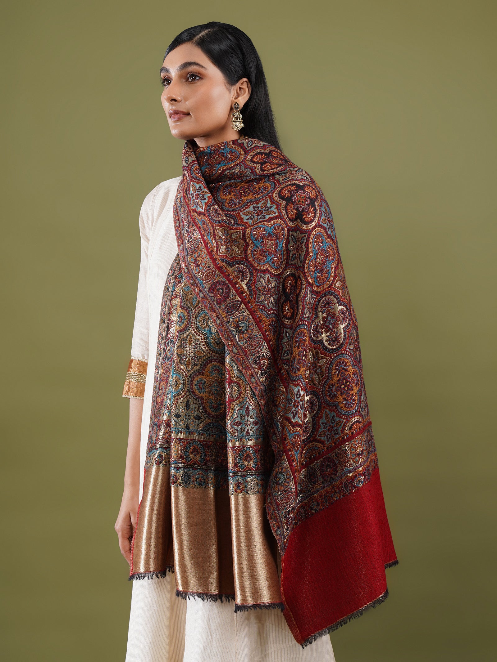 Crafted in a classic kani weave, this red-and-gold Jamawar stole glows with a structured floral pattern that feels both regal and contemporary. Elegant mehrabs and finely detailed borders frame the design, adding depth and sophistication. Woven from fine-count wool, it drapes with effortless grace.