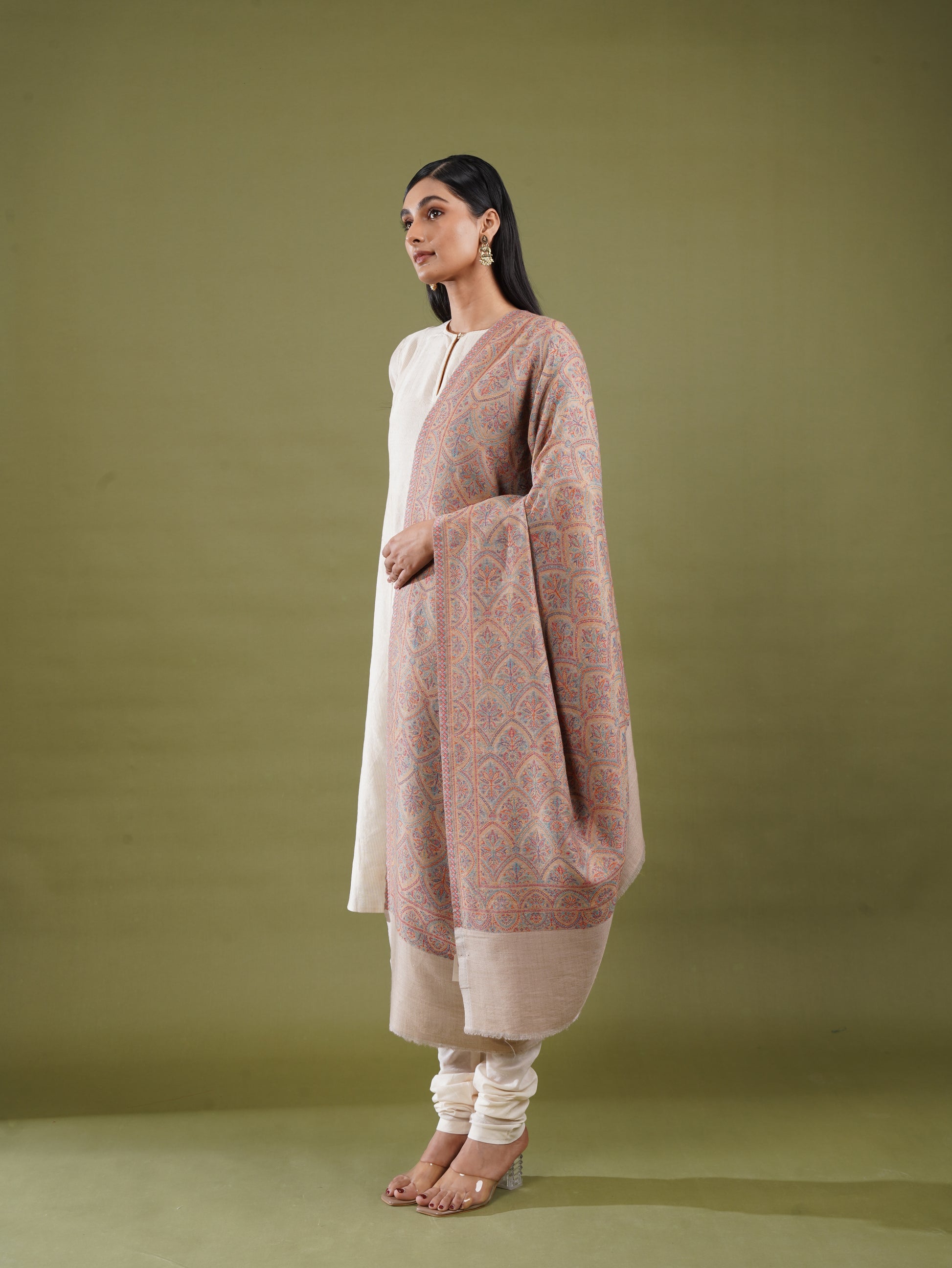 Set on a soft beige base, this Kani Jamawar Shawl is woven in an elegant reversible weave that highlights its refined artistry. The jharokha-inspired floral-comb pattern unfolds in intricate detail, framed by delicately crafted floral borders. Made in fine-count wool, it offers a smooth, graceful drape, an understated expression of timeless luxury.