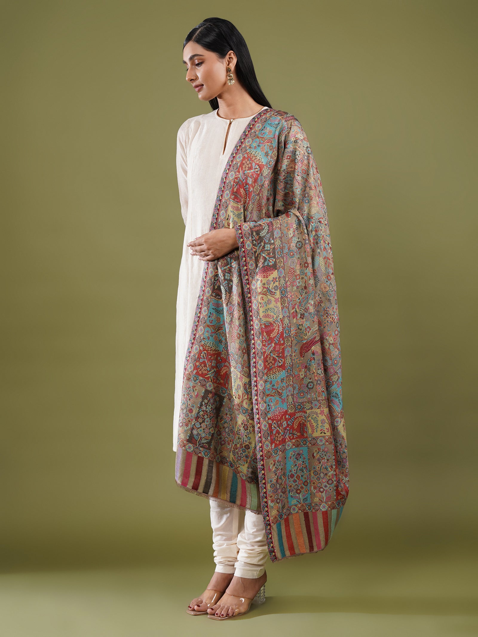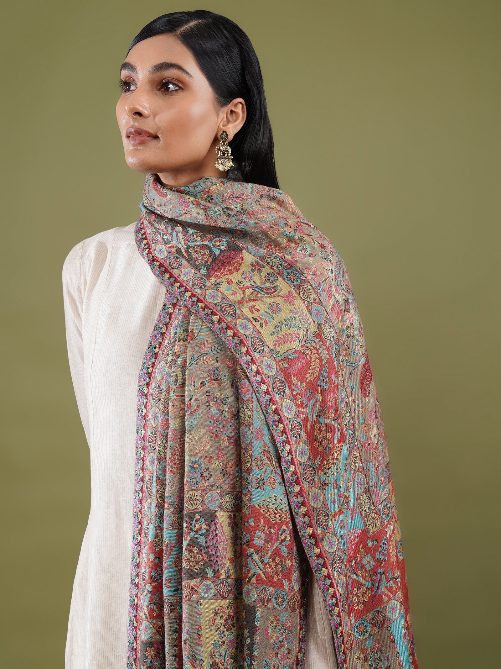 Alive with colour and craft, this multicoloured Kani Jamawar Shawl is woven in a refined rweave that highlights its intricate storytelling. A harmonious blend of flora and fauna, graceful bird motifs, trees, and delicate florals unfolded across the surface, framed by elegant mehrabs and ornate borders. Made from fine-count wool, it drapes with effortless softness, embodying the quiet opulence of true luxury.