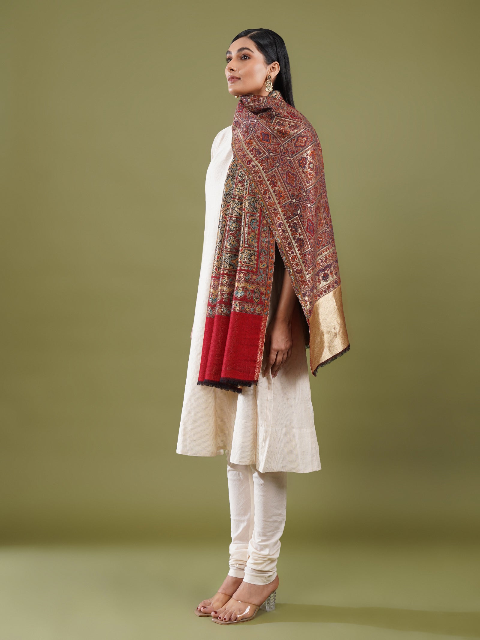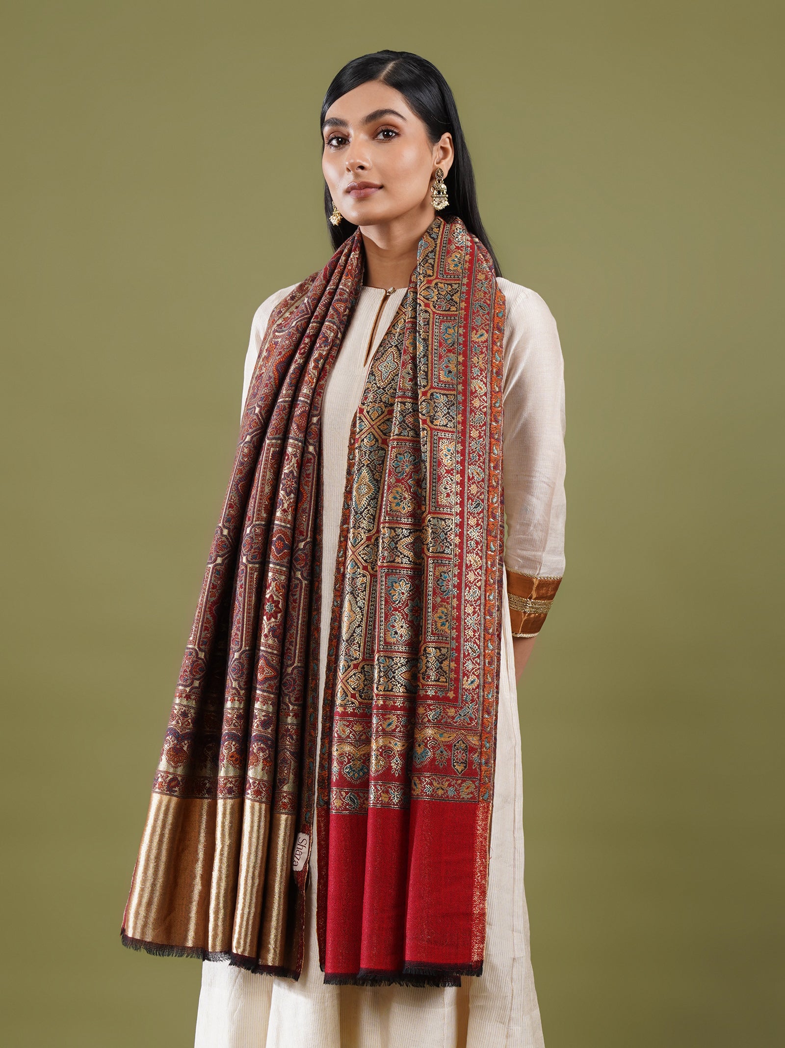 Made in rich red and golden colours, this Kani Jamawar shawl highlights a densely detailed floral-Aala design woven in a reversible zari weave. Intricate mehrabs and elegant borders frame it with classic finesse. Woven from fine-count wool, it offers a soft, fluid drape, making it as suited to elevated travel styling as it is to refined everyday wear.