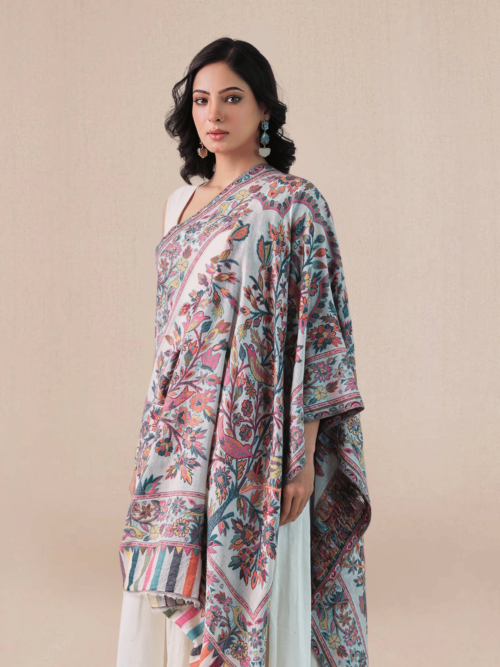 The Saima Kani Woolen Shawl in a soft white shade is adorned with a vibrant multicolor Kani weave. Showcasing the Tree of Life design with intricate flowers and birds, framed by elegant floral border and stripred mehrab, this shawl offers warmth, comfort, and effortless style, it's a versatile piece perfect for multiple occasions.