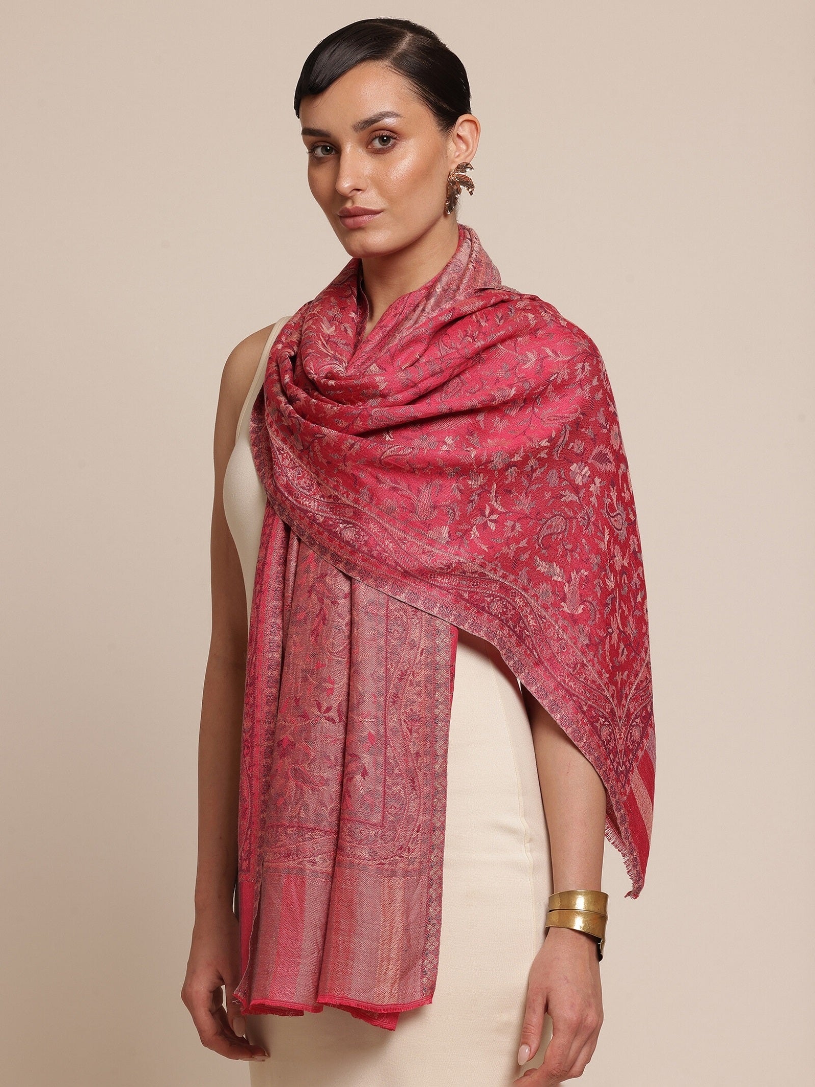 A celebration of colour and craft, this Kani stole is woven in fine wool, brought to life with dense multicoloured florals that create a rich, immersive surface. Intricate borders and mehrab motifs frame the design, lending it a distinctive, artful character. Soft & warm, it is a timeless piece that carries both elegance and depth.