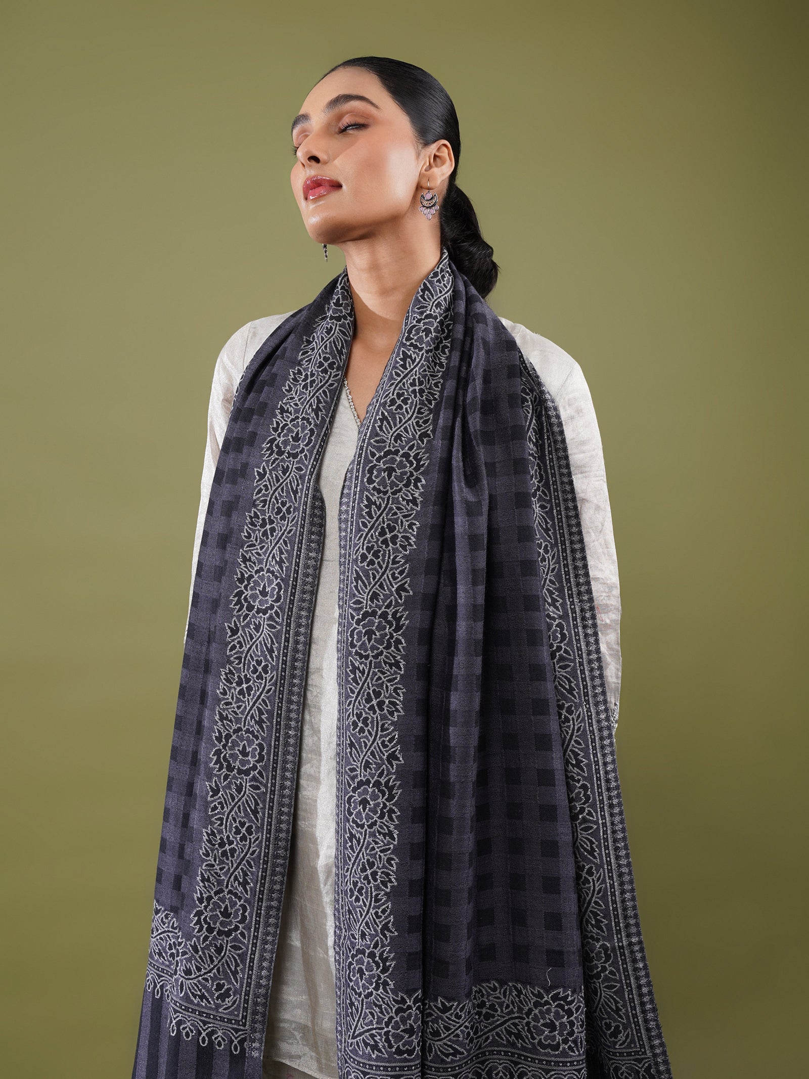 In this black Madhuvan woolen stole, classic checks meet artful floral borders, creating a striking balance of boldness and grace. The soft woollen weave offers comforting warmth without weighing you down, making it a natural choice for everyday layering or winter travel. Effortlessly stylish and versatile, it brings a refined finish to any cold-weather look.