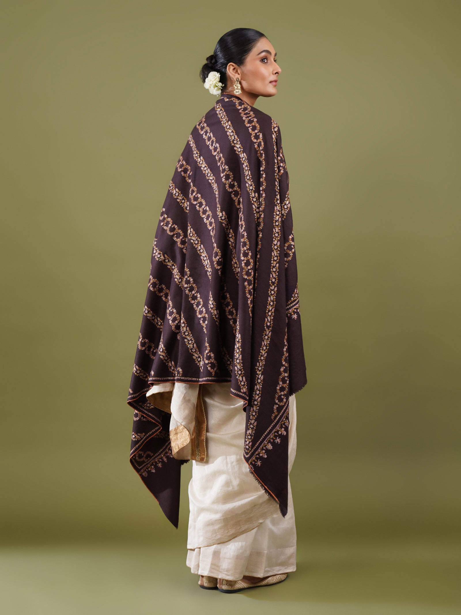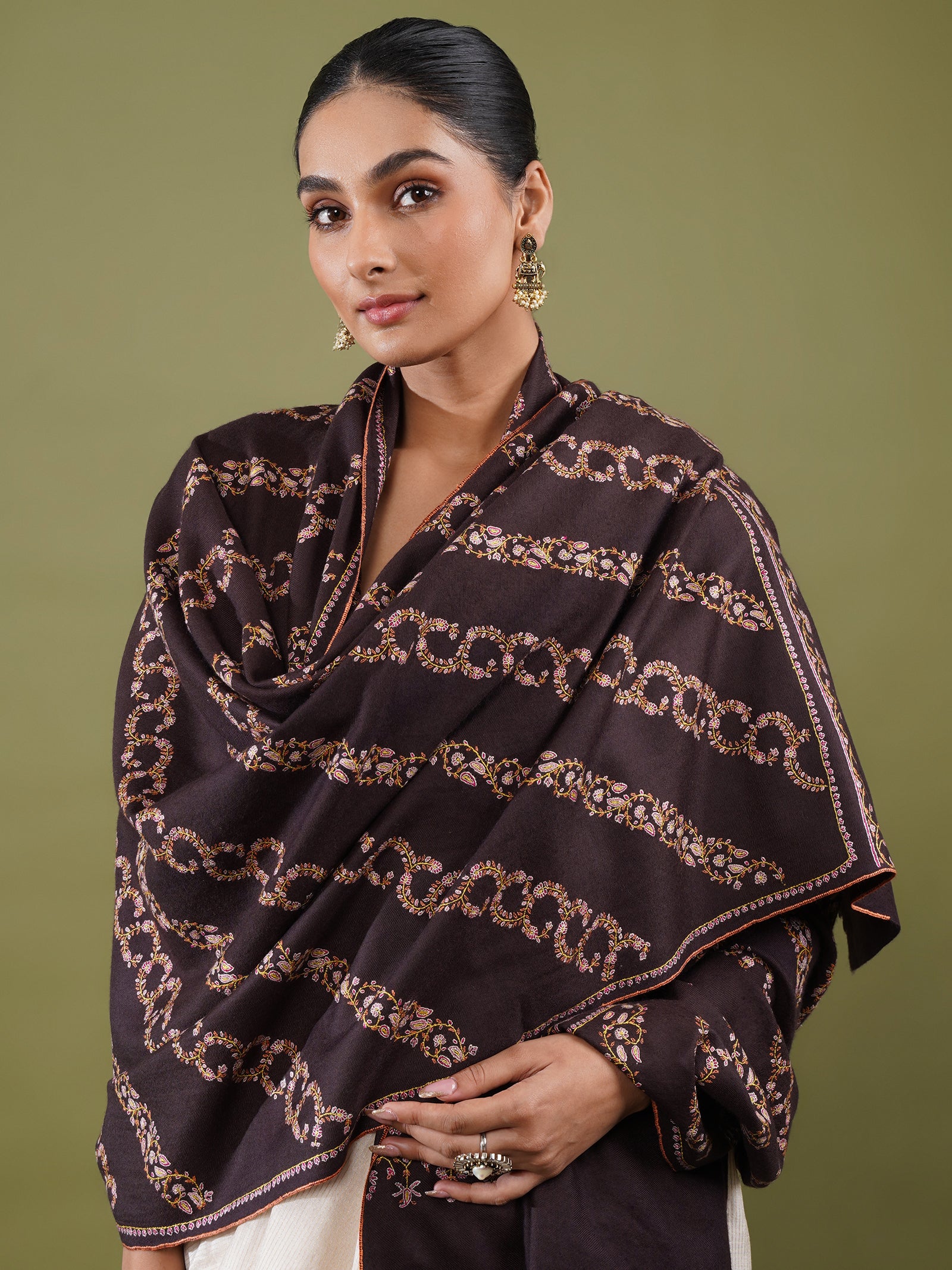 Crafted in a deep, rich brown shade, this handloom pashmina shawl features all-over needlework embroidery, where delicate floral motifs unfold along gracefully aligned diagonal stripes. The interplay of pattern and texture lends it a uniquely elegant design. Woven from pure handloom pashmina, it embodies heritage craftsmanship, refined oriental artistry, and timeless luxury, an heirloom piece crafted to be cherished for generations to come.