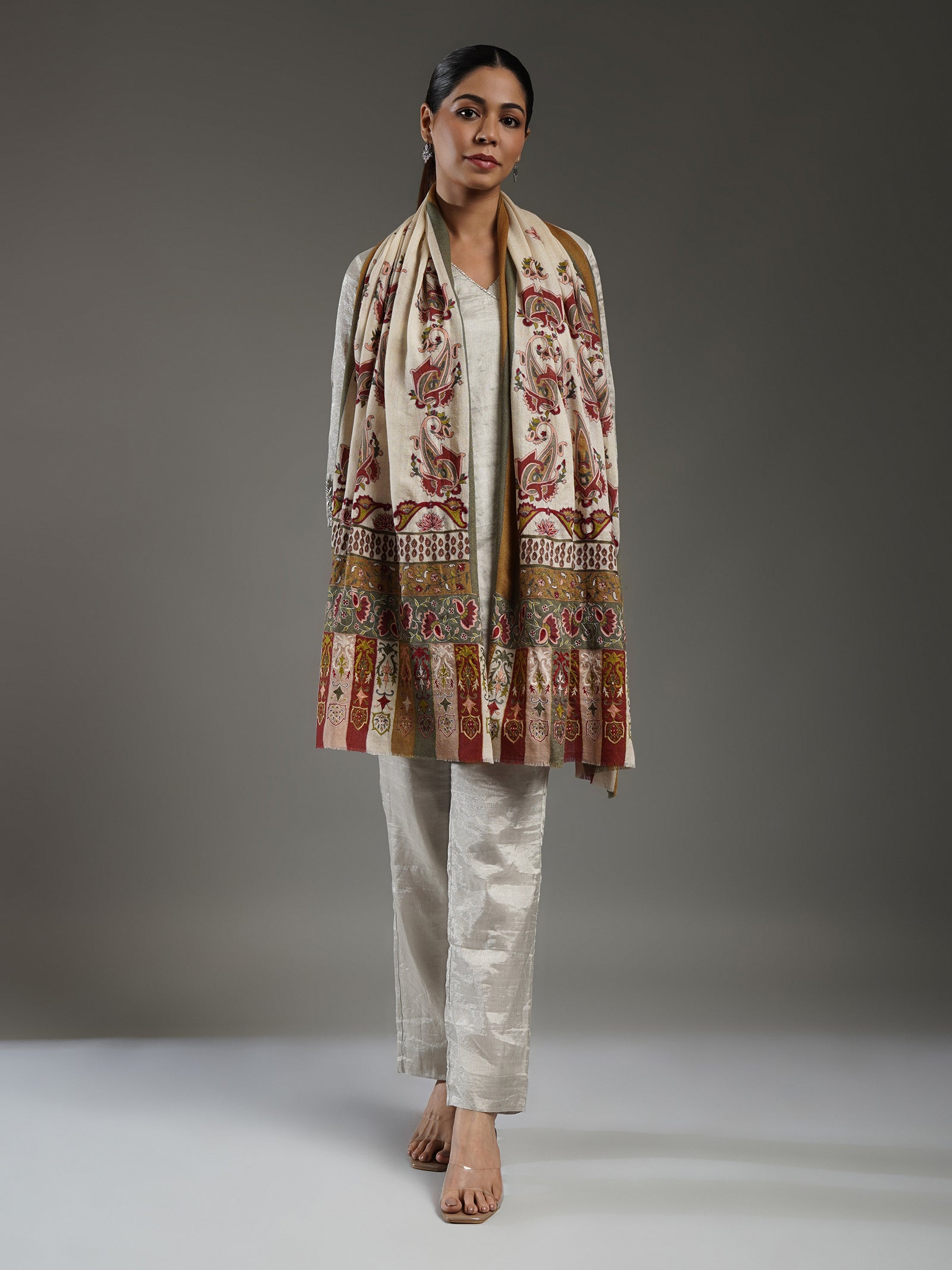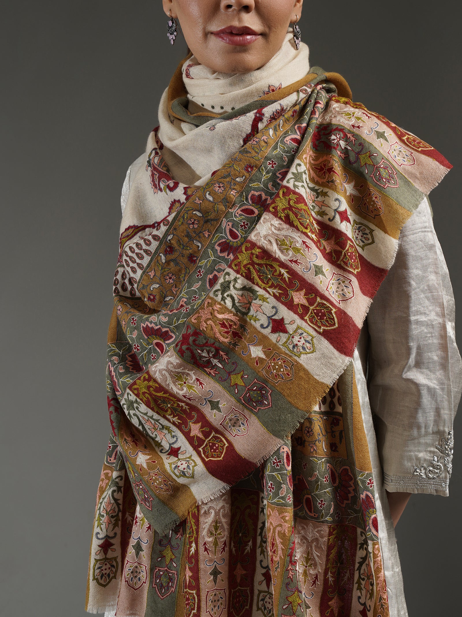This handloom pashmina stole brings together a rich play of multicolours through finely hand-painted and hand-embroidered Kalamkari design. Its surface unfolds with intricate floral narratives, while the borders and mehrab motifs add a structured, heritage-inspired framing. Soft, lightweight, and detailed, it’s a statement piece that blends traditional finesse with contemporary elegance