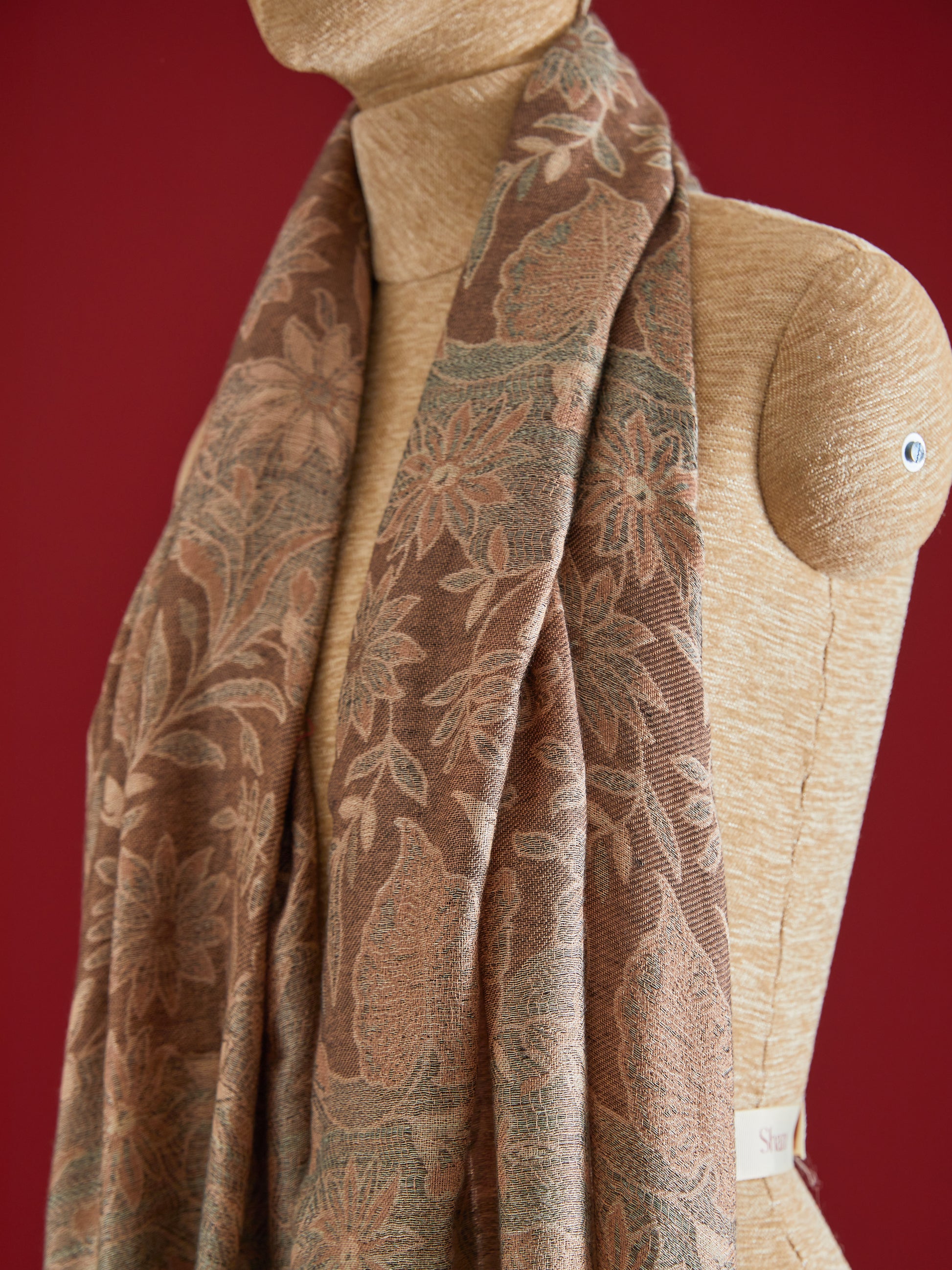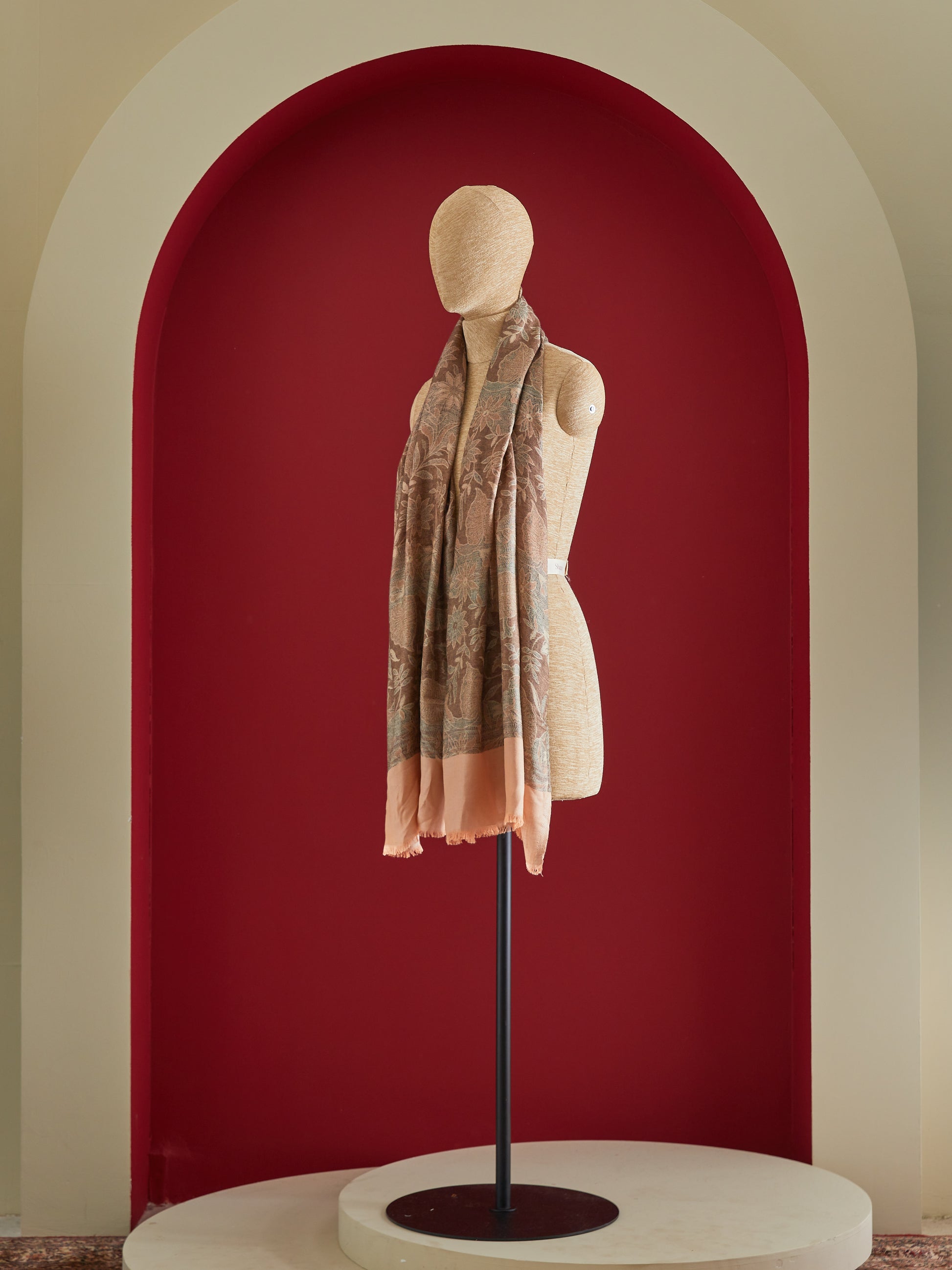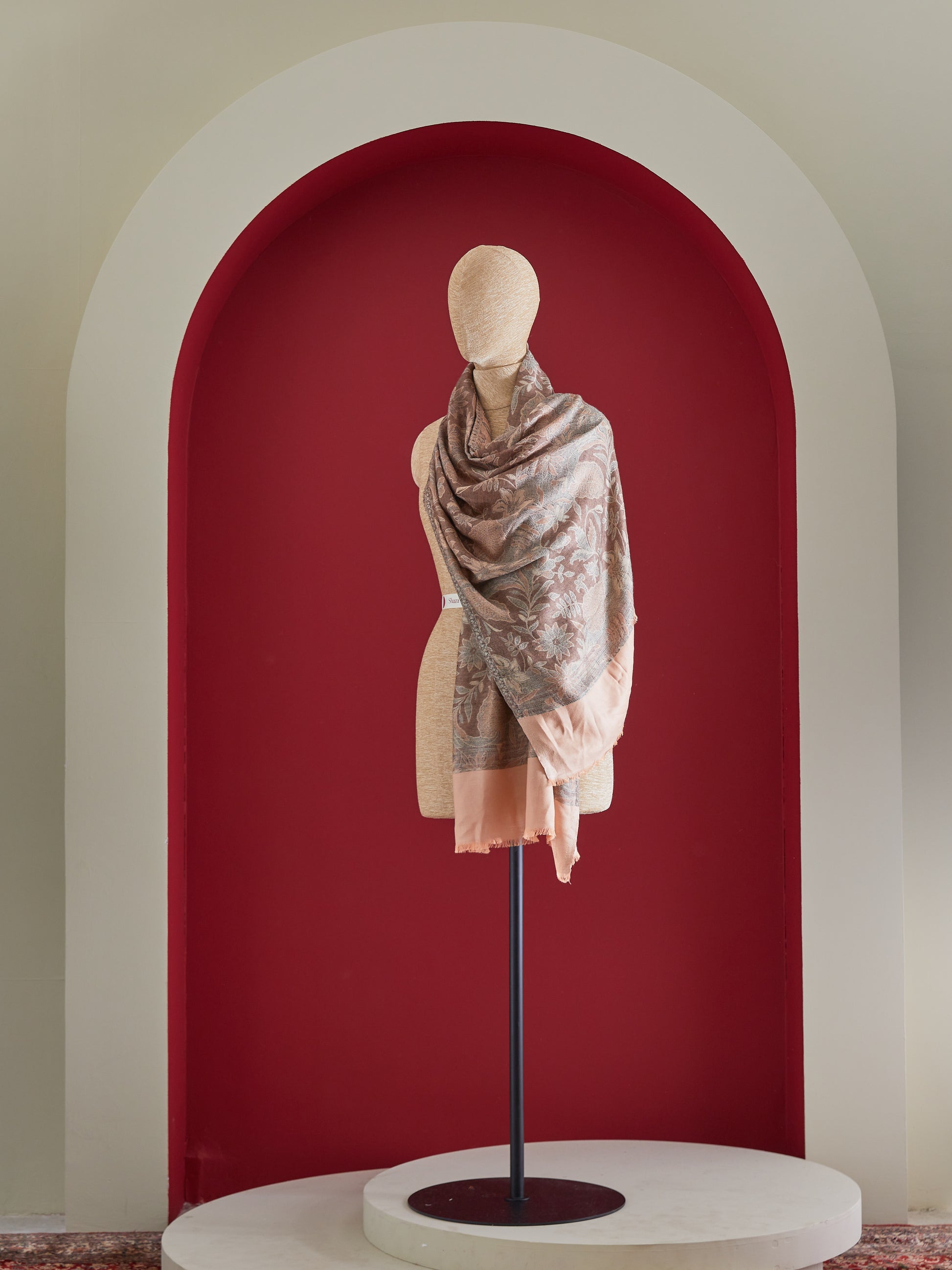 A soft hued wool stole featuring a scattering of flowering vines in muted colors. The flower and vine designs are woven in this Kani stole, enhancing the elegant honey peach and brown color scheme of this drape beautifully. This is a light weight stole and hence versatile for many uses. It is great for wearing with contemporary and traditional outfits, while keeping you warm in chilly days and evenings.