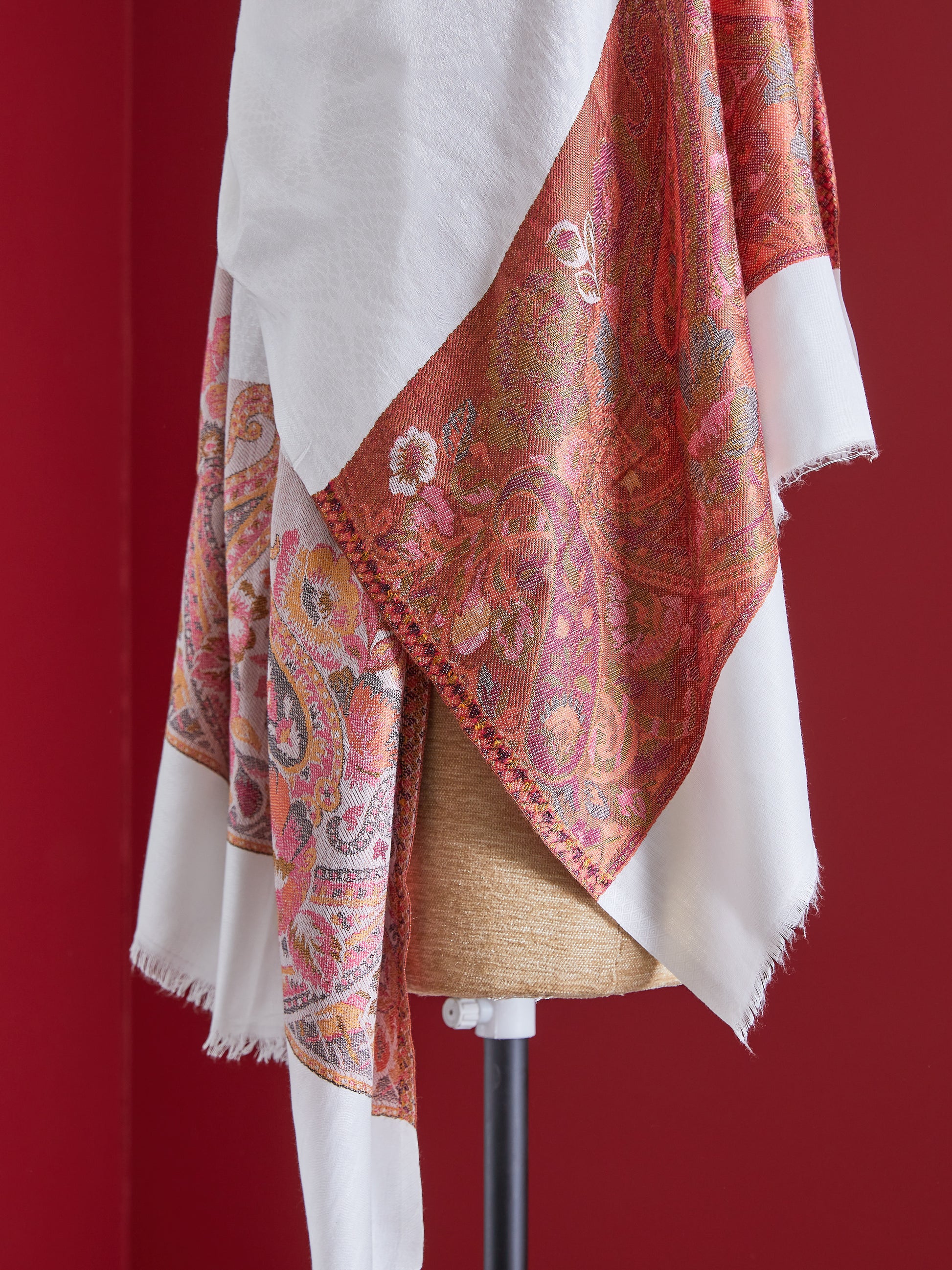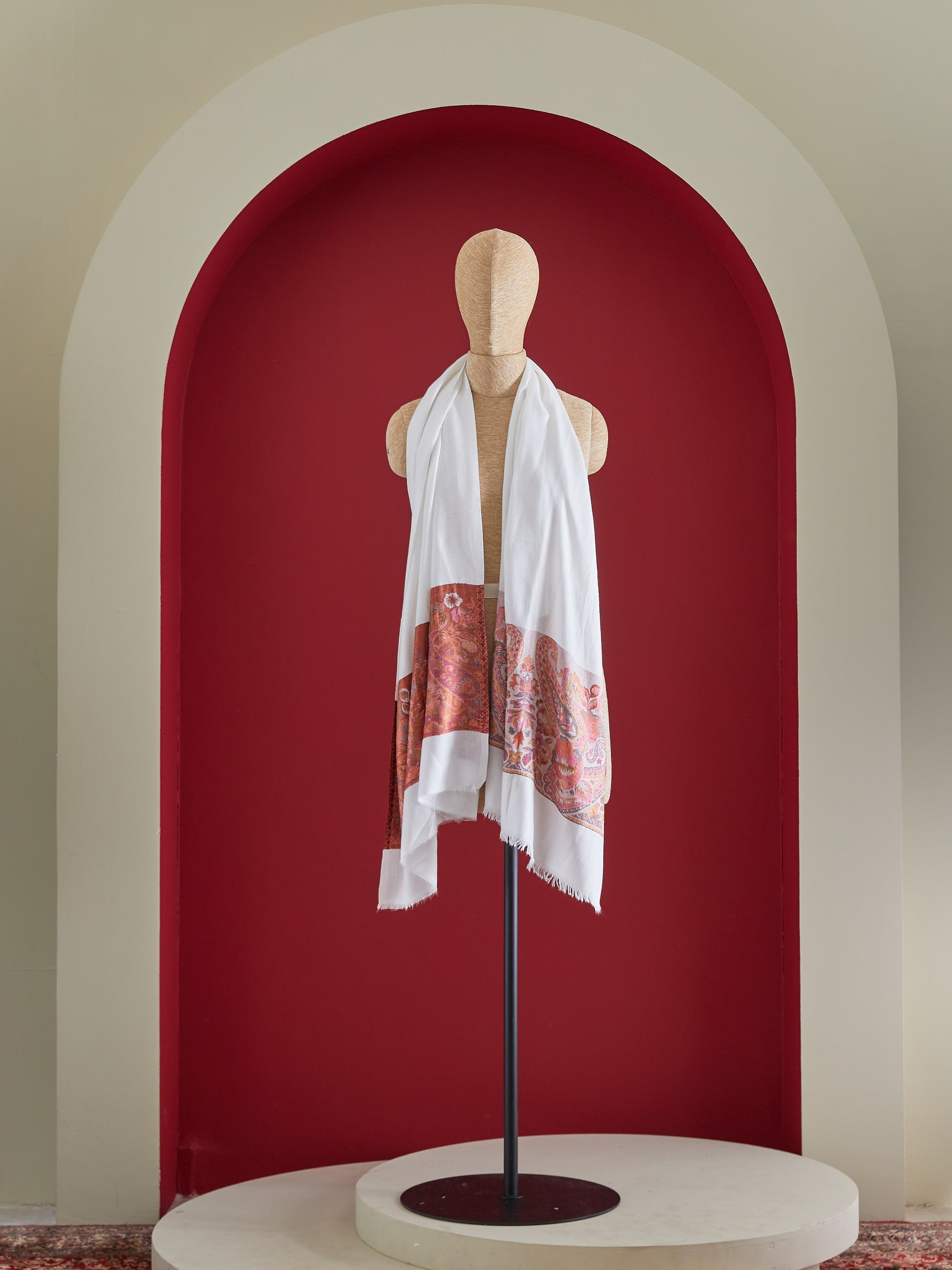 This soft hued wool stole features a stunning white and brick red combination. A self woven pattern in beautiful silvery designs runs along the length of this stole on a white background while the palla boasts a wide border with rusty red kani designs. The simplicity of this stole makes it a versatile addition to your travel and everyday wardrobe.