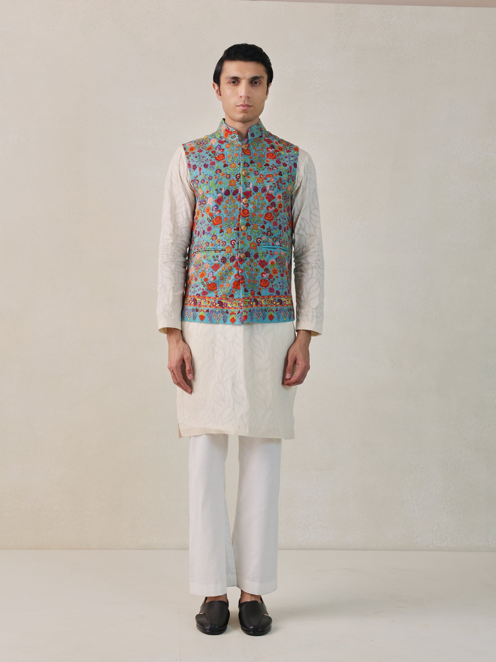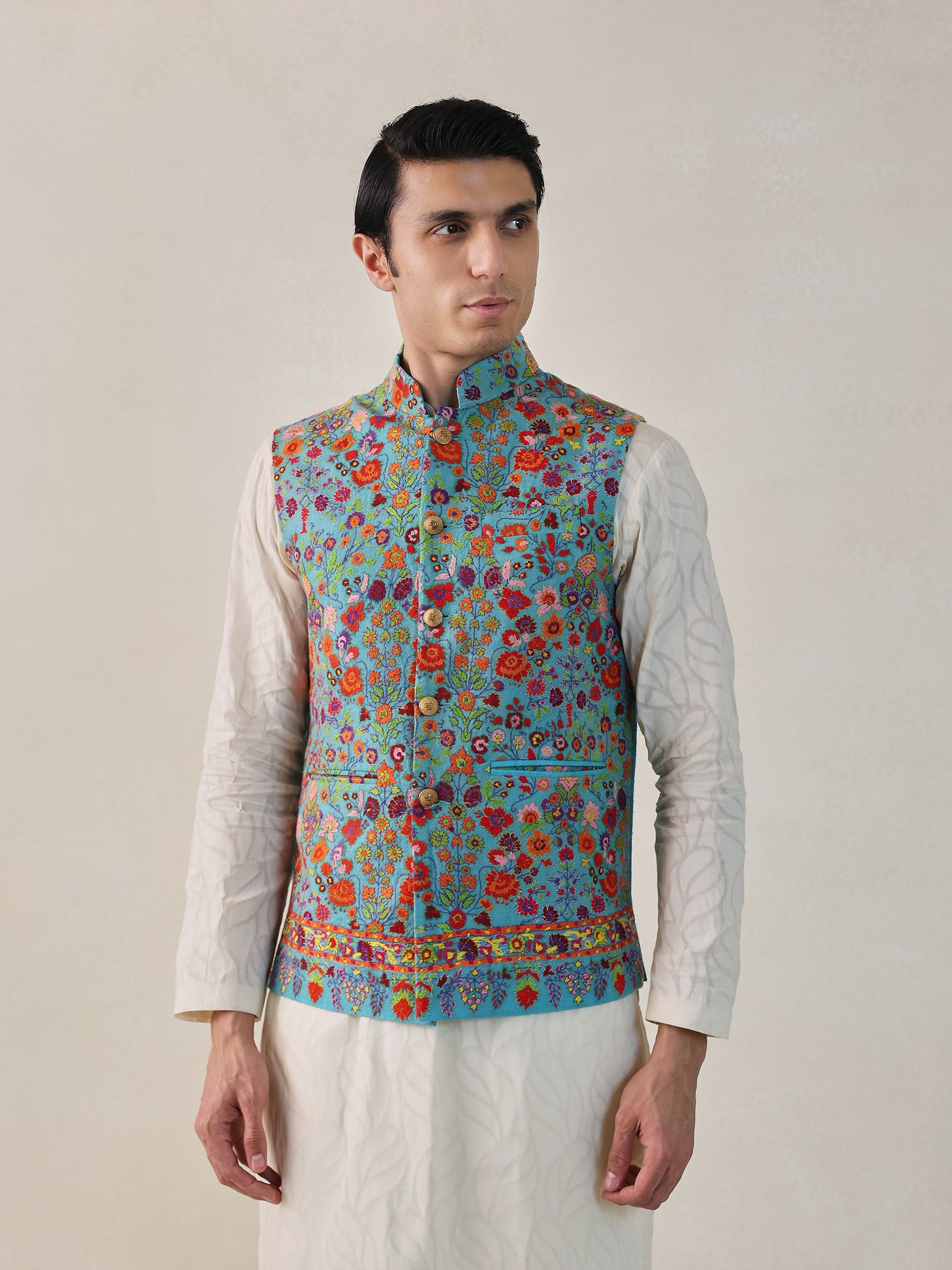 Our Waistcoat, crafted from fine pashmina, features vibrant multicolour floral motifs hand-embroidered over a striking bright blue base. With a mandarin collar and classic pockets, this stylish waistcoat is perfect for special gatherings, effortlessly elevating any outfit with its elegant charm.