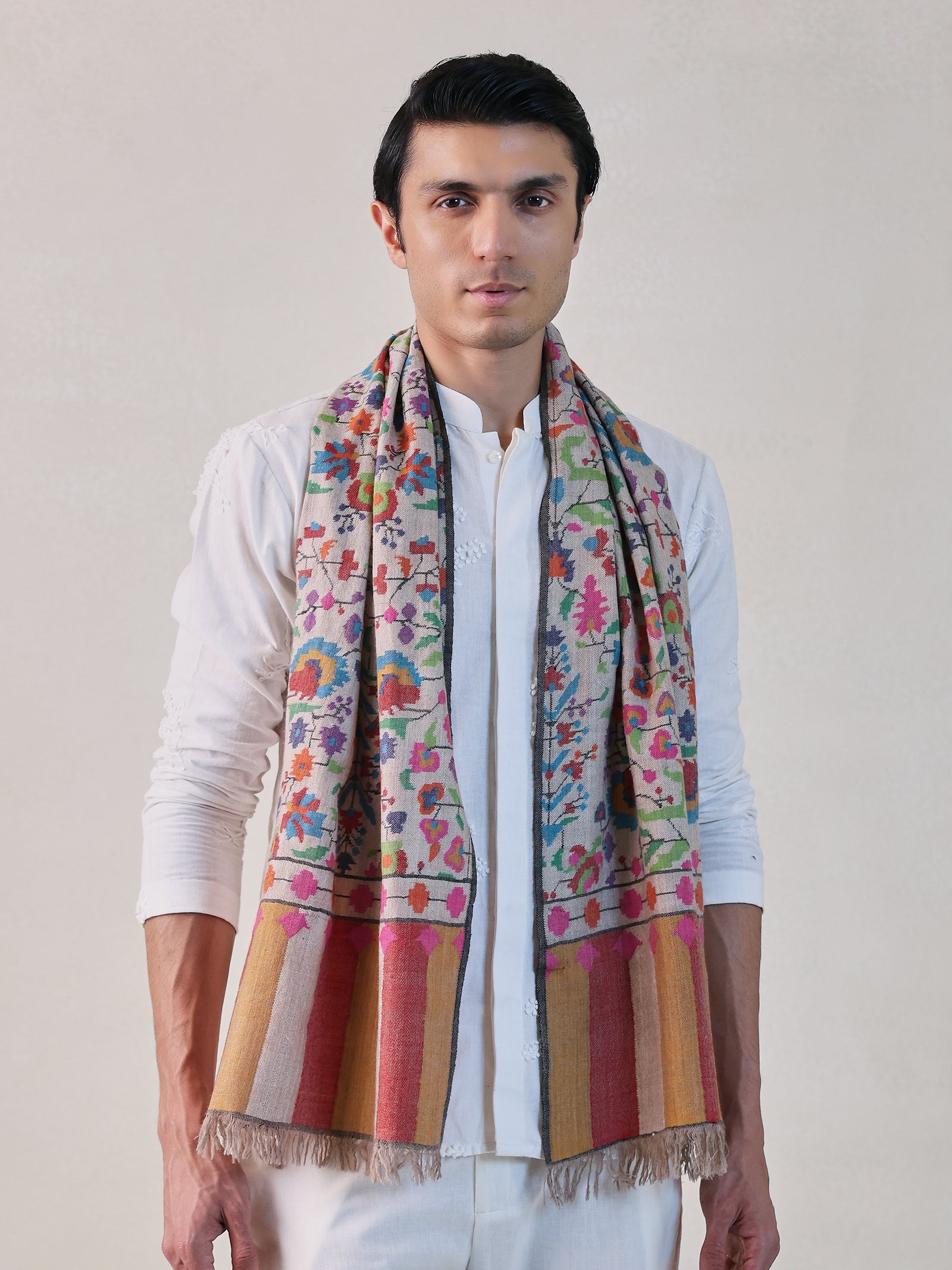 This pashmina muffler, designed for both men and women, comes in a soft grey hue. It features intricate floral needlework, which adds a touch of artisanal craftsmanship to various outfit. Its lightweight feel and warm texture make it a perfect accessory for travel, easily transitioning from day to evening wear with timeless style.
