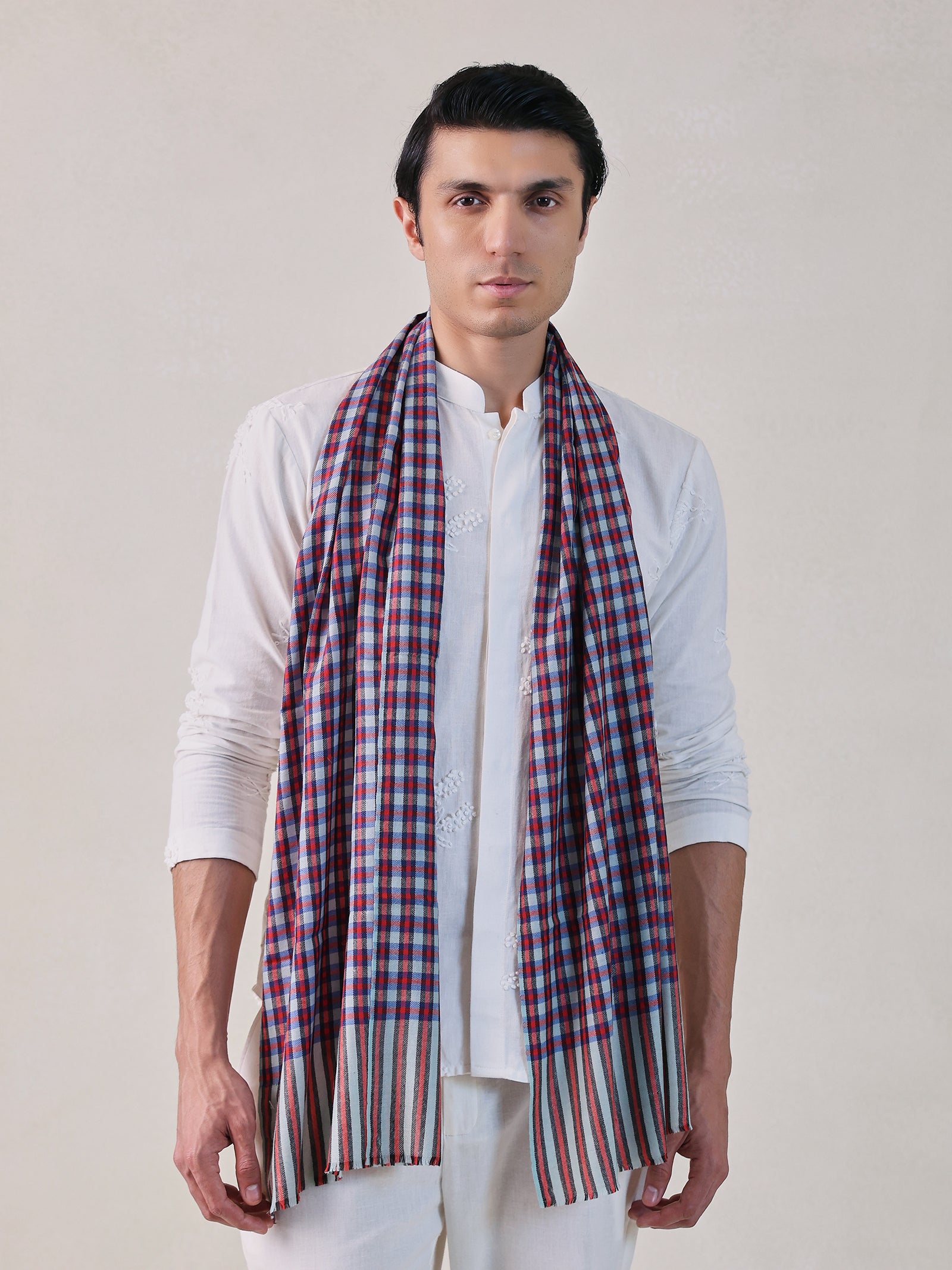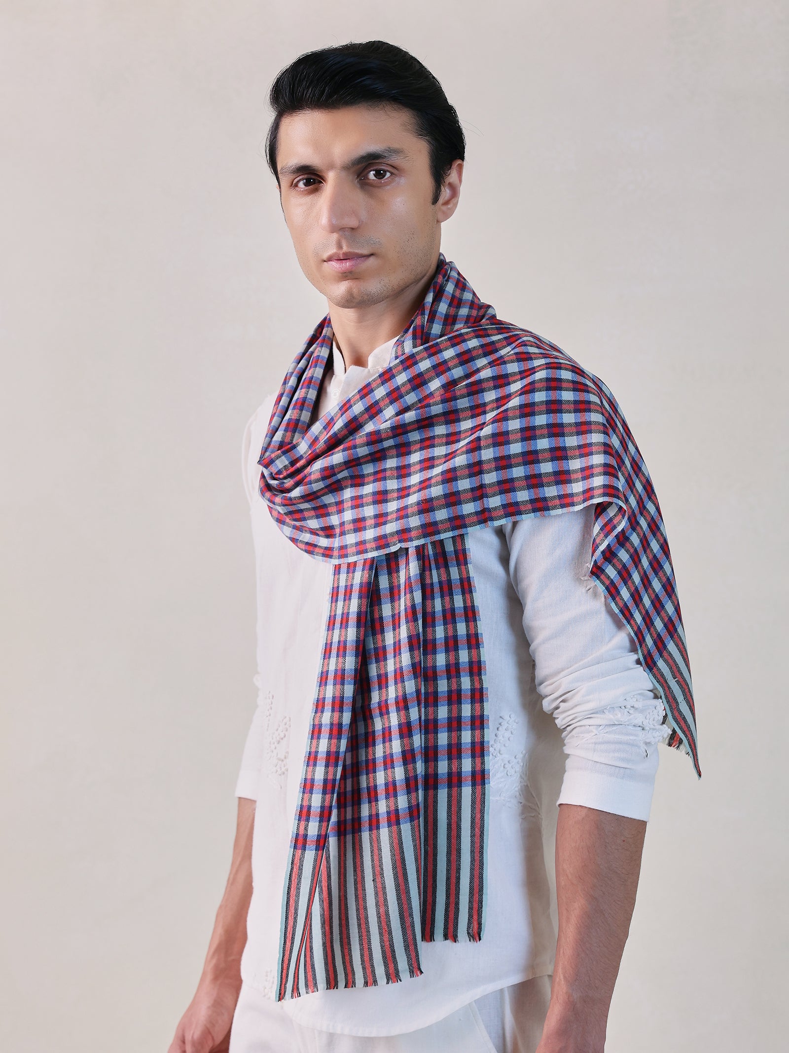 Our Pashmina check muffler features a striking bold checked pattern in black, red, and blue tones. Warm and sophisticated, it complements a range of styles, making it a versatile choice for any occasion.