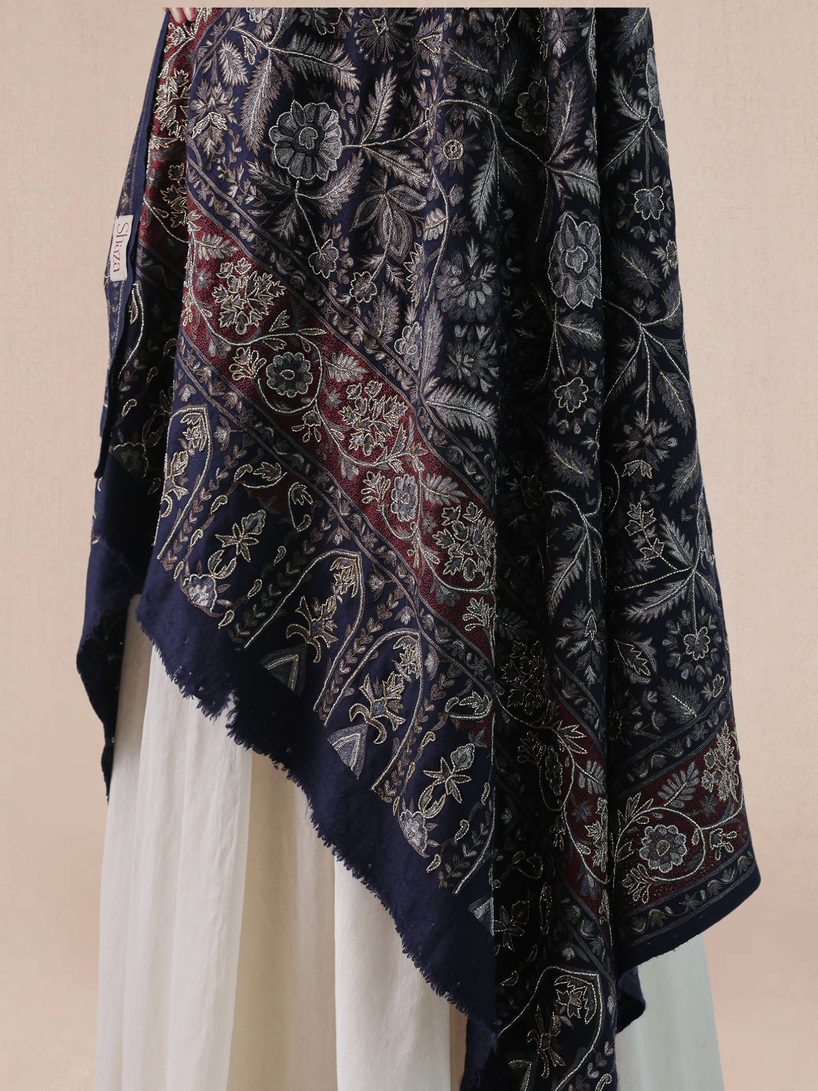 Dark Blue Pashmina Shawl with Exquisite Hand Embroidery