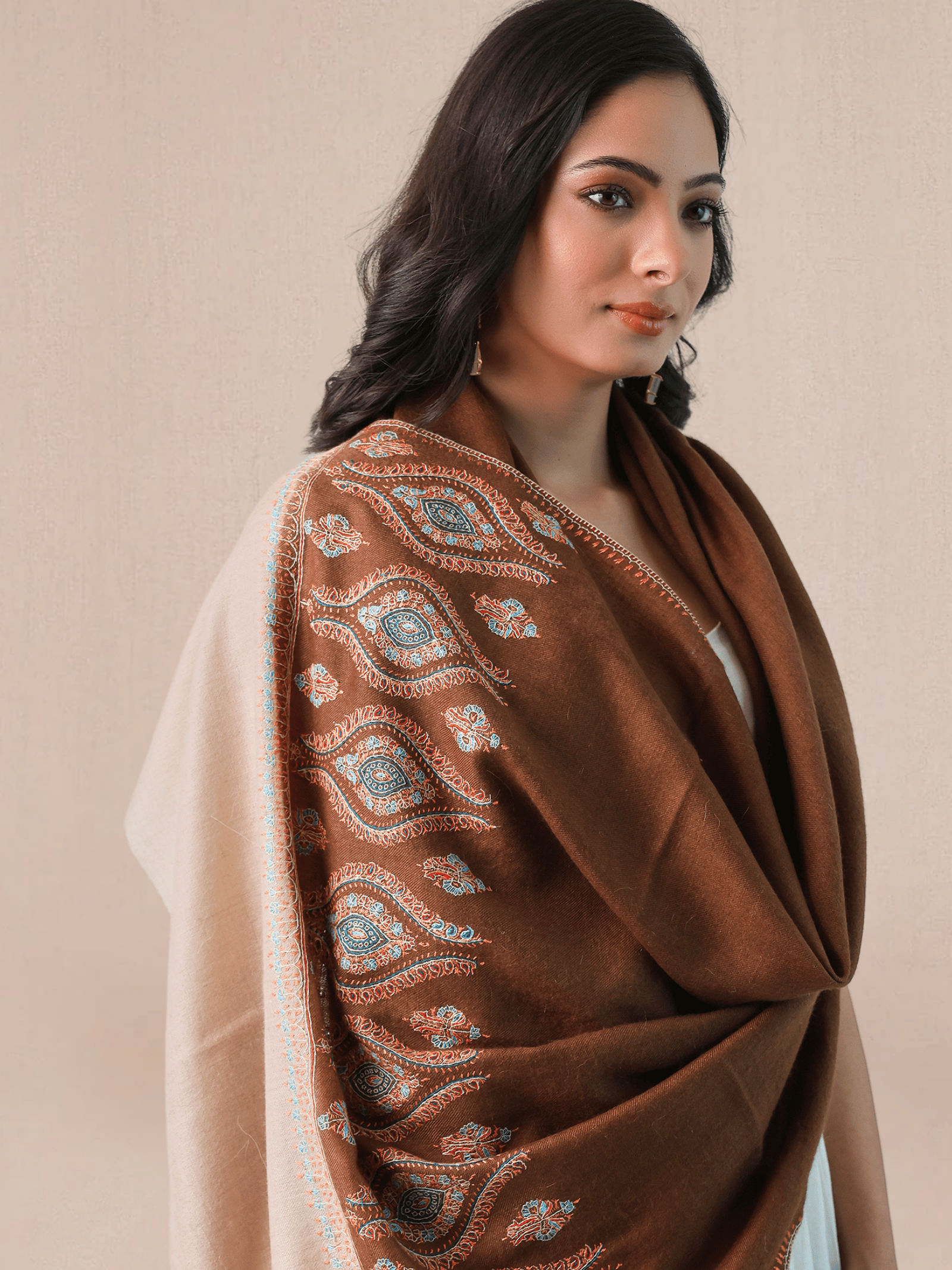 The Nusrat Stole, beautifully crafted from handwoven pashmina, combines rich brown tone. Adorned with elegant needlework embroidery featuring intricate floral motifs, this pashmina stole adds a touch of sophistication to any outfit while offering warmth, comfort, and enduring charm.