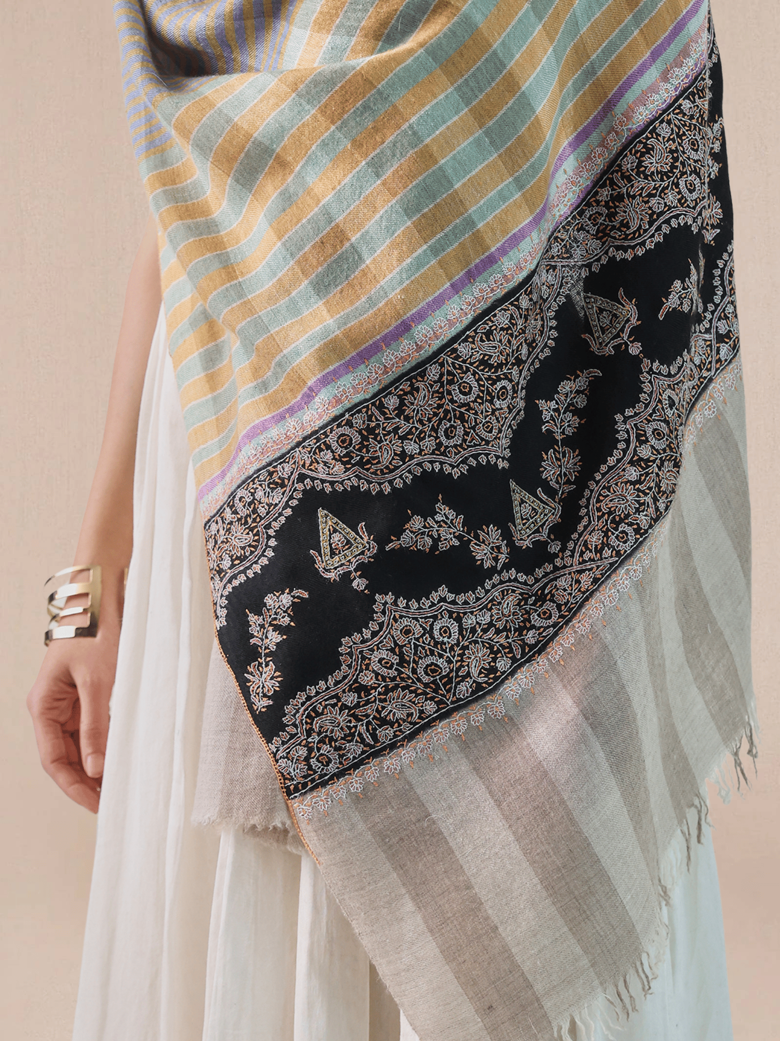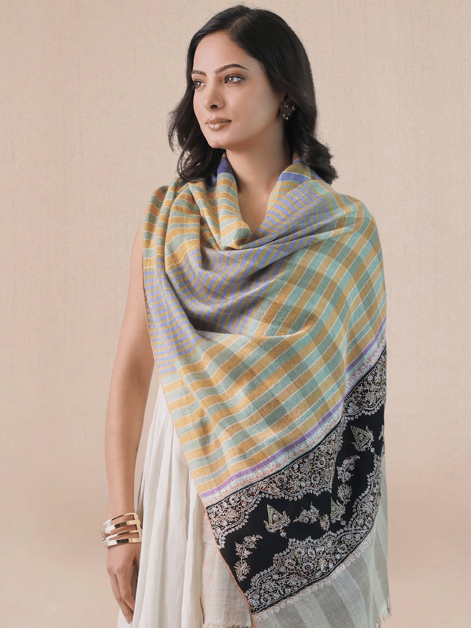 Presenting the Nusrat Pashmina Stole, a stunning handwoven pashmina crafted in a beautiful array of multicolored stripes. Acdorned with intricate needlework embroidery it is perfect for adding a pop of colors to any outfit, it promises warmth, style, and sophistication.