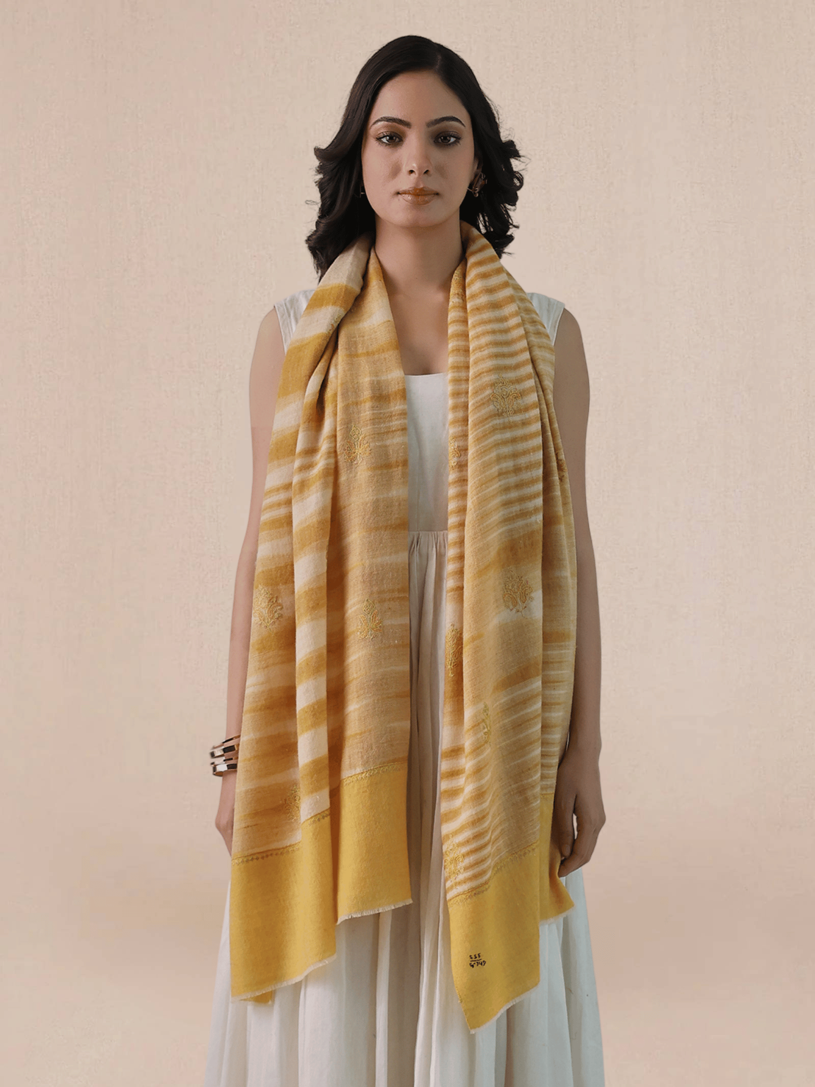 The Nusrat Stole, crafted from luxurious handwoven pashmina, features a stunning dual shade of yellow and ivory. Adorned with delicate needlework embroidery, this pashmina stole exudes elegance and sophistication. Perfect for elevating any outfit, it combines warmth, comfort, and timeless beauty.