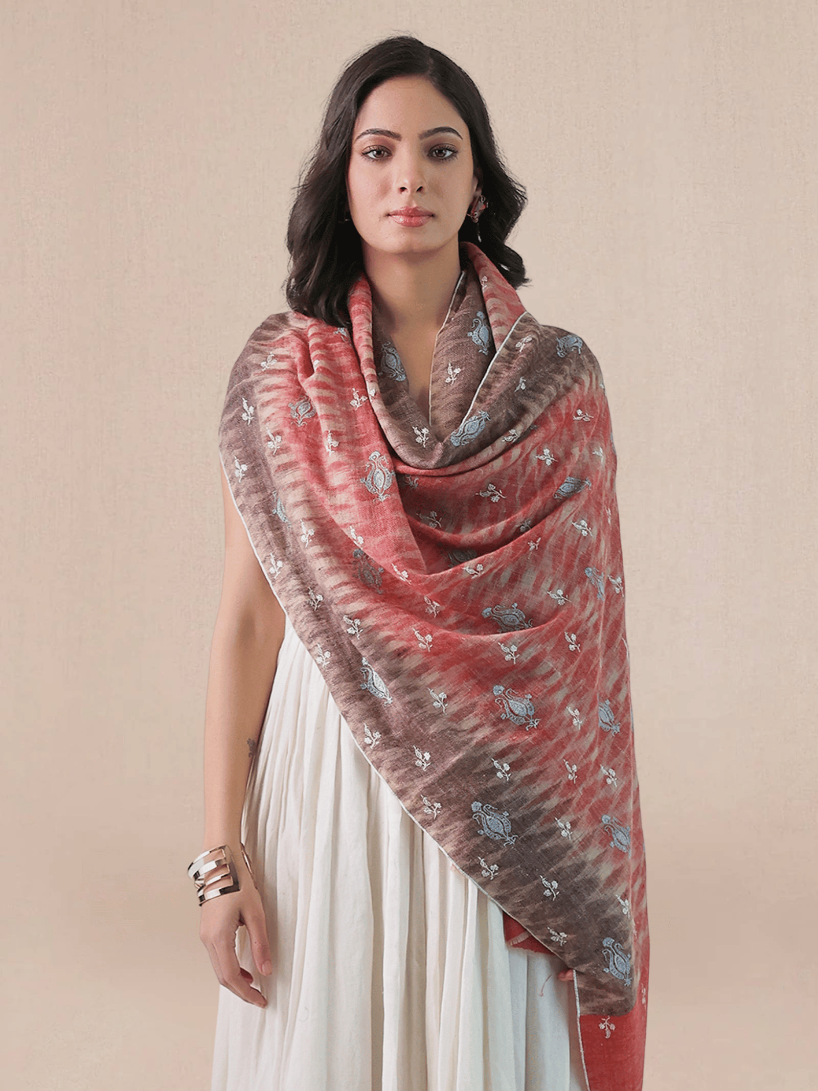 Introducing the Nusrat Stole, made in handwoven pashmina, blending deep red and brown hues. Delicately embroidered with intricate floral needlework, this pashmina stole is a versatile accessory that elevates any ensemble with warmth, elegance & sophistication.