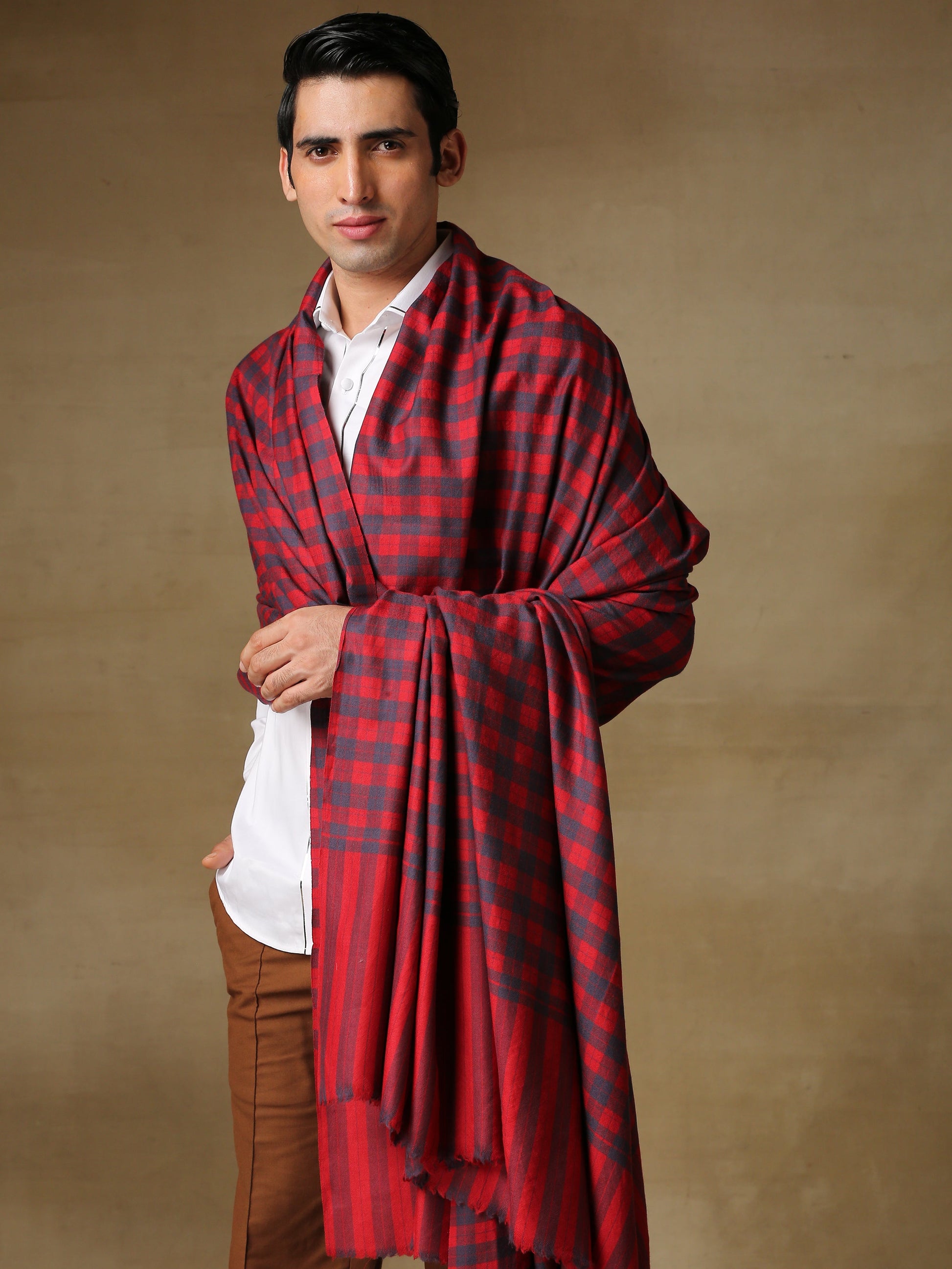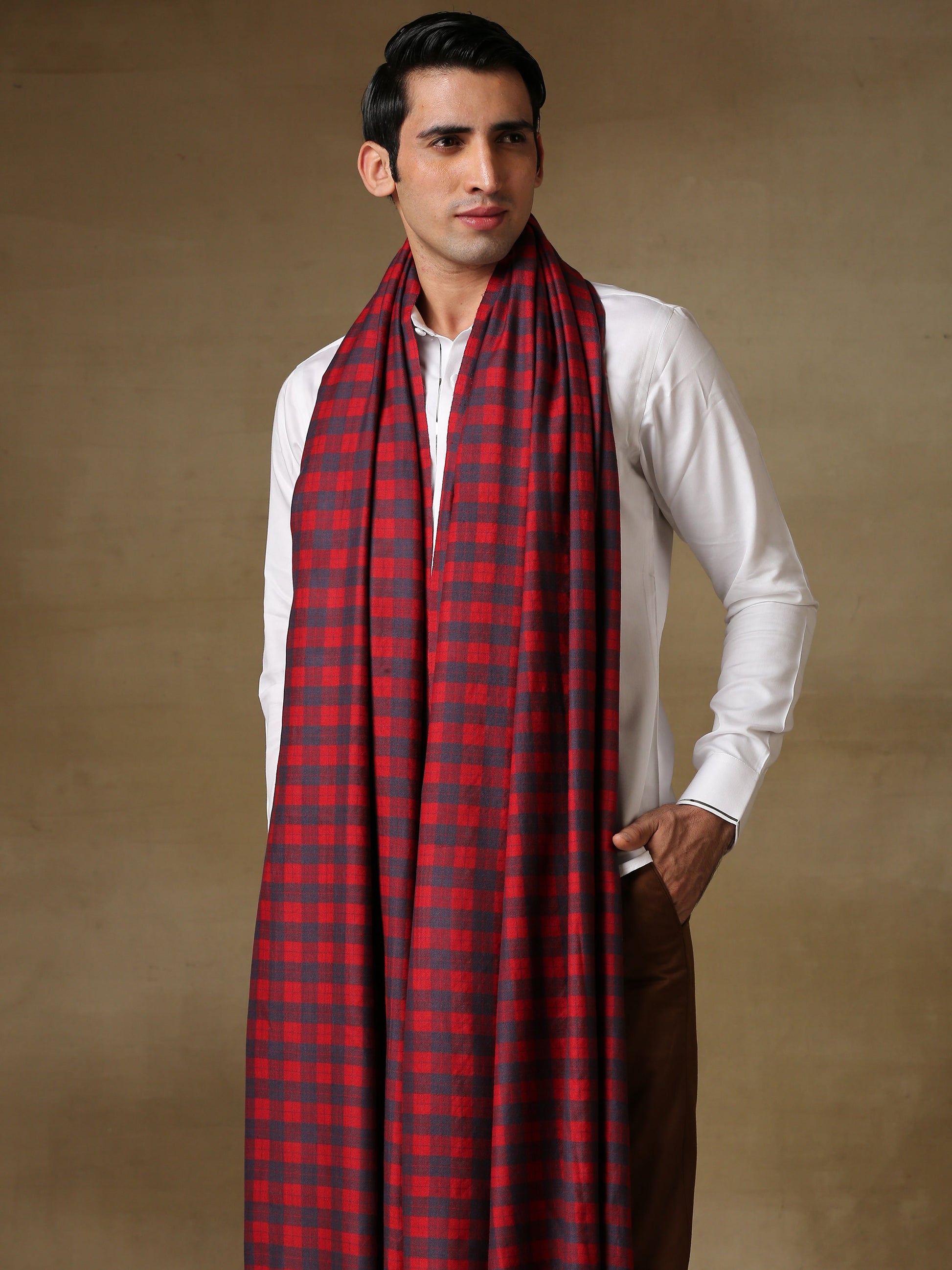 Timeless checks meet artisanal luxury in this full-sized Dushala, woven in a Burberry-inspired pattern using rich tones of blue and red. Crafted from pure handloomed Pashmina, it offers unmatched softness, warmth, and elegance — a classic wardrobe piece for the modern gentleman with an eye for heritage and style.
