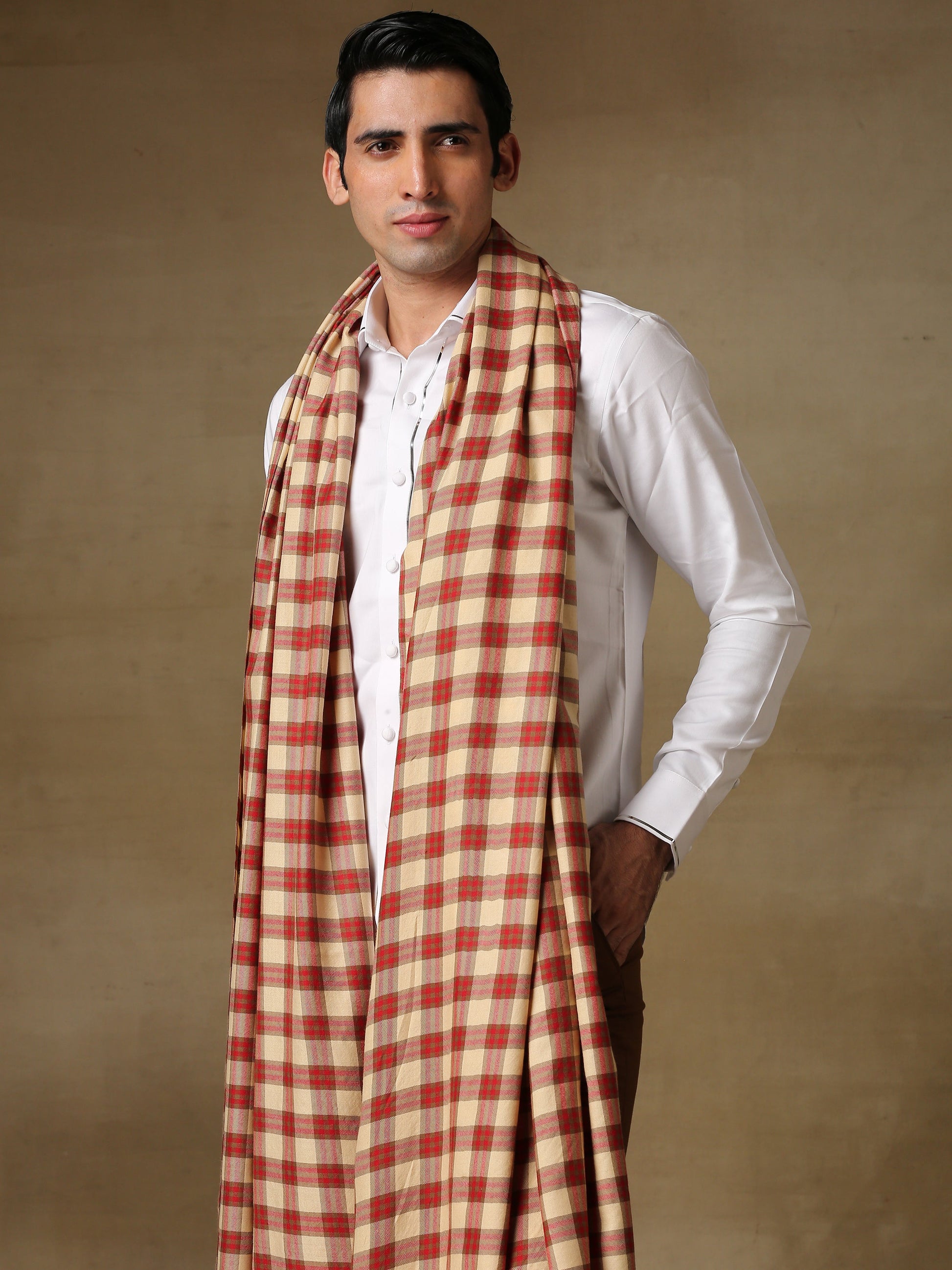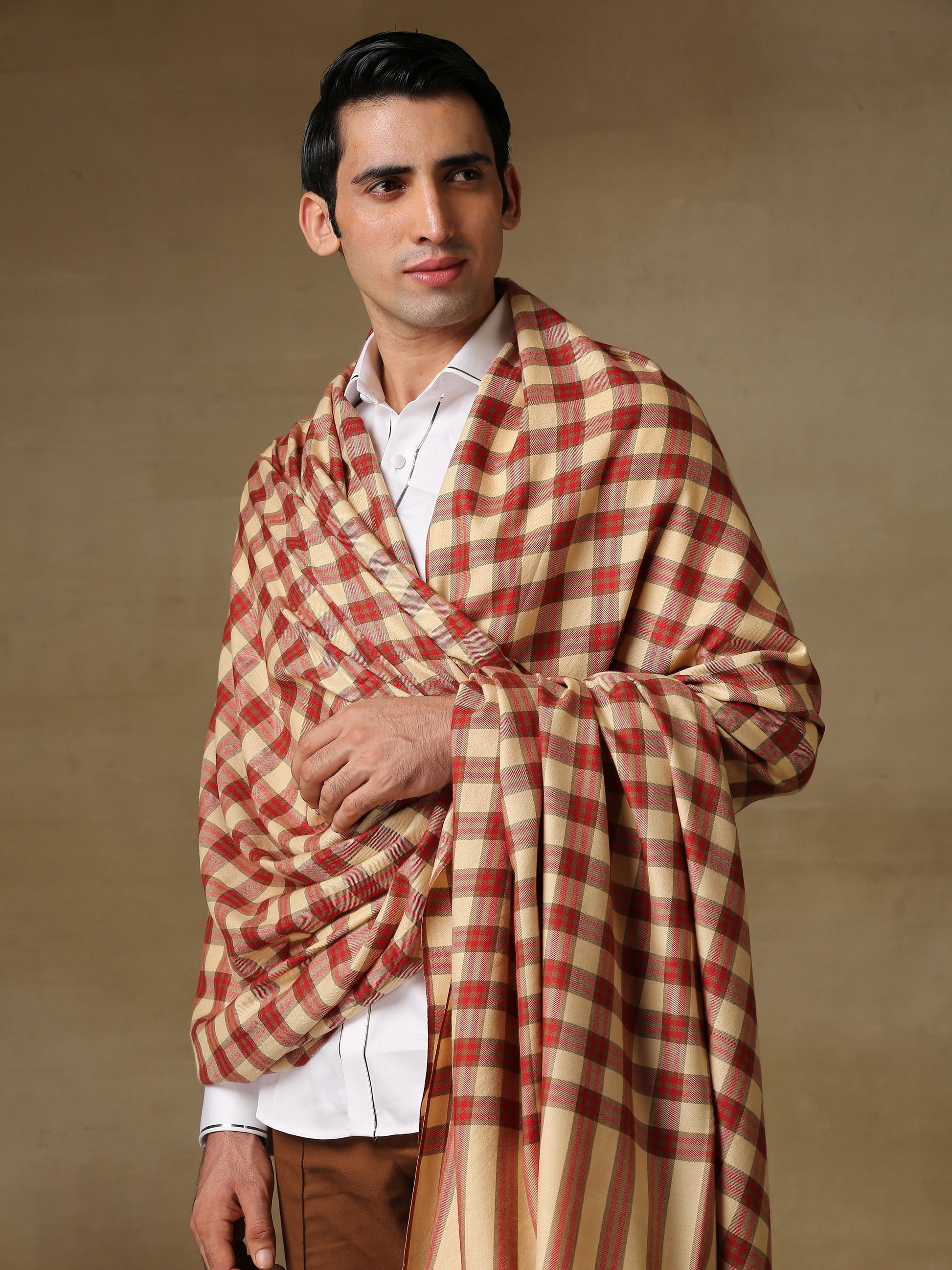 A classic statement in elegance, this full-sized Dushala features timeless check patterns in warm cream and red tones, woven on pure handloomed Pashmina. Soft, breathable, and richly textured, it’s designed for the modern man who values heritage, comfort, and style — ideal for festive wear or formal layering.