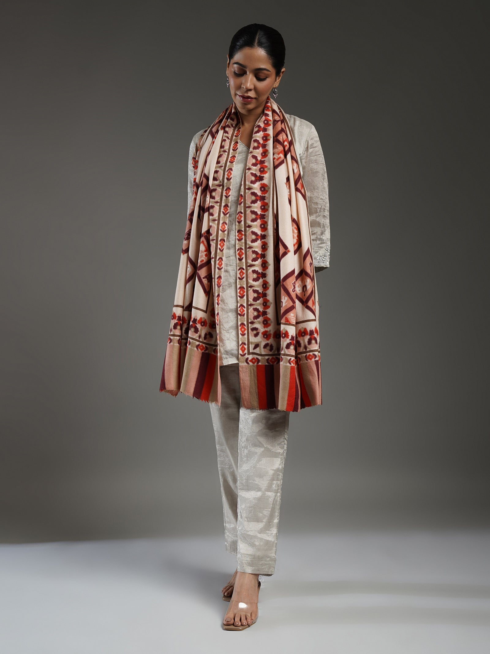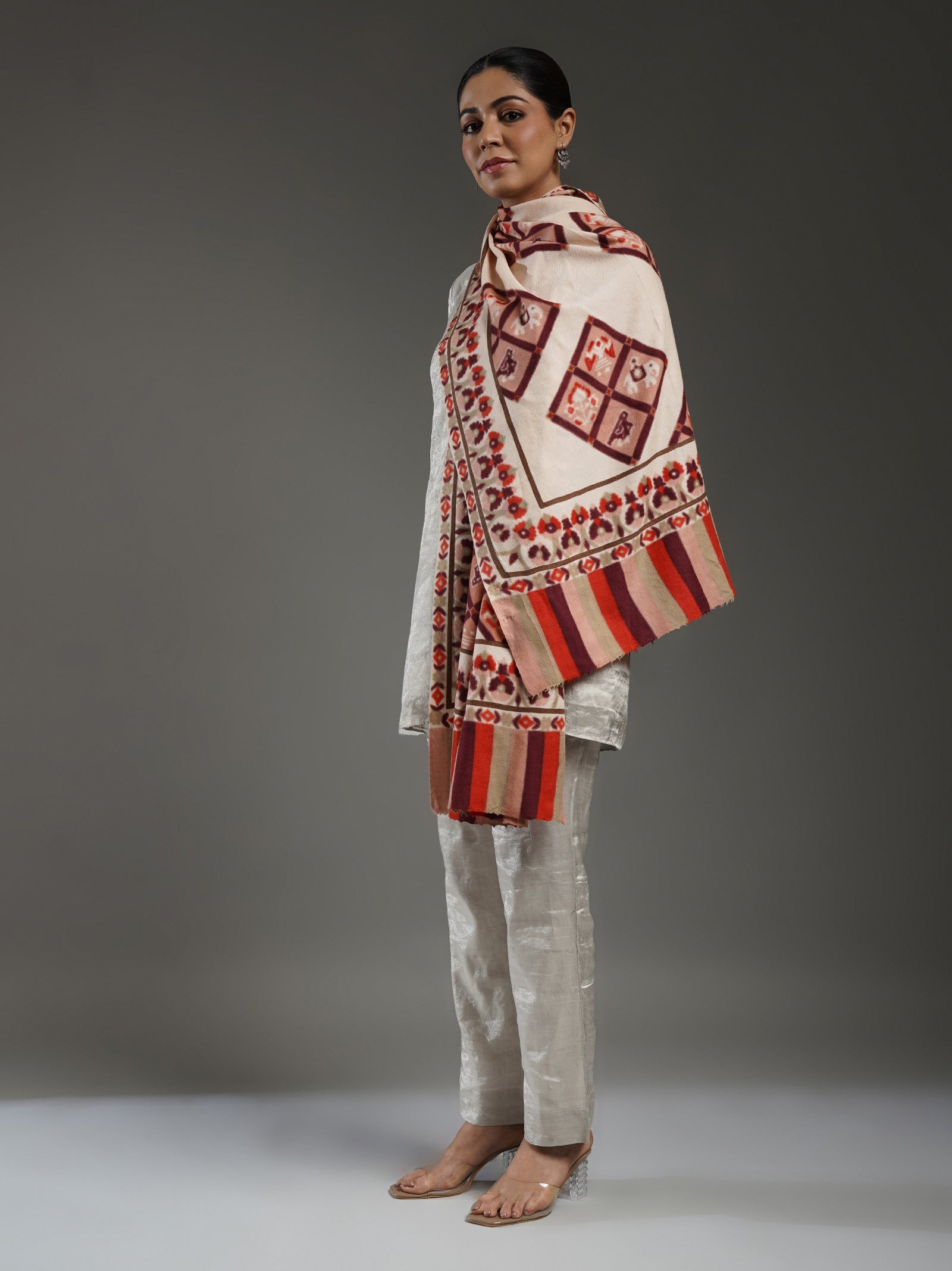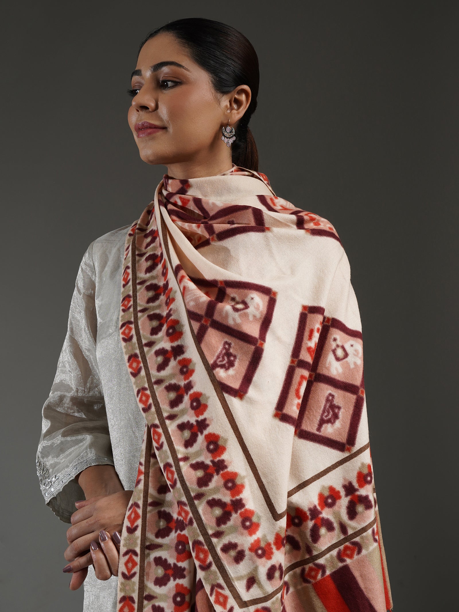 Set in a soft ivory tone, this pashmina stole is adorned with hand-painted Patola motifs in vibrant multicolours, echoing India’s timeless artistry. The borders and mehrab are delicately rendered, adding a refined frame to the design. Gentle, lightweight, and beautifully crafted, it blends the age-old tradition with a touch of modern elegance, a piece that uplifts any ensemble with sophistication..