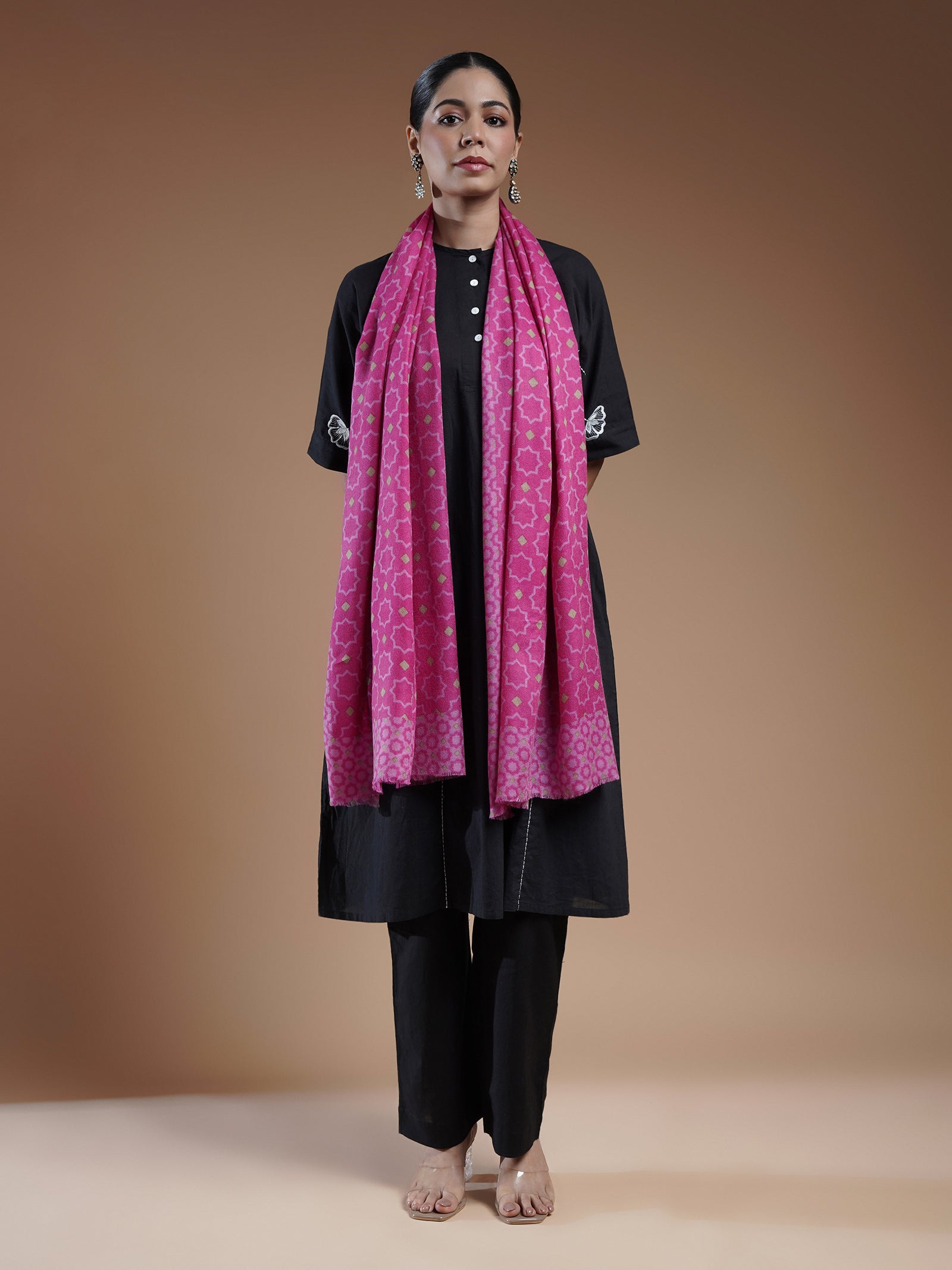 This woolen abstract stole features playful star-like motifs scattered across its surface, rendered in charming pink emphasis. The look is modern yet easygoing, light, comfortable, and perfect for quick styling and daily wear. A chic little pop of pattern that lifts any outfit with effortless flair.