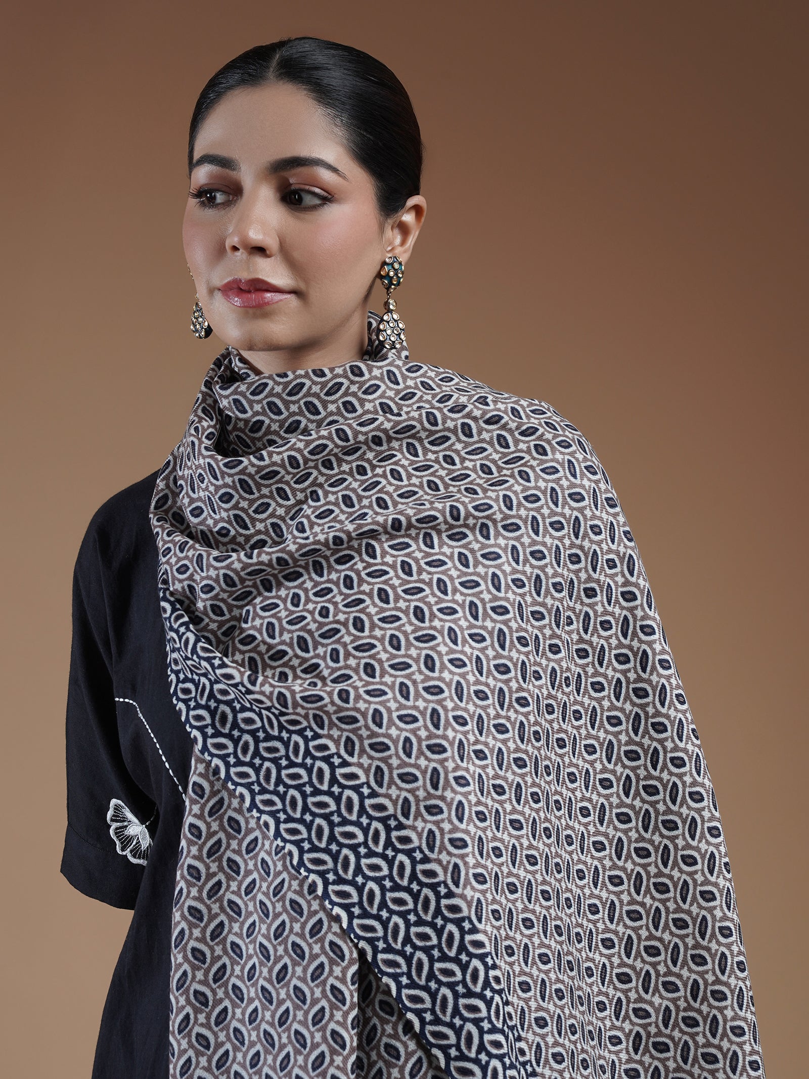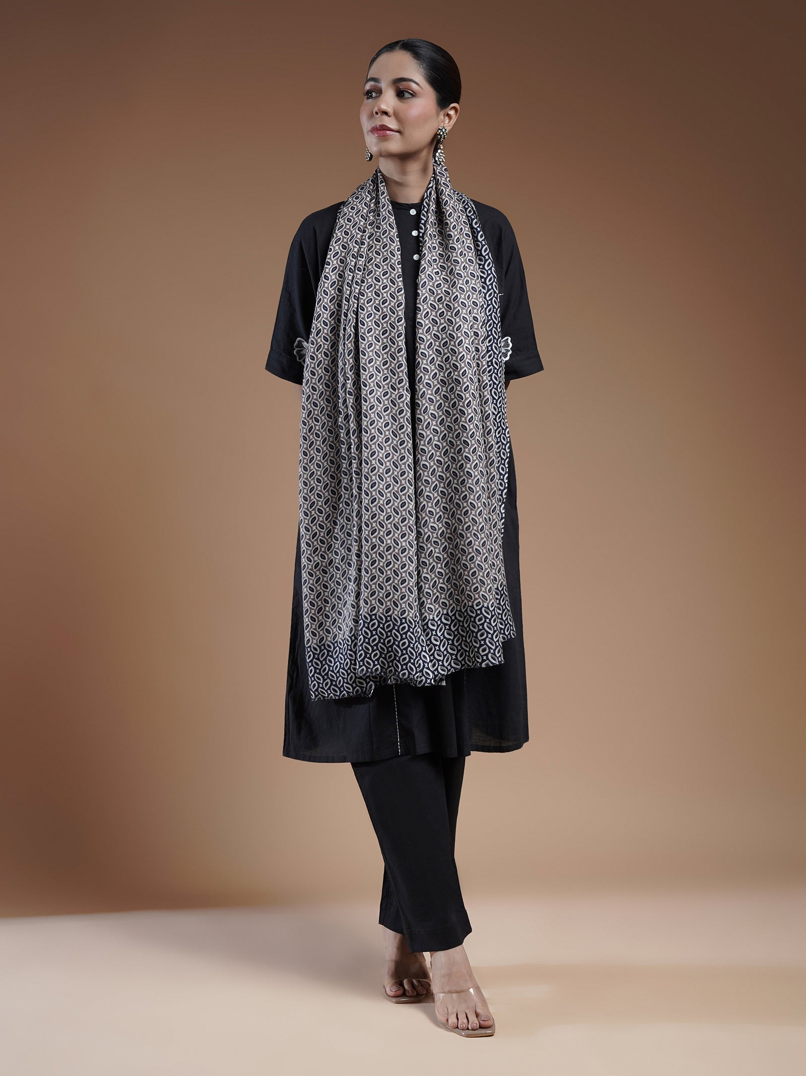 This woolen abstract stole features an enclosed dense pattern in elegant black and grey tones, creating a modern, understated statement. Its refined design makes it incredibly easy to style, comfortable, and perfect for everyday dressing or travel. An effortlessly chic piece that adds style to any look.
