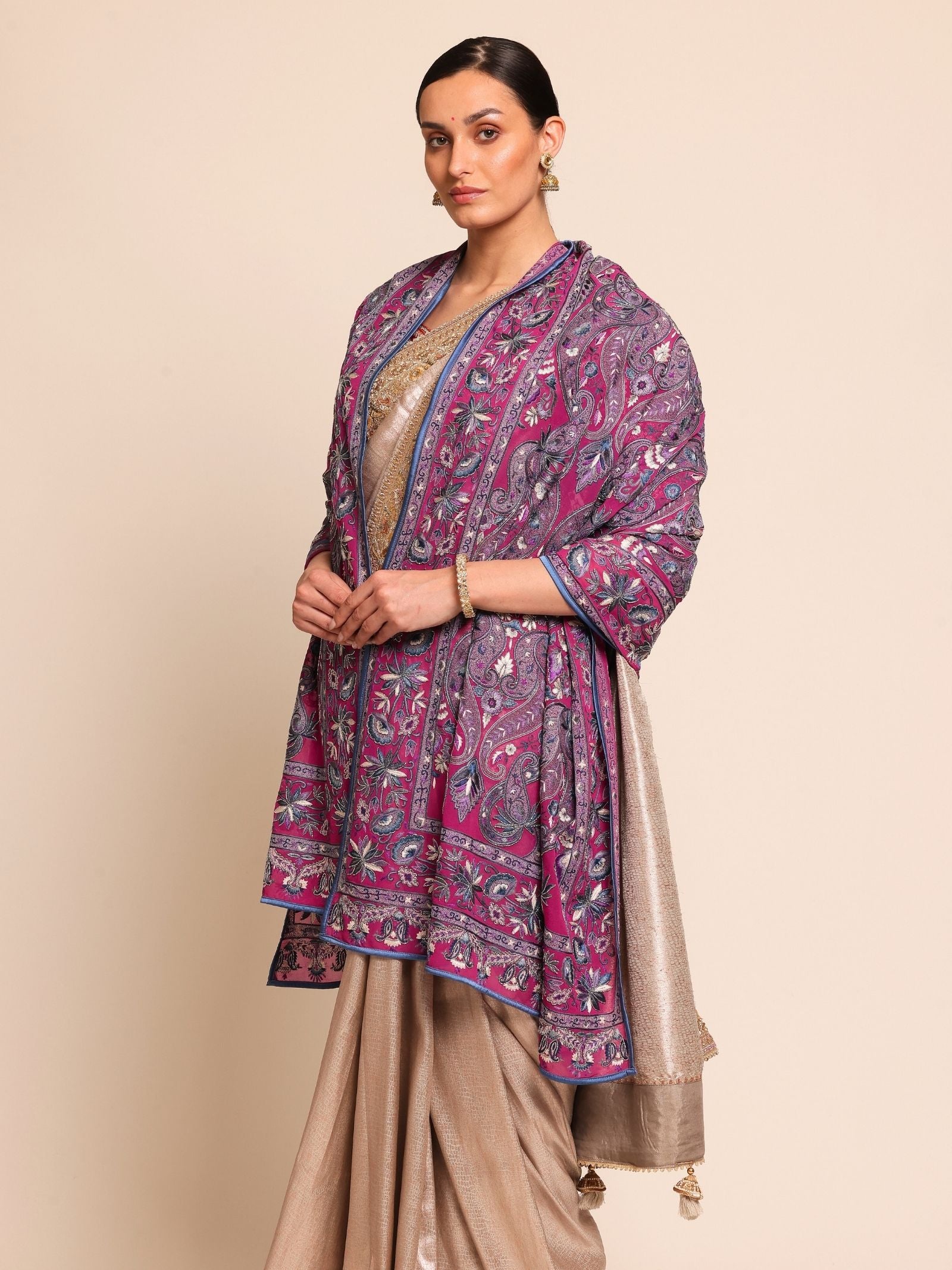 A statement in colour and craftsmanship, this high-grade georgette drape unfolds over a lively dark pink base, enriched with a striking interplay of purple and blue. Intricate floral and ambi motifs flow seamlessly across the surface, framed by detailed borders that are brought to life with fine hand-embroidery and delicate katdana work. Light, fluid, and beautifully expressive, it carries a sense of occasion with every drape, crafted for moments that call for something truly special.