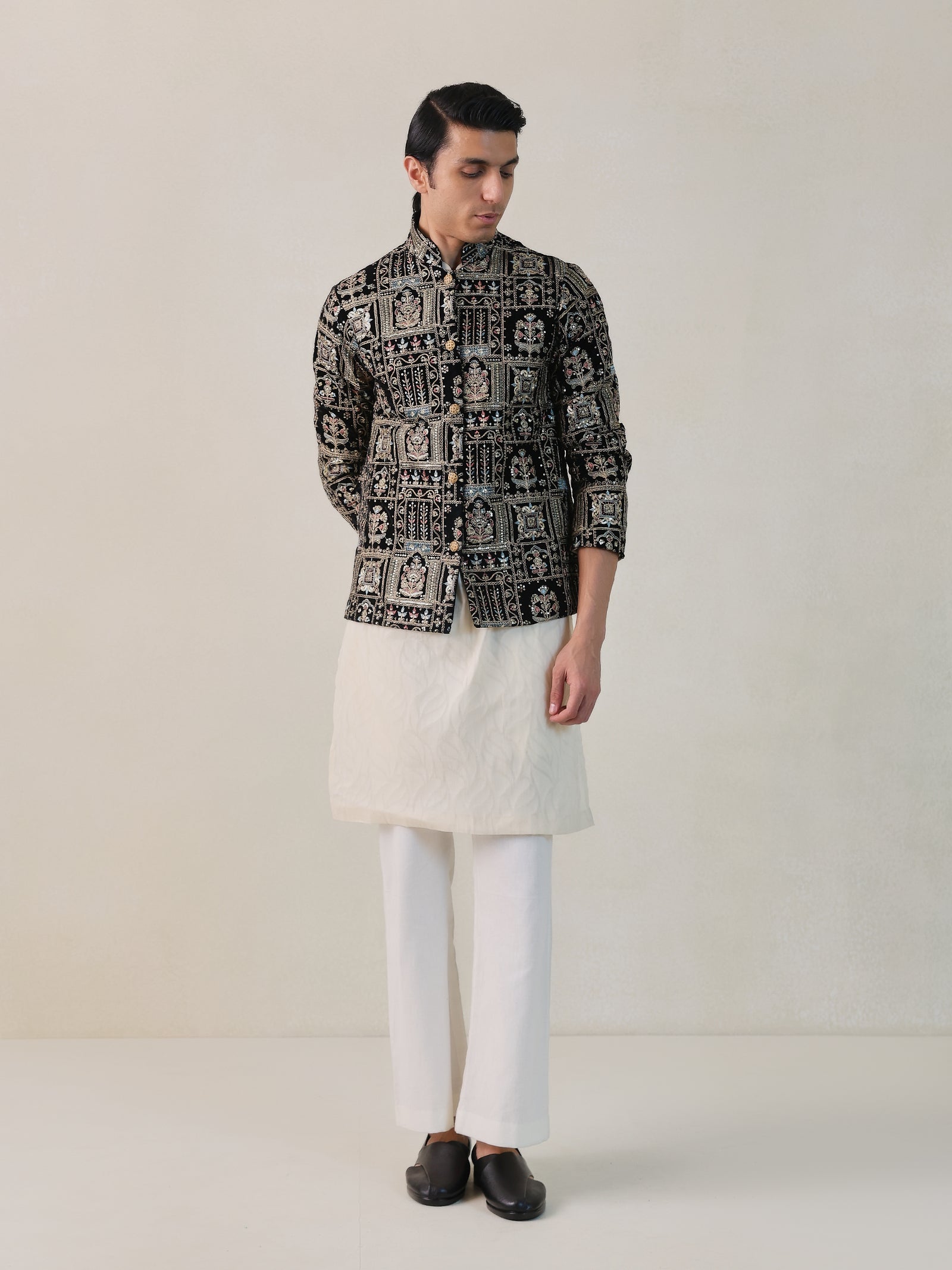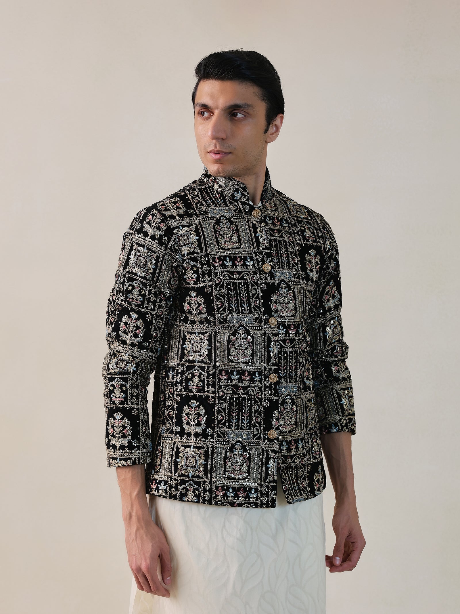The Fares Bandhgala Jacket in classic black exudes elegance with intricate multicolour Resham, zari, and sequin embroidery. Crafted in velvet featuring a Mughal jaali pattern and floral motifs, along with a mandarin collar, this jacket is the perfect style statement for special occasions and evening gatherings.