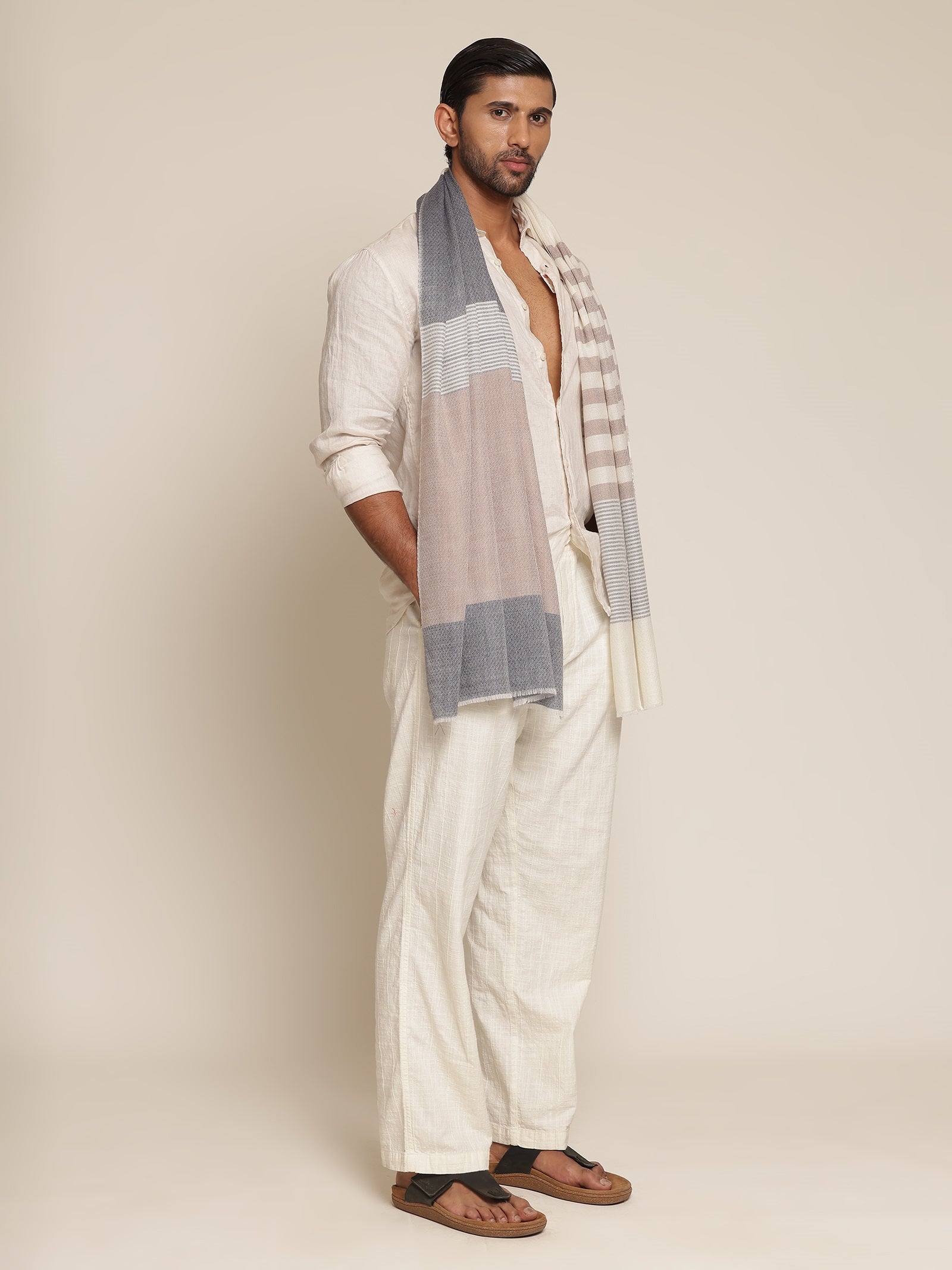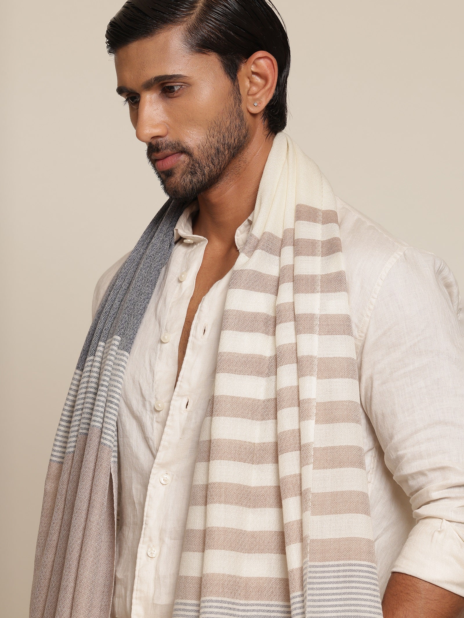 A soft mix of colours defines this woollen stole, where colour blocking meets thoughtfully placed stripes to create a striking, well-balanced design. The arrangement of tones creates a sense of movement, giving the piece a fresh, stylish presence. Comfortable to wear and easy to style, it drapes naturally and works across different settings. A versatile stole that adds vibrancy and a contemporary edge to your ensemble.