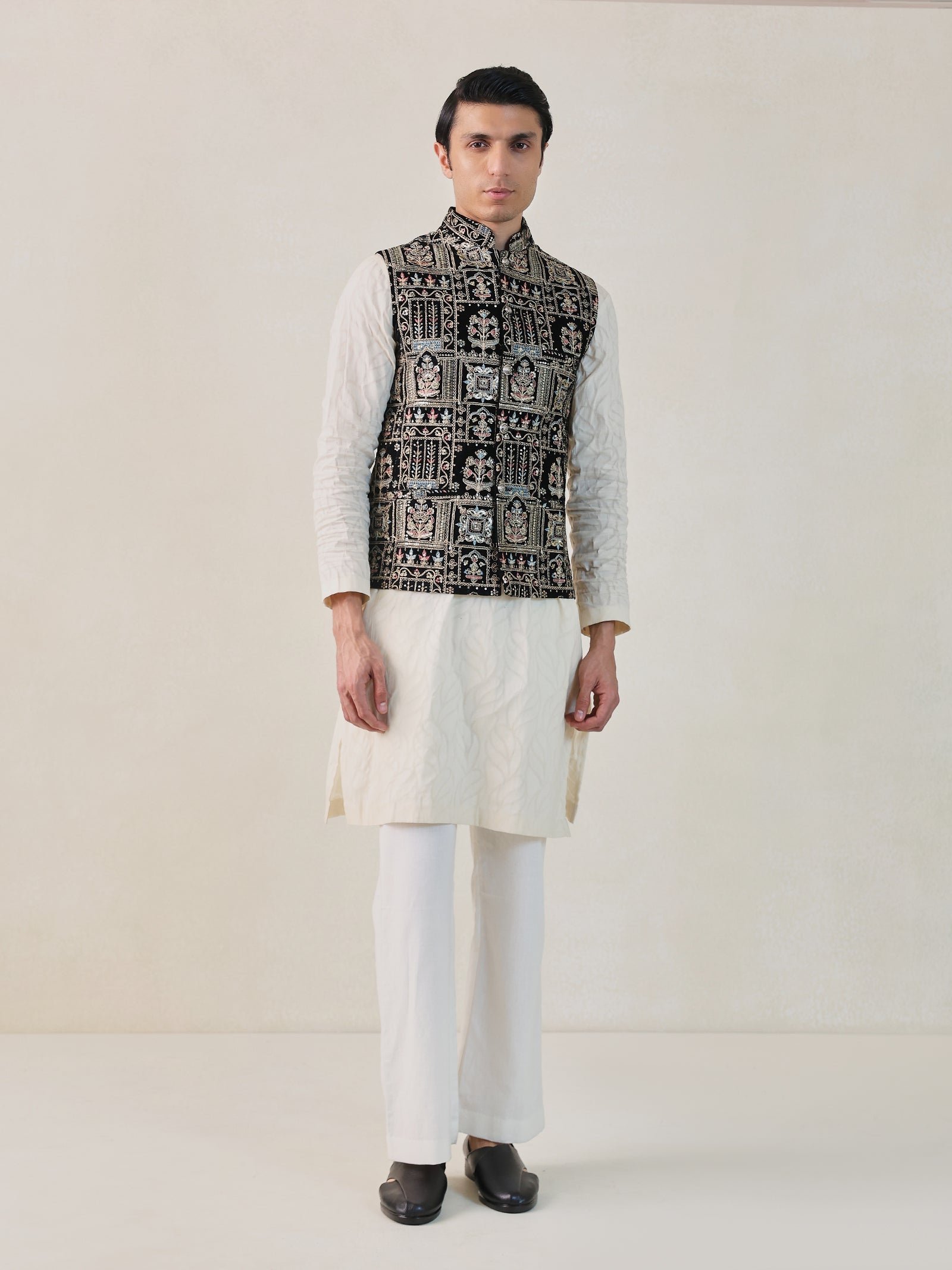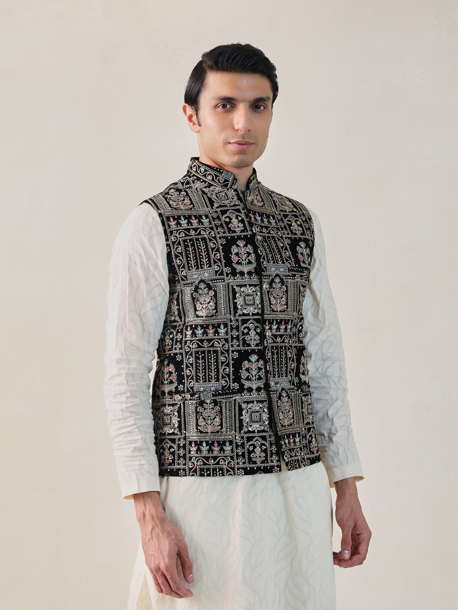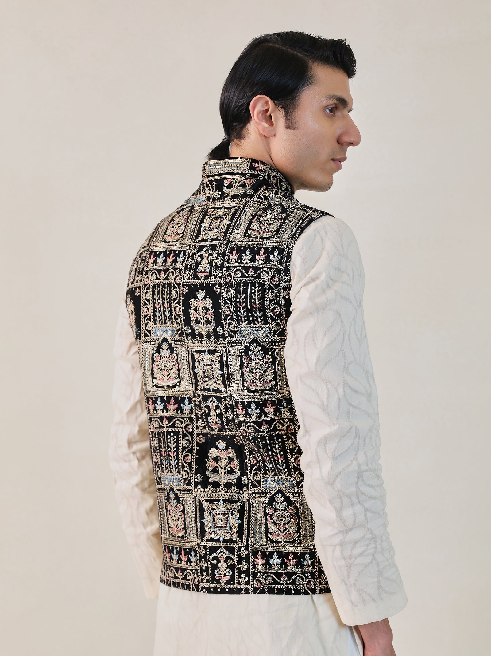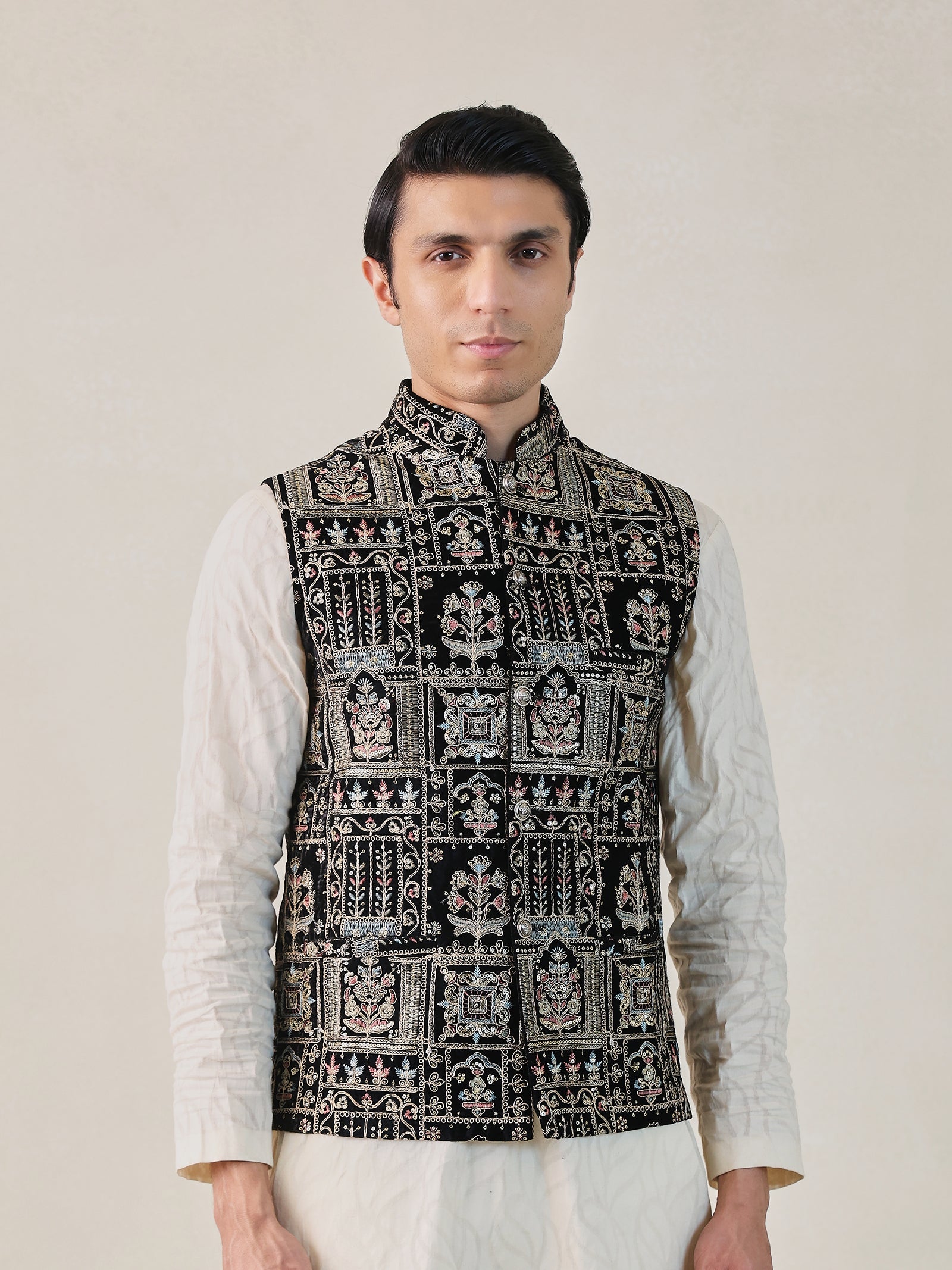 The Men's Velvet Waistcoat in black boasts exquisite multicolor Resham, zari, and sequin embroidery in a Mughal Jaali pattern, featuring intricate floral and paisley motifs. With its mandarin collar and rich design, this waistcoat makes a bold style statement, perfect for special occasions or ceremonial gatherings