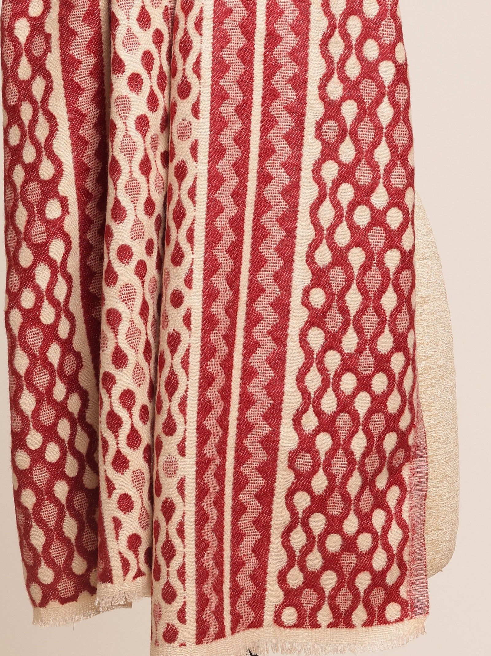 Crafted from fine-count wool, this red muffler features an abstract weave that moves away from the ordinary, offering a more artistic and free-flowing design. Smooth in feel and naturally warm, it wraps with ease and settles into both daily routines and journeys without effort.
