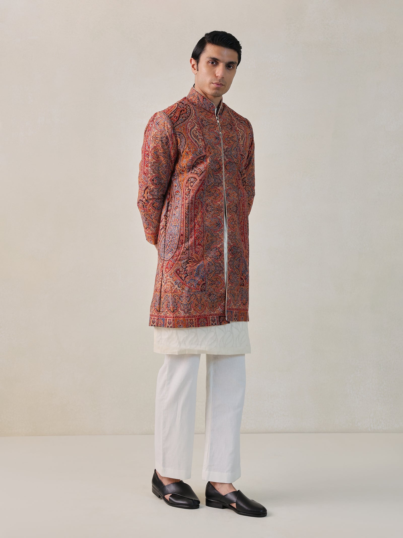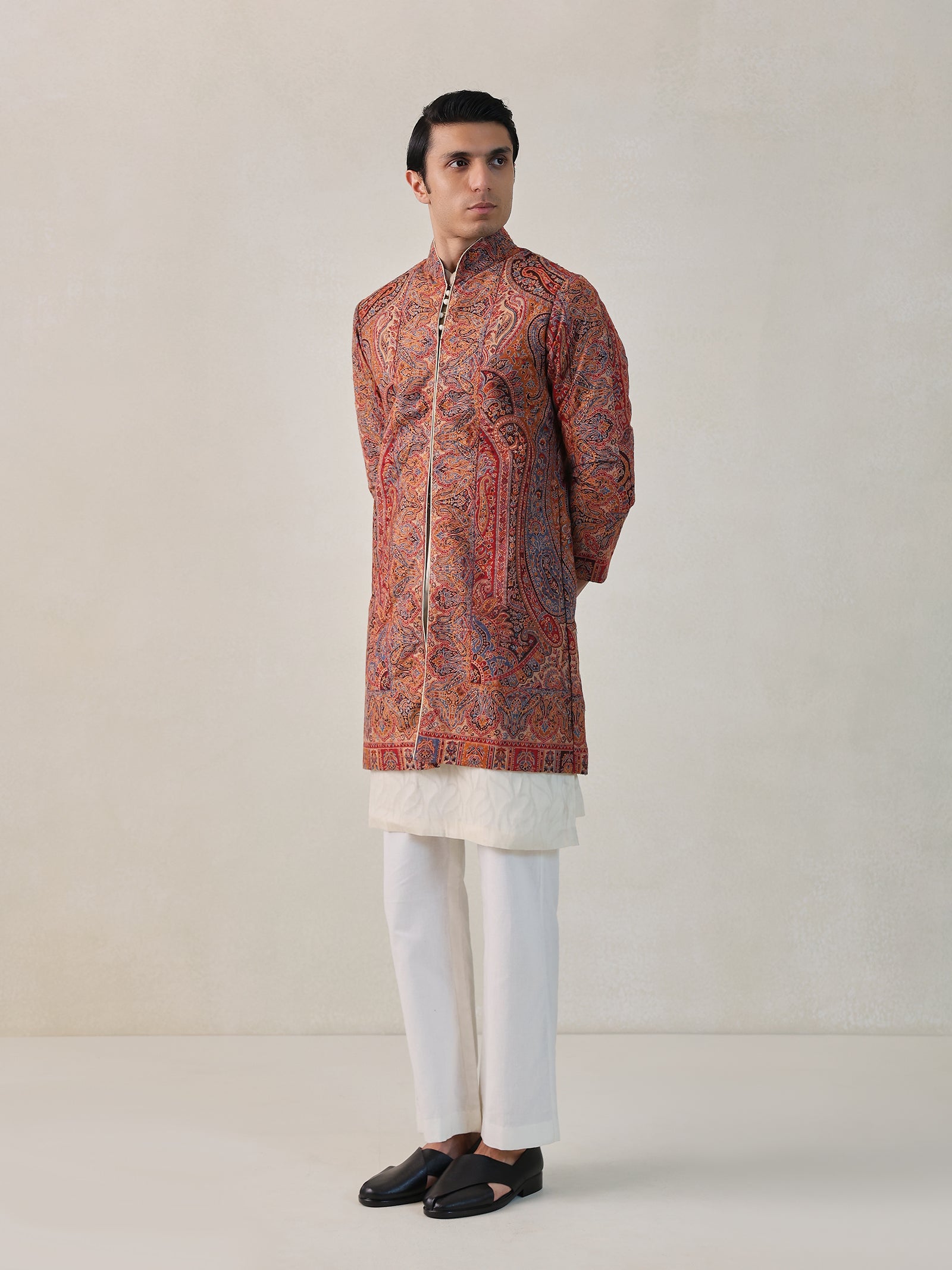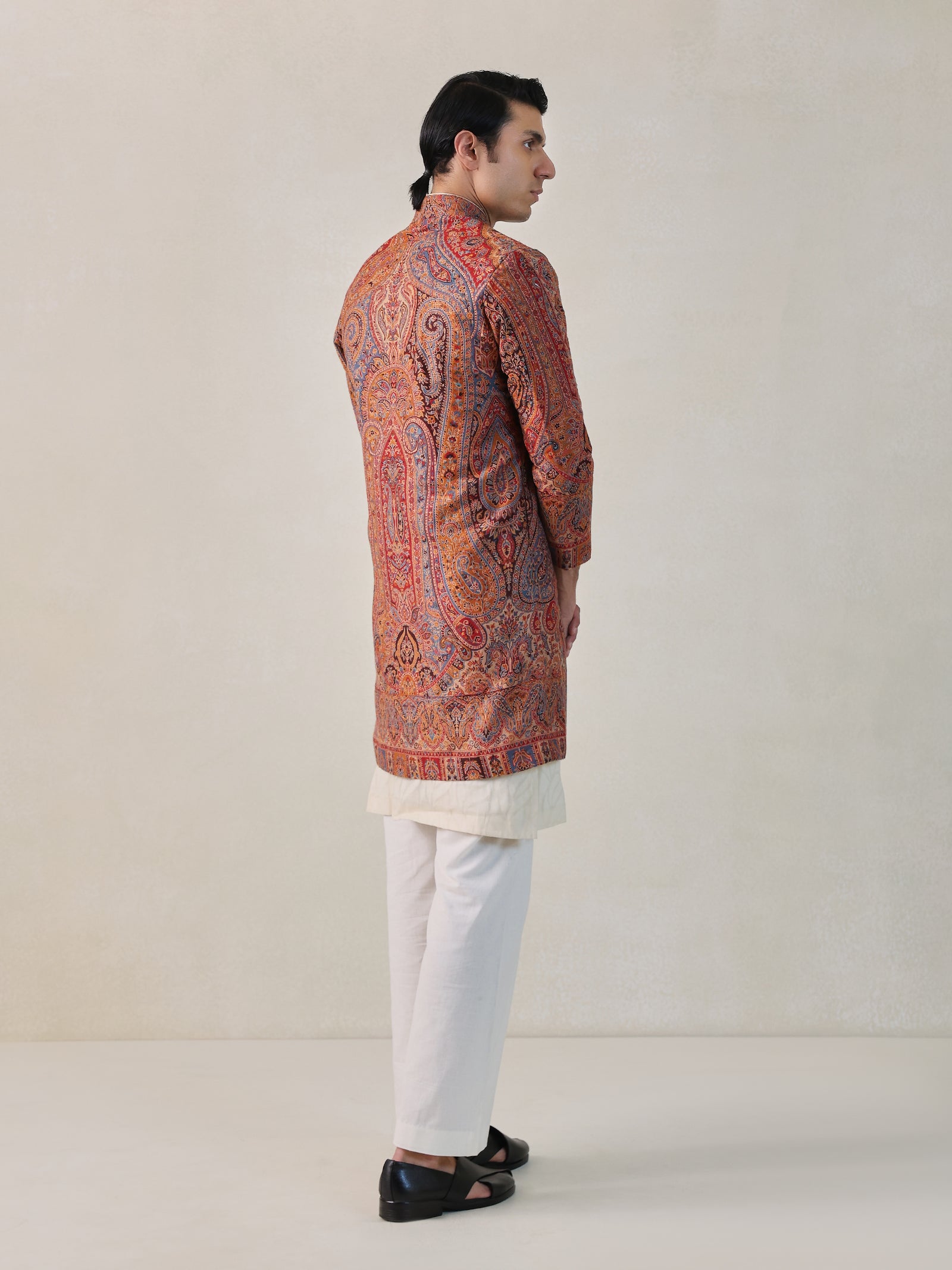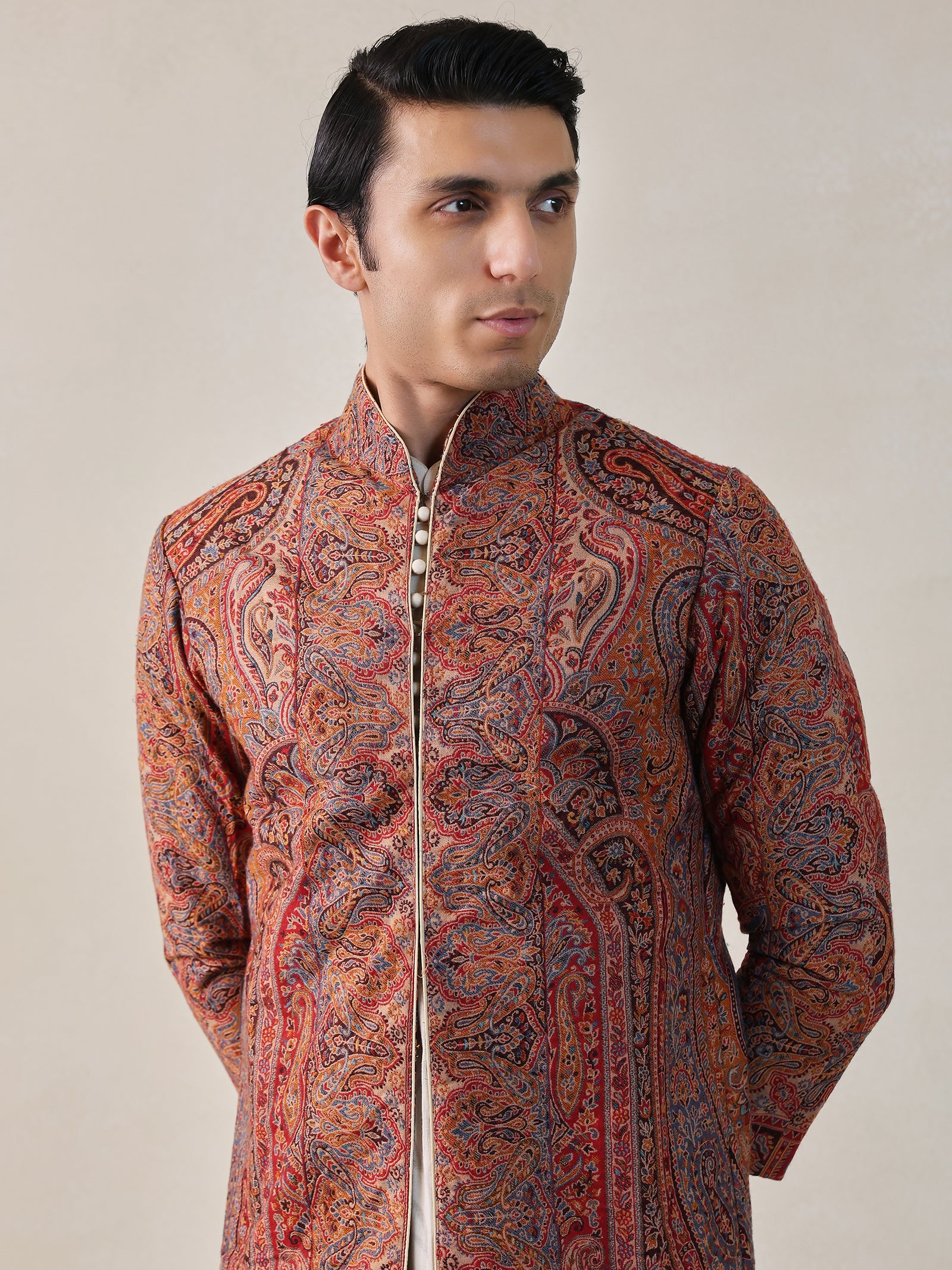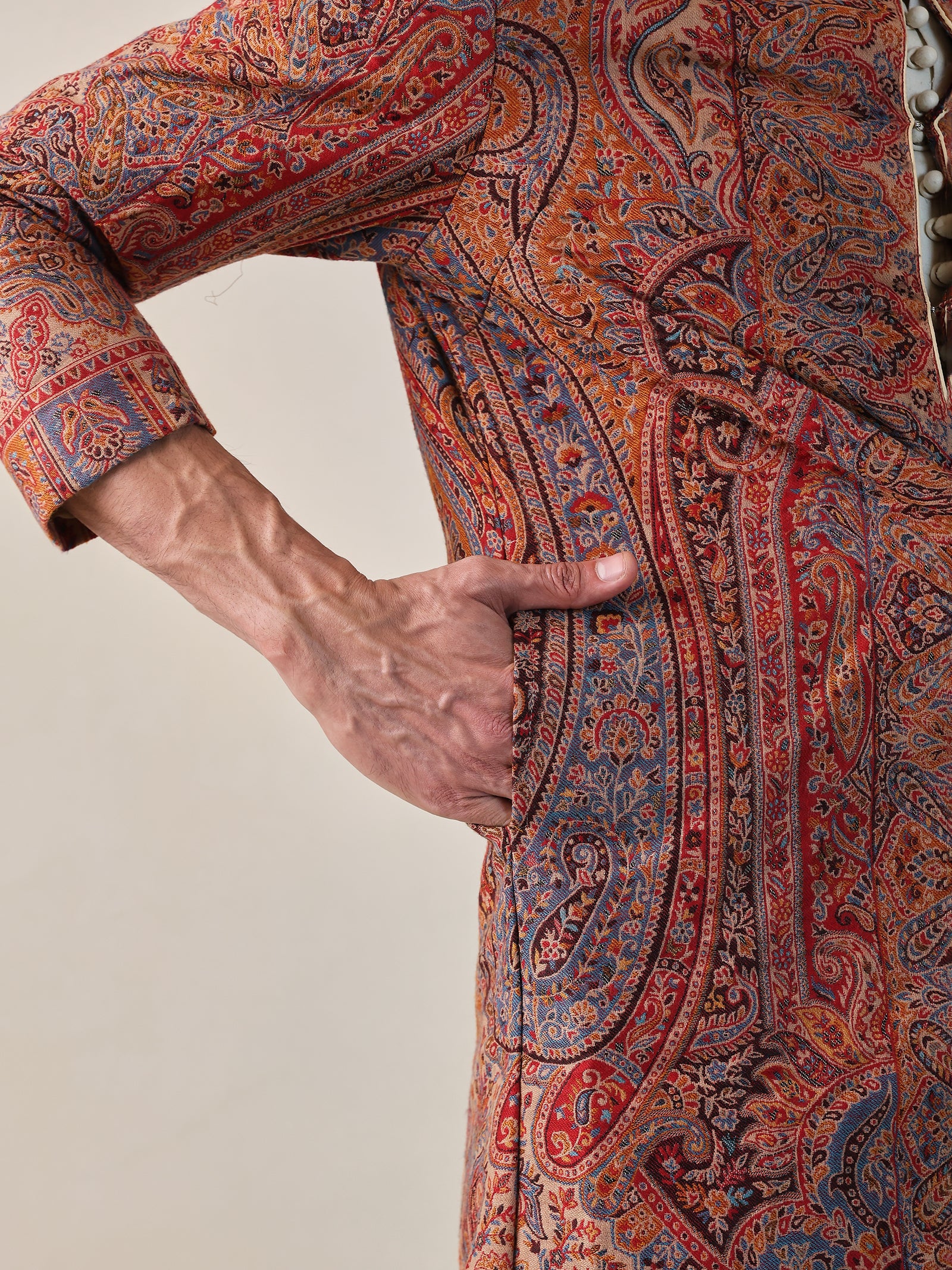 Men's Long Woolen Jacket combines timeless craftsmanship with style. Featuring a dense multicolour Kani pattern, this jacket offers both comfort and style, perfect for those who value tradition and morden fashion.