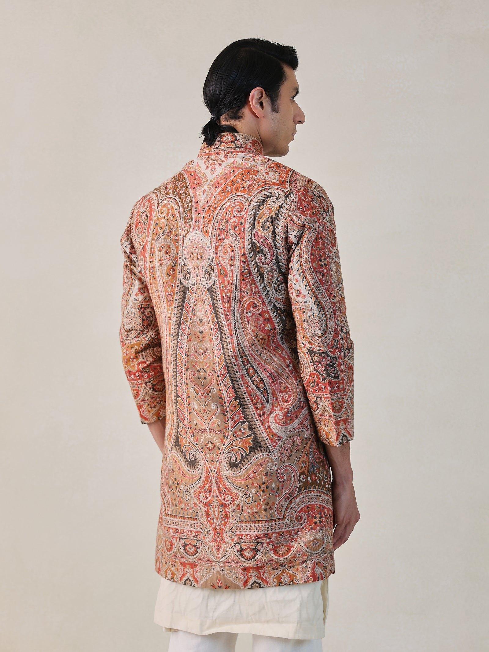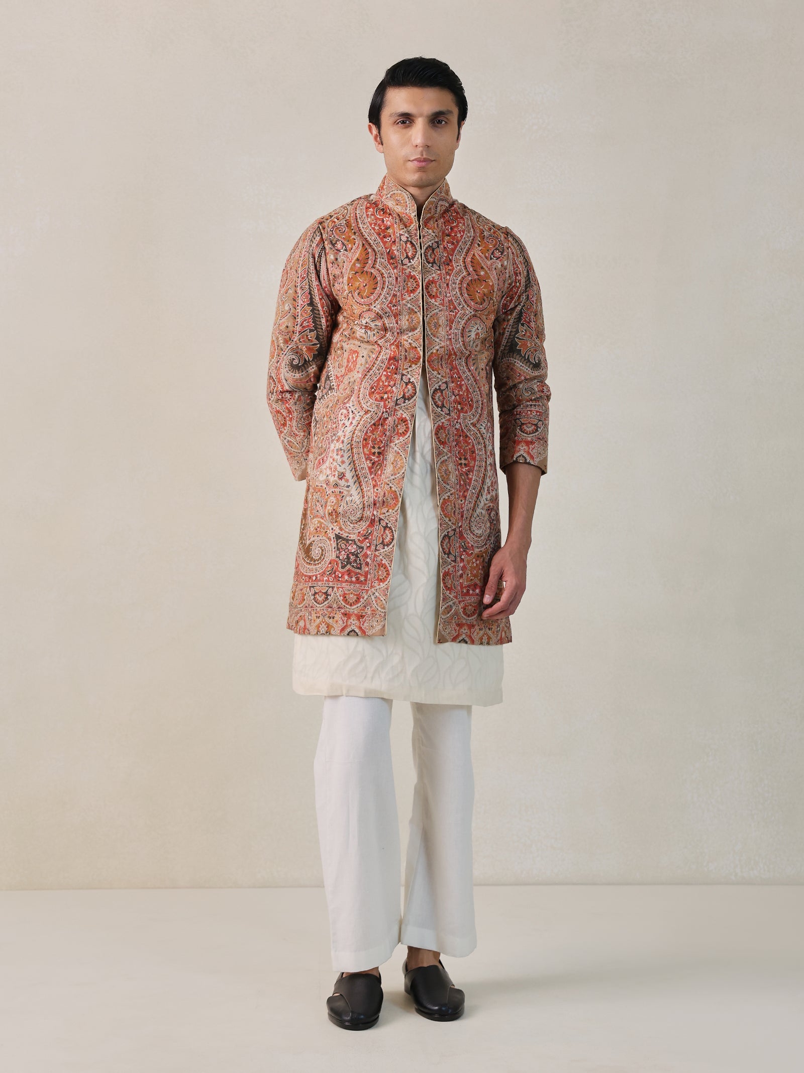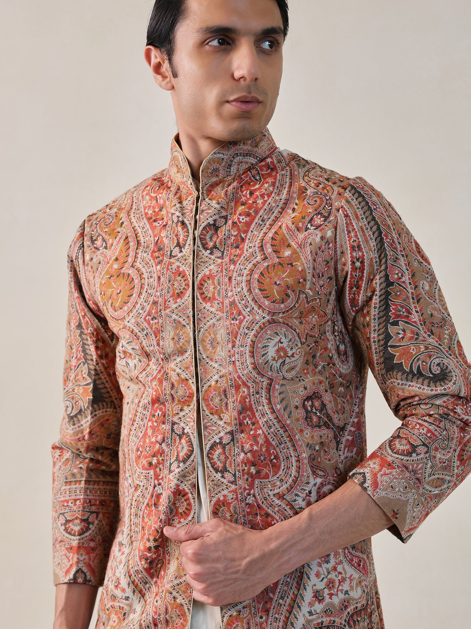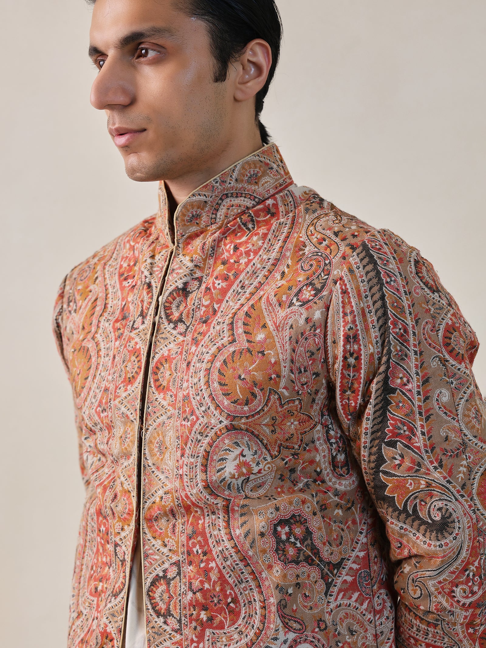 The Men's Long Woolen Jacket showcases an intricate multicolor Kani pattern. Designed for warmth and style, this comfortable jacket is a statement piece, ideal for elevating one’s winter wardrobe.